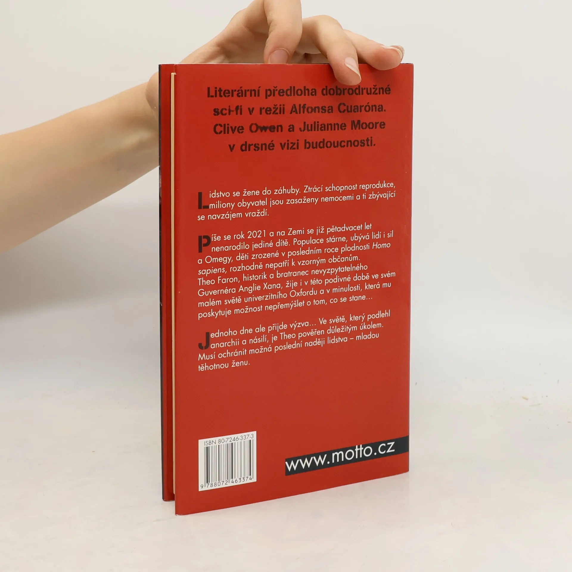 Lidstvo se žene do záhuby. Ztrácí schopnost reprodukce, miliony obyvatel jsou zasaženy nemocemi a ti zbývající se navzájem vraždí Píše se rok 2021 a na Zemi se již pětadvacet let nenarodilo jediné dítě. Populace stárne, ubývá lidí i sil a Omegy, děti zrozené v posledním roce plodnosti Homo sapiens, rozhodně nepatří k vzorným občanům. Po celém světě se snaží vlády udržet pořádek a relativně klidný průběh zániku lidstva. O to má největší zájem Rada Anglie v čele s nevyzpytatelným Guvernérem Xanem. Však co se skrývá pod touto optimistickou maskou? Vypravěčem celého příběhu a hlavním protagonistou je Xanemův bratranec Theo Faron, historik žijící i v této podivné době ve svém malém světě univerzitního Oxfordu a v minulosti, která mu poskytuje možnost nepřemýšlet o tom, co se stane… Jednoho dne ale přijde výzva… Ve světě, který podlehl anarchii a násilí, je Theo pověřen důležitým úkolem. Musí ochránit možná poslední naději lidstva – mladou těhotnou ženu. Tato kniha se stala předlohou pro stejnojmenný film, jehož režisérem je Mexičan Alfonso Cuarón, autor např. Malé princezny nebo úspěšného Harryho Pottera a vězně z Azkabanu. Premiéru filmu bude moci shlédnout v našich kinech již na počátku listopadu.