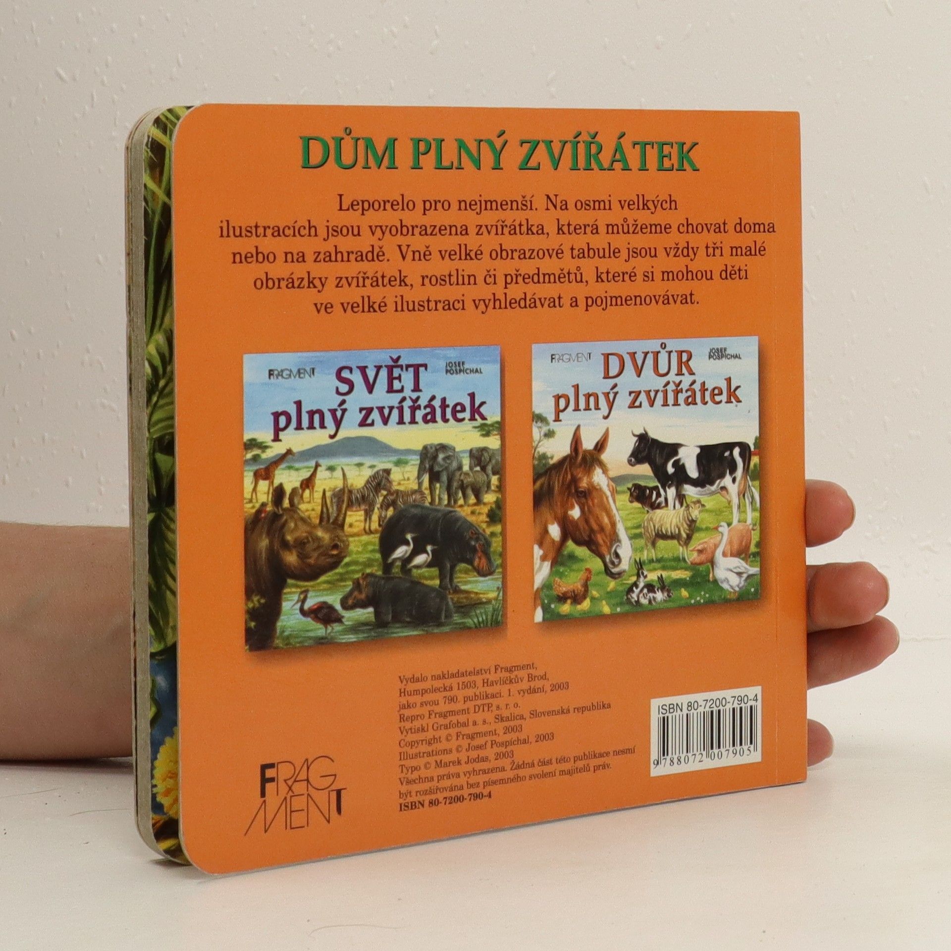 Leporelo pro nejmenší. Na osmi velkých ilustracích jsou vyobrazena zvířátka, která můžeme chovat doma nebo na zahradě - pejskové, papoušci, rybičky, kočičky, kanárci, křečci, želvičky, králíčci. Vně velké obrazové tabule jsou vždy tři malé obrázky zvířátek, rostlin či předmětů, které si mohou děti ve velké ilustraci vyhledávat a pojmenovávat.
