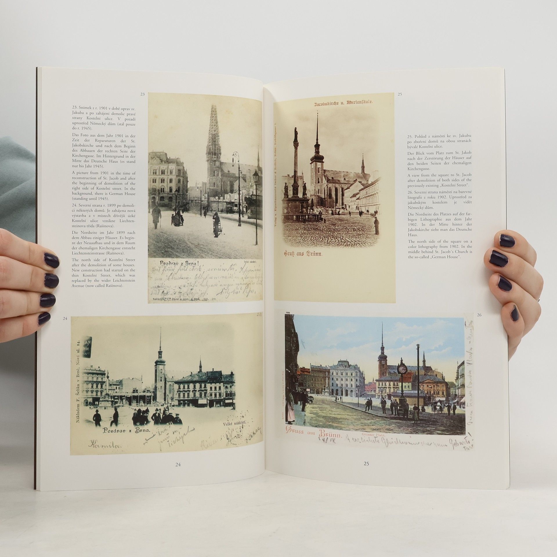 V knížce se Vám představí historické brněnské pohlednice (Náměstí Svobody, Masarykova, hlavní nádraží, ulice Nádražní, Bašty, Benešova). Jedná se o publikaci především obrazovou, veškeré texty jsou omezeny jen na nezbytné minimum v jazyce českém, německém a anglickém.