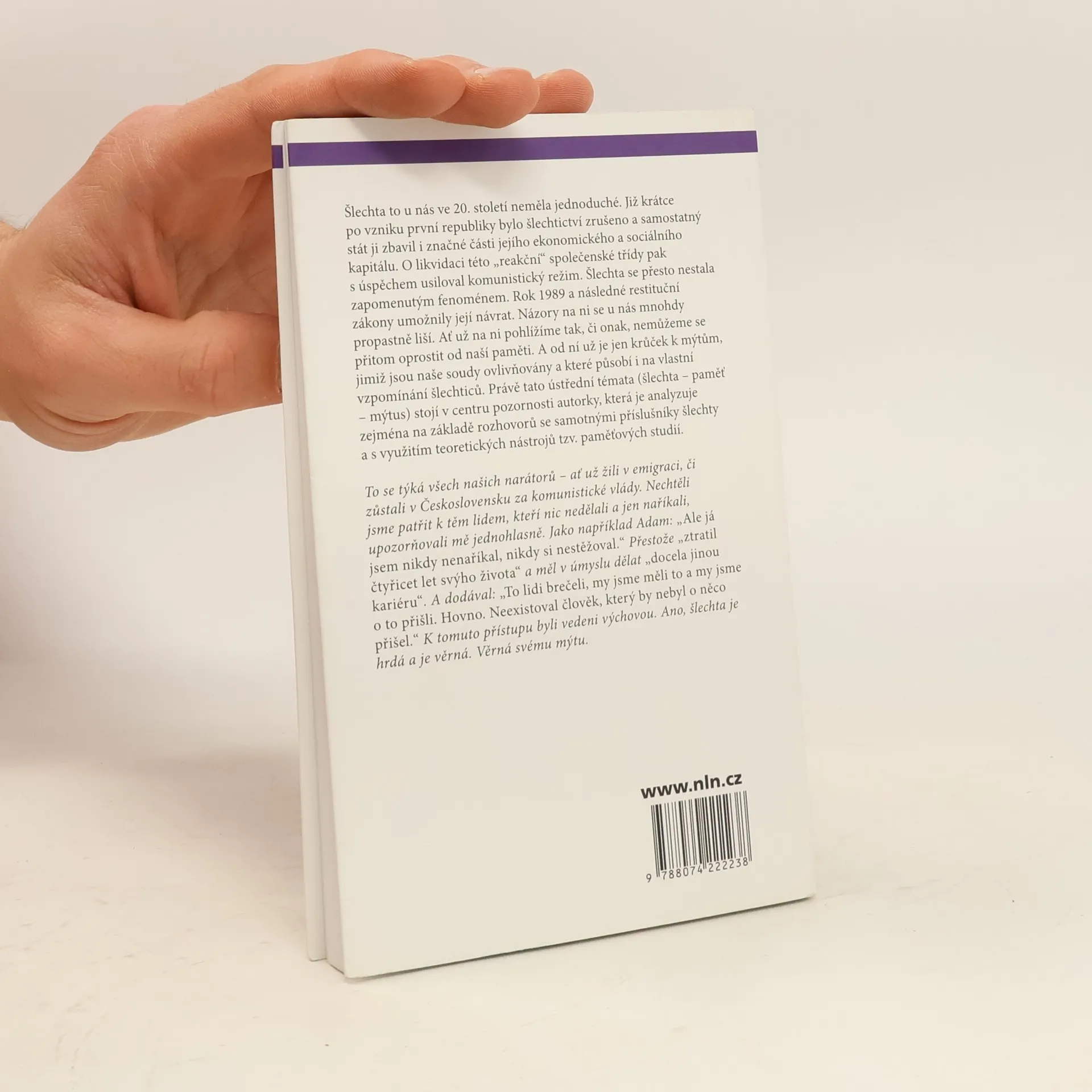 Podtitul: Paměť a šlechta dvacátého století Názory na šlechtu se u nás mnohdy propastně liší. První republika zrušila šlechtictví a tím ji zbavila i značné části jejího ekonomického a sociálního kapitálu. O likvidaci této „reakční“ společenské třídy pak s úspěchem usiloval komunistický režim. Šlechta se přesto nestala zapomenutým fenoménem. Rok 1989 a následné restituční zákony umožnily její návrat. Ať už na šlechtu pohlížíme jakkoli, nemůžeme se oprostit od naší paměti. A od ní už je jen krůček k mýtům, jimiž jsou naše soudy ovlivňovány a které působí i na vlastní vzpomínání šlechticů. Právě tato ústřední témata (šlechta – paměť – mýtus) stojí v centru pozornosti autorky, která je analyzuje zejména na základě rozhovorů se samotnými příslušníky šlechty a s využitím teoretických nástrojů tzv. paměťových studií.