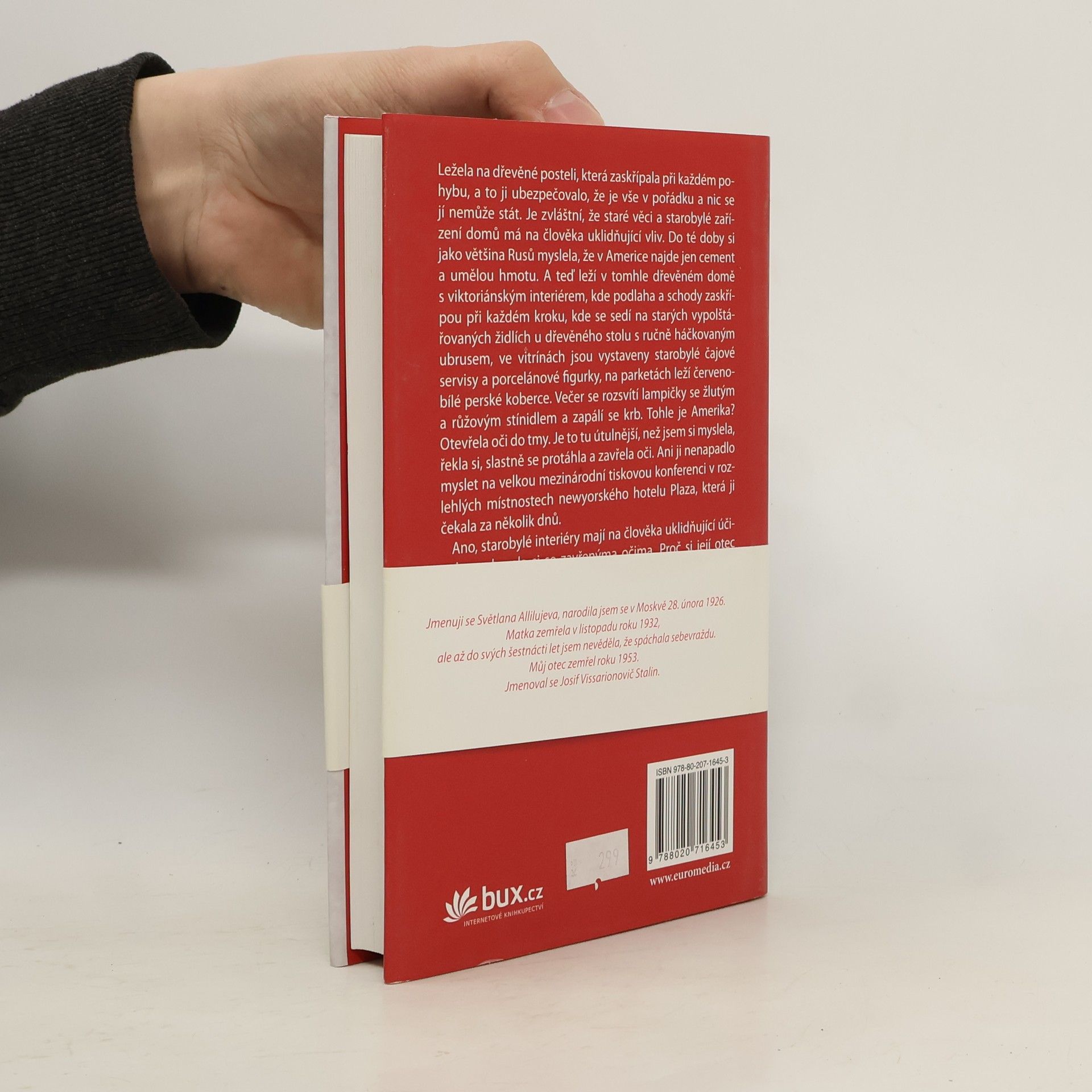Mé jméno je Světlana Allilujevová. Narodila jsem se 28. února 1926. Můj otec zemřel roku 1953. Jmenoval se Josif Stalin. Jediná dcera sovětského diktátora měla až neuvěřitelný osud. V šestnácti se zamilovala do židovského lékaře, kterého její otec poslal do gulagu. Roku 1963 se vášnivě zamilovala do indického komunisty, a když si po jeho smrti prosadila, že s jeho popelem odjede do Indie, požádala na ambasádě USA o politický azyl. V Americe zbohatla na své slavné knize Dvacet dopisů příteli, o všechno ji ale obrala náboženská sekta. Musela se skrývat nejen v USA, ale i v Eropě. Zemřela roku 2011 ve Wisconsinu. Biografický román Moniky Zgustové je originální, napínavý a plný zvratů.