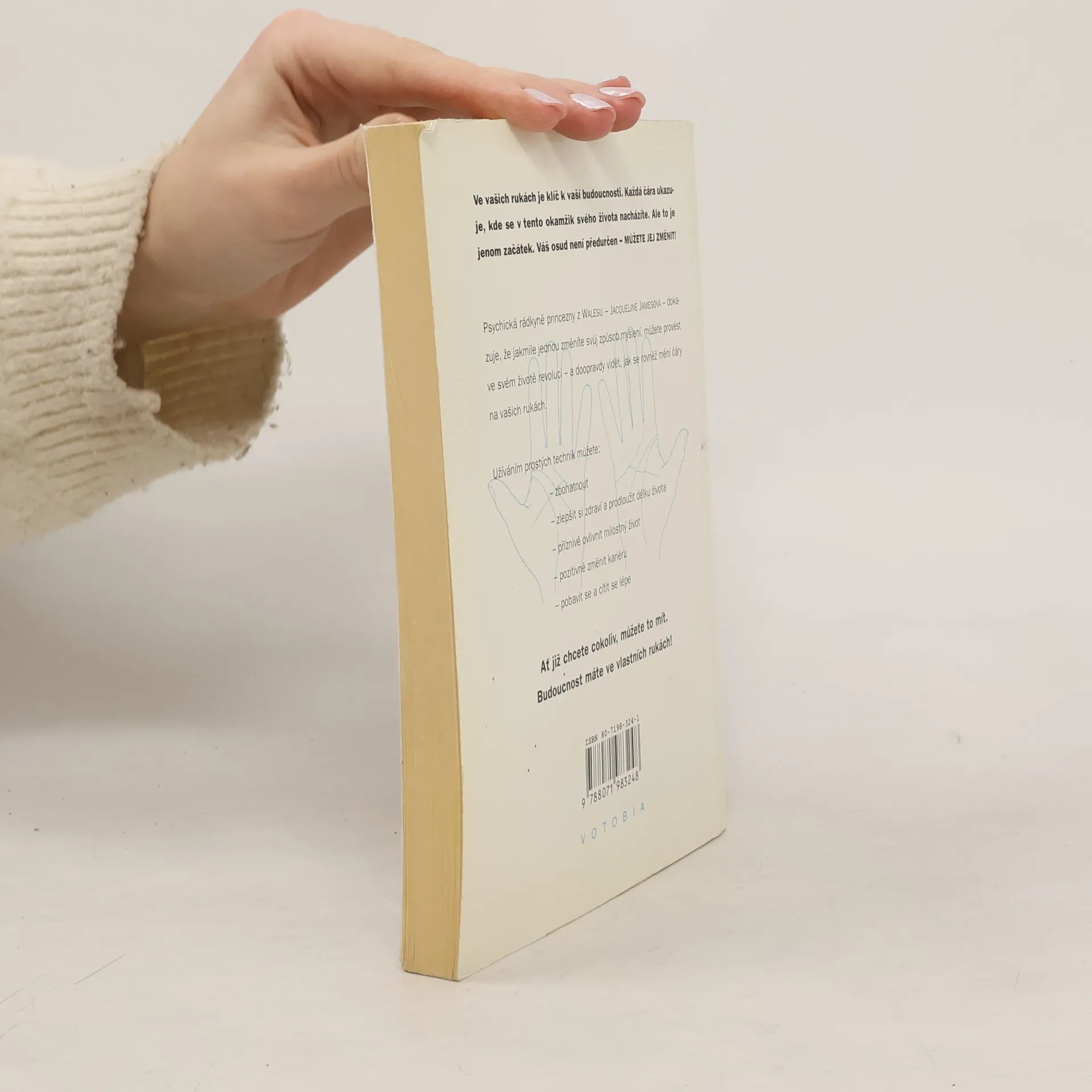Převezměte kontrolu nad svým životem Ve vašich rukách je klíč k vaší budoucnosti. Každá čára ukazuje, kde se v tento okamžik svého života nacházíte. Váš osud není předurčen - můžete jej změnit! Jakmile jednou změníte způsob myšlení, můžete provést ve svém životě revoluci. Ať již chcete cokoliv, můžete to mít! Můžete zbohatnout, zlpešit si zdraví, prodloužit život, pozitivně změnit kariéru i milostný život.