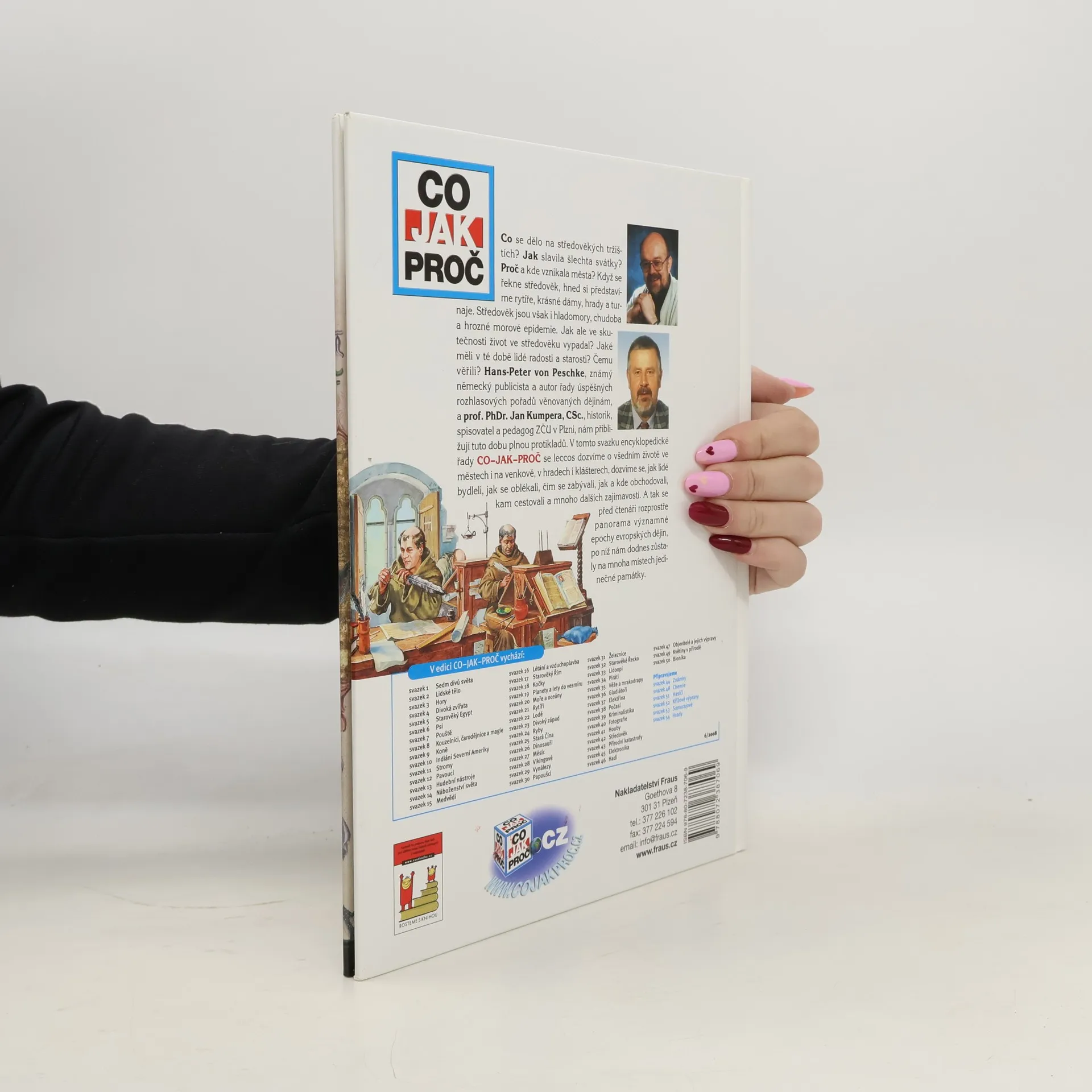 Co se dělo na středověkých tržištích? Jak slavila šlechta svátky? Proč a kde vznikala města? Když se řekne středověk, hned si představíme rytíře, krásné dámy, hrady a turnaje. Středověk jsou však i hladomory, chudoba a hrozné morové epidemie. Jak ale ve skutečnosti život ve středověku vypadal? Jaké měli v té době lidé radosti a starosti? Čemu věřili? Hans-Peter von Peschke, známý německý publicista a autor řady spěšných rozhlasových pořadů věnovaných dějinám, a prof. PhDr. Jan Kumpera, CSc., historik, spisovatel a pedagog ZČU v Plzni, nám přibližují tuto dobu plnou protikladů. V tomto svazku encyklopedické řady CO-JAK-PROČ se leccos dozvíme o všedním životě ve městech i na venkově, v hradech i klášterech, dozvíme se, jak lidé bydleli, jak se oblékali, čím se zabývali, jak a kde obchodovali, kam cestovali a mnoho dalších zajímavostí. A tak se před čtenáři rozprostře panorama významné epochy evropských dějin, po níž nám dodnes zůstaly na mnoha místech jedinečné památky.