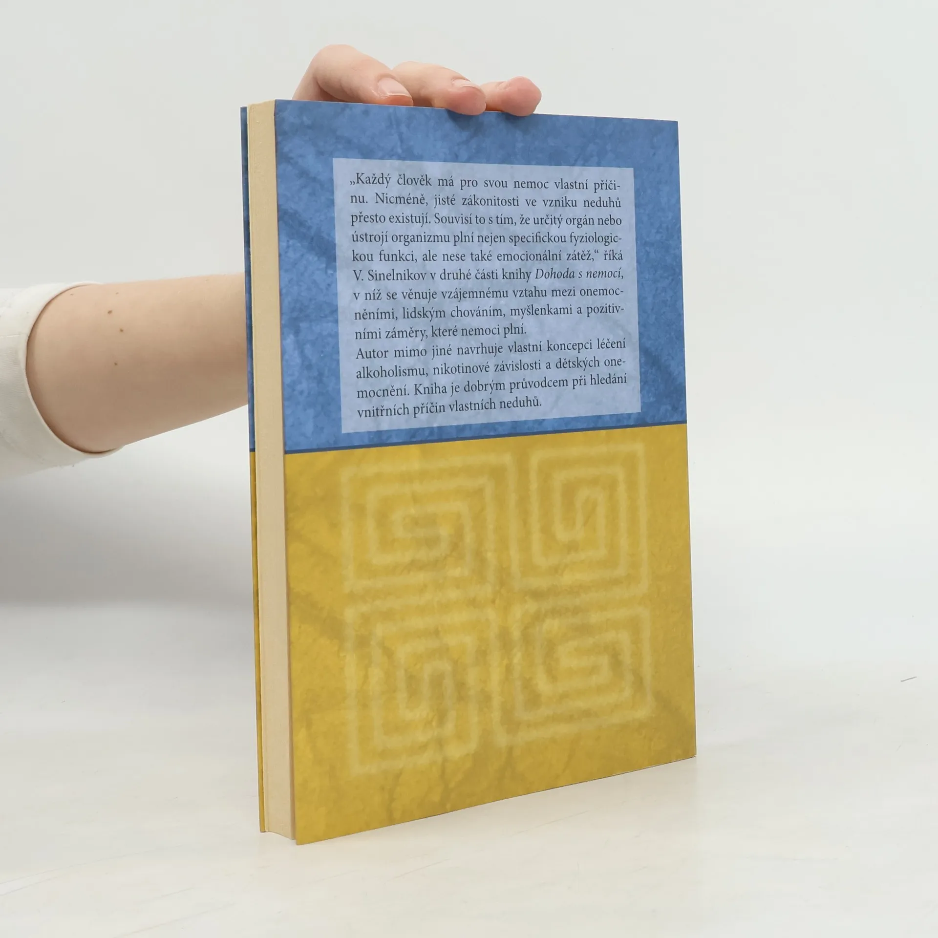 Každý člověk má pro svou nemoc vlastní příčinu. Nicméně, jisté zákonitosti ve vzniku neduhů přesto existují. Souvisí to s tím, že určitý orgán nebo ústrojí organismu plní nejen specifickou fyziologickou funkci, ale nese také emocionální zátěž, říká V. Sinelnikov v druhé knize Dohoda s nemocí, v níž se věnuje vzájemnému vztahu mezi onemocněním, lidským chováním, myšlenkami a pozitivními záměry, které nemoci plní. Autor mimo jiné navrhuje vlastní koncepci léčení alkoholismu, nikotinové závislosti a dětských onemocnění. Kniha je dobrým průvodcem při hledání vnitřních příčin vlastních neduh