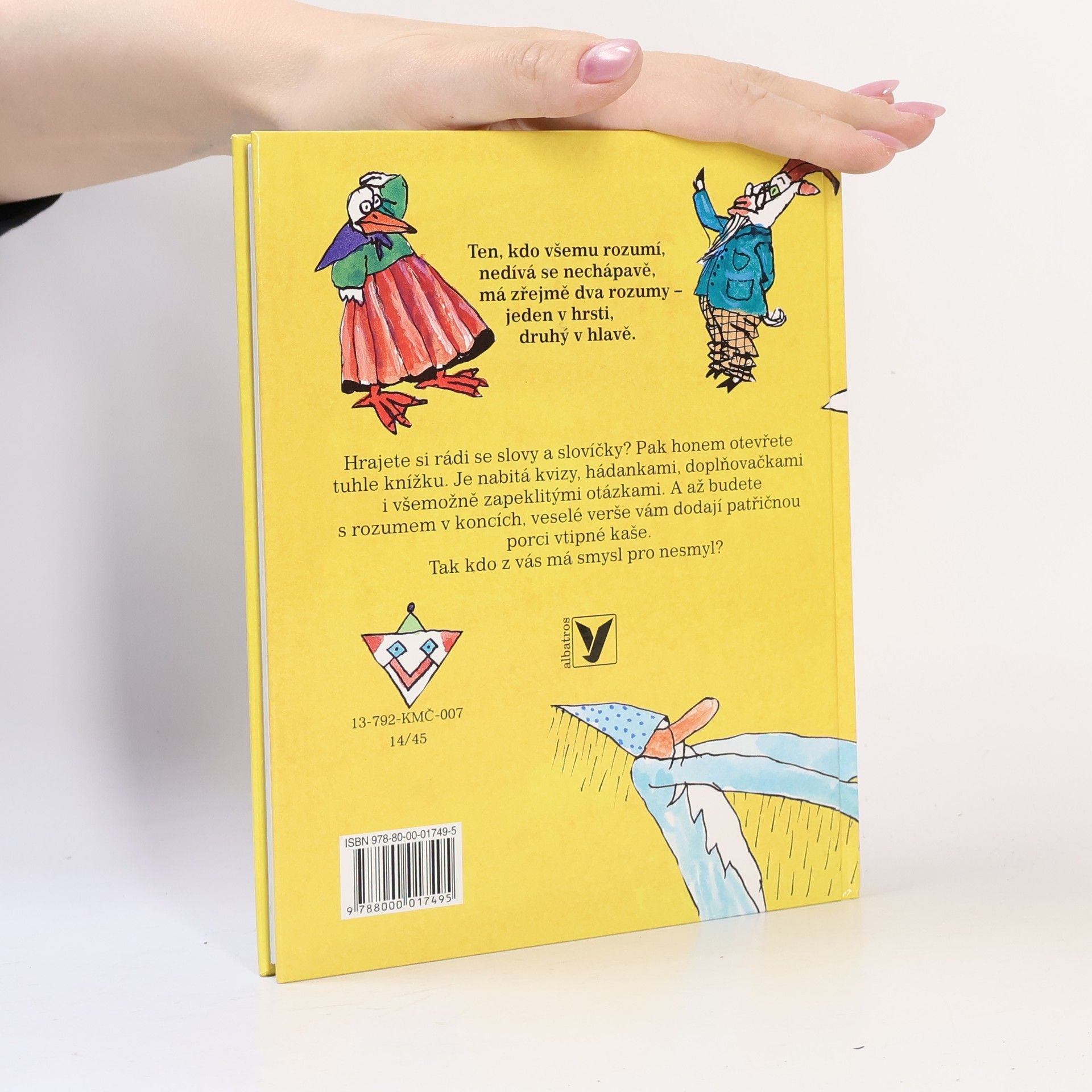 Hrajete si rádi se slovy a slovíčky? Pak je tato knížka přesně pro vás. Je nabitá kvízy, hádankami, přesmyčkami, doplňovačkami, i všemožně zapeklitými otázkami. Knížka zaujme, pobaví, a zároveň nutí k přemýšlení a k tvořivé práci s češtinou. Je pestrá a veselá, úkoly jsou snazší i náročnější, ale nebojte se, na konci knihy nechybí rozluštění. A tak si můžete ověřit svůj důvtip i logické uvažování. Tak jestlipak máte smysl pro nesmysl?