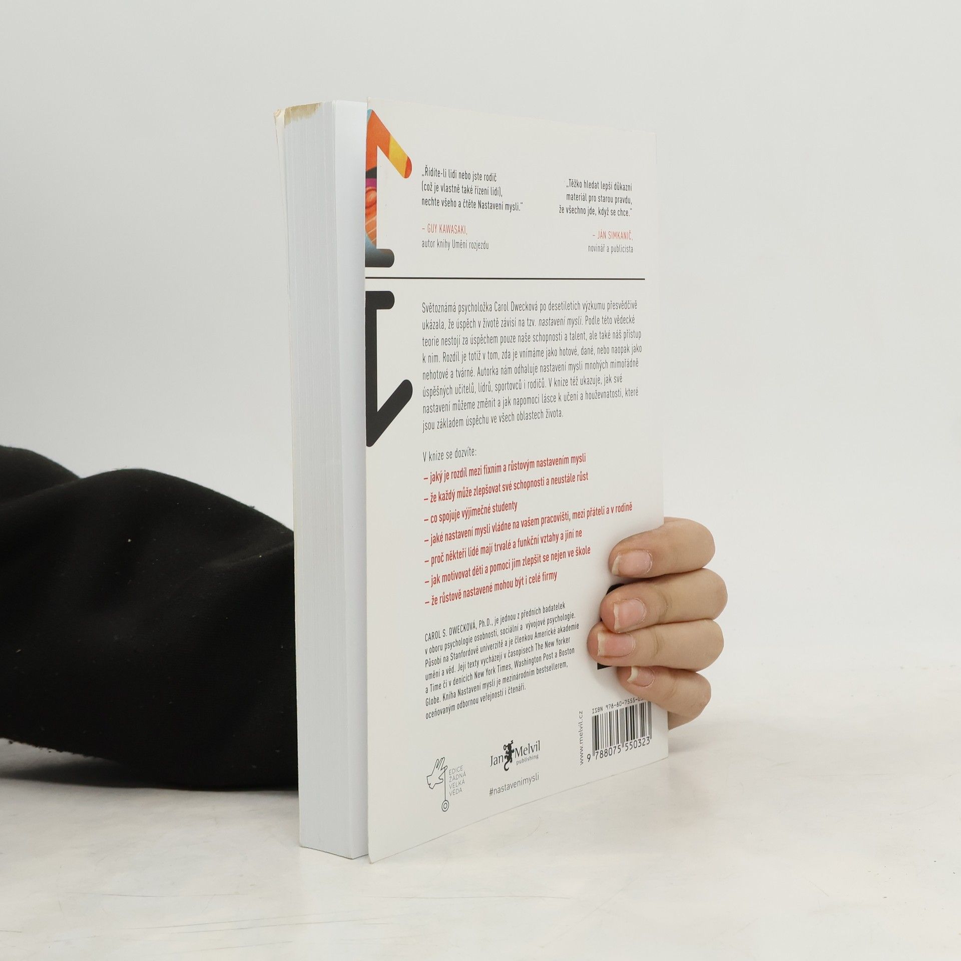 Jednoduchá myšlenka, kolem níž se tato kniha točí, a za níž stojí desítky let vědeckého výzkumu, se dá vyjádřit zhruba takto: úspěch máme ve svých hlavách. Profesorka Dwecková se svým týmem na Standfordské univerzitě zjistila, že svou přirozeností tíhneme ke dvěma relativně vyhraněným způsobům myšlení o sobě a své úspěšnosti: k myšlení růstovému a myšlení fixnímu (angl. „growth mindset“ a „fixed mindset“). To, které myšlení u nás převládá, pak významně ovlivňuje naši reálnou úspěšnost. Ke zjištěním Dweckové popsaným v knize patří nadějný závěr, že se navzdory své dispozici dokážeme během života změnit, a autorka ukazuje, jak na to: jak využít svůj plný potenciál. Chcete vědět, jak přesně se dva zmíněné typy myšlení projevují? Typickým rysem fixního myšlení je vzdávání se před překážkou, neschopnost přijímat zpětnou vazbu, špatný pocit při vnímání úspěchu ostatních, vyhýbání se výzvám a negativní postoj k úsilí jako takovému. Naopak růstové myšlení se projevuje vřelým vztahem k výzvám, vytrvalostí při čelení překážkám, pozitivním vztahem ke kritice. Růstově myslící člověk vnímá úsilí jako cestu k mistrovství a v úspěchu druhých vidí inspiraci.