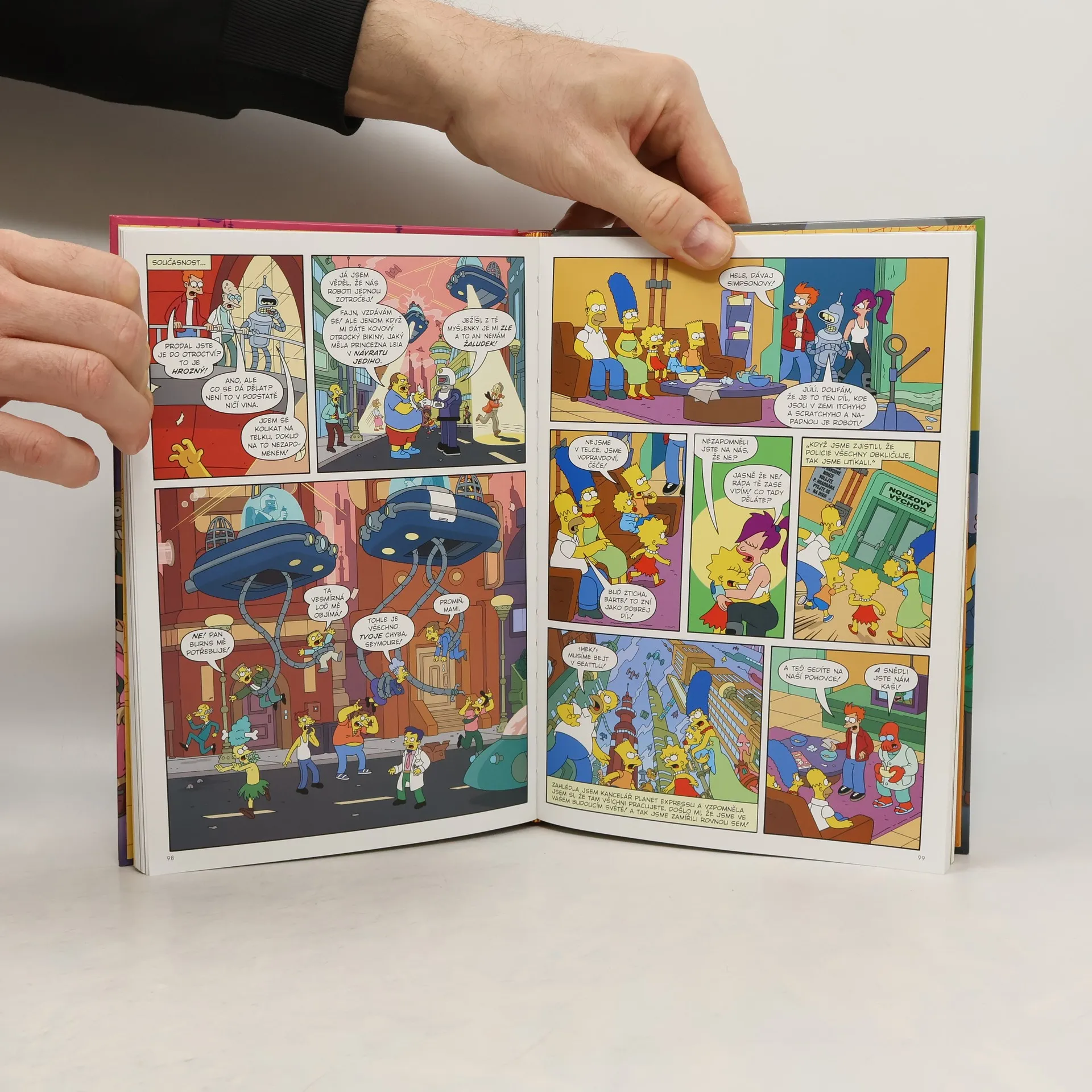 Spojení vesmírů Simpsonových a Futuramy? To je splněný sen! I když to teda není nijak závratně napínavý příběh, jde o příjemné zapracování obou univerz do jednoho celku. Zpracování a výjimečný formát komiksu, doplněný bonusovým materiálem a výtiskem prvního čísla komiksu Simpsonovi, který tu vyšel až za několik let po vydání této knihy, čtenáře rozhodně příjemně potěší. Moc se mi líbí ta kartonová kazeta, do které se samotná kniha schovává a díky které si můžete udělat cover obálky, podle vlastních preferencí.