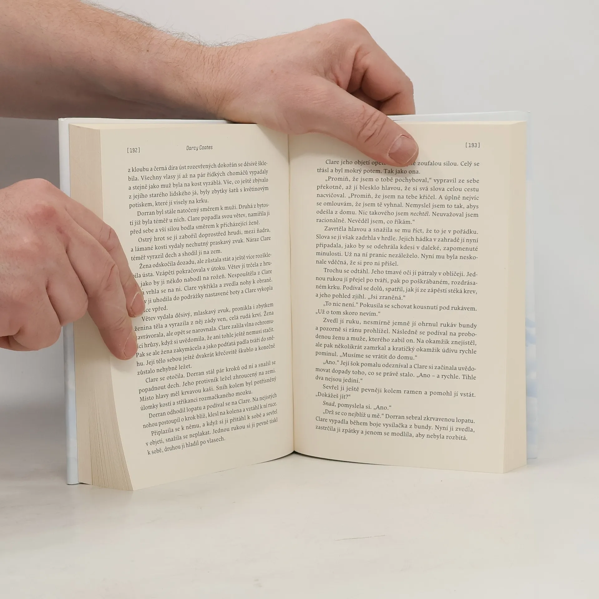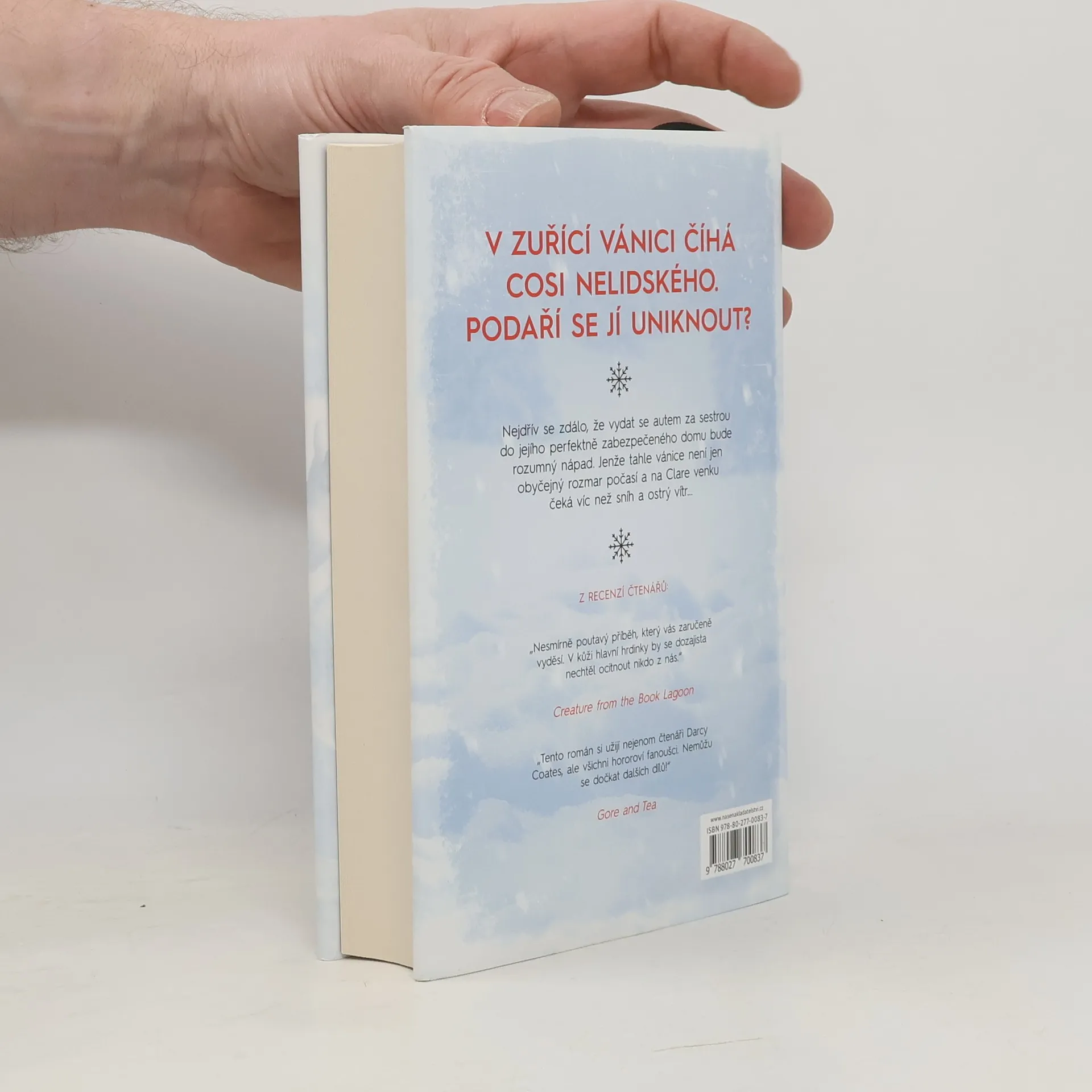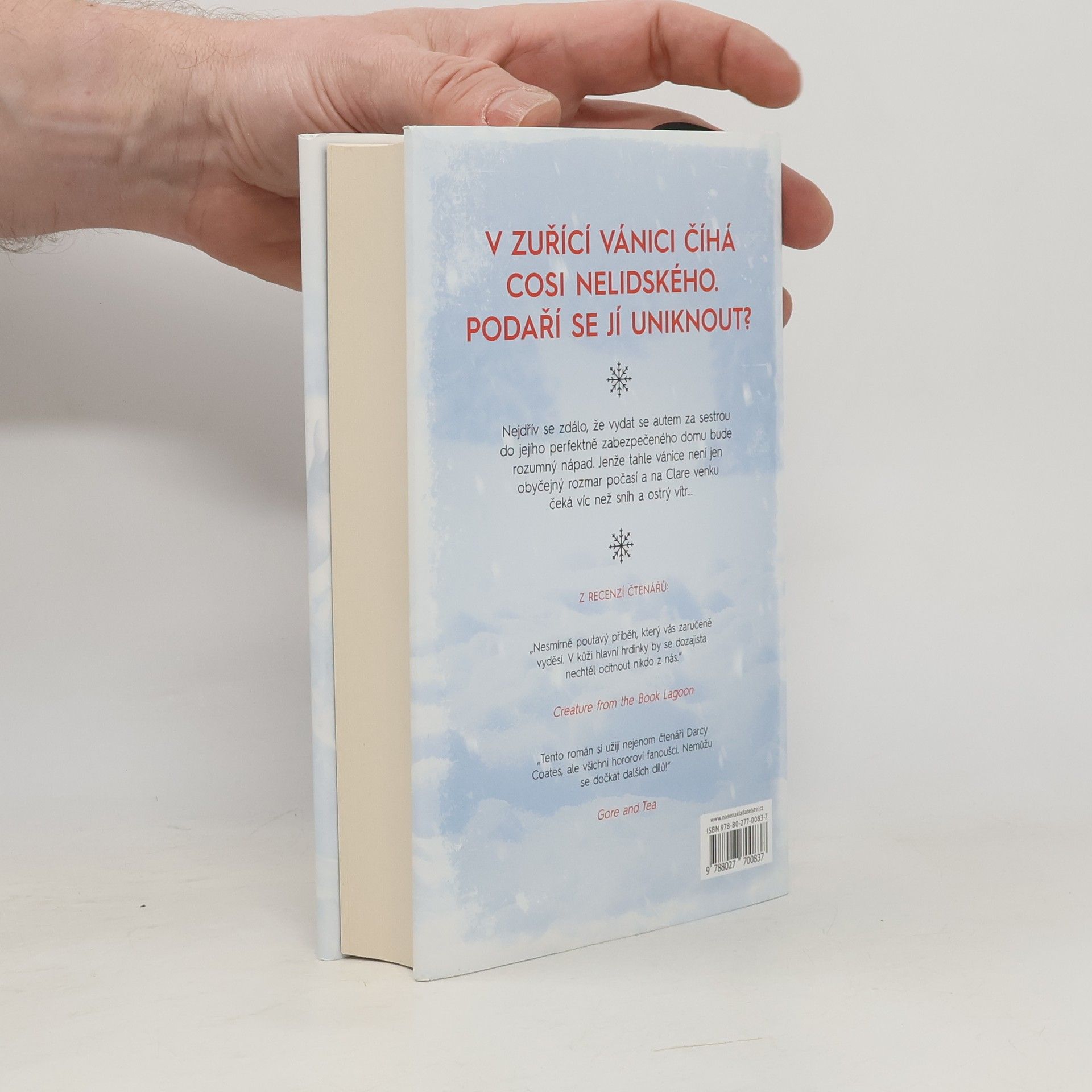 Clare si vybavila zimu. A opuštěná auta u krajnice, hračky poházené na silnici. Vybavila si nekonečnou vánici a hrůzu, kterou nedokázala vysvětlit. A pak už nic… Když se probudila, ležela celá rozbolavělá a vyděšená v prastarém, ponurém domě, připomínajícím spíše starodávné šlechtické sídlo. U postele seděl neznámý mladý muž a tvrdil, že měla ve vánici autonehodu. Našel ji a přinesl do svého domu. Clare by ze všeho nejraději utekla, ale je až příliš slabá a vánice za okny stále nepolevuje. Uvěznila je v domě a Clare nezbývá než čekat. Mladík se k ní chová mile, ale Clare si není jistá, nakolik mu může důvěřovat? On tvrdí, že jsou v domě sami, ale ona má pocit, že vidí a slyší věci, které naznačují, že kolem někdo slídí a čeká na příležitost. Napětí stále stoupá a s ním i pocit, že se z nich stala lovná zvěř. Clare dochází k závěru, že její nehoda nebyla náhodná. Venku za dveřmi na ni něco číhá, něco čeká, až opustí bezpečí kamenných zdí… něco strašného, nelidského a krutého.