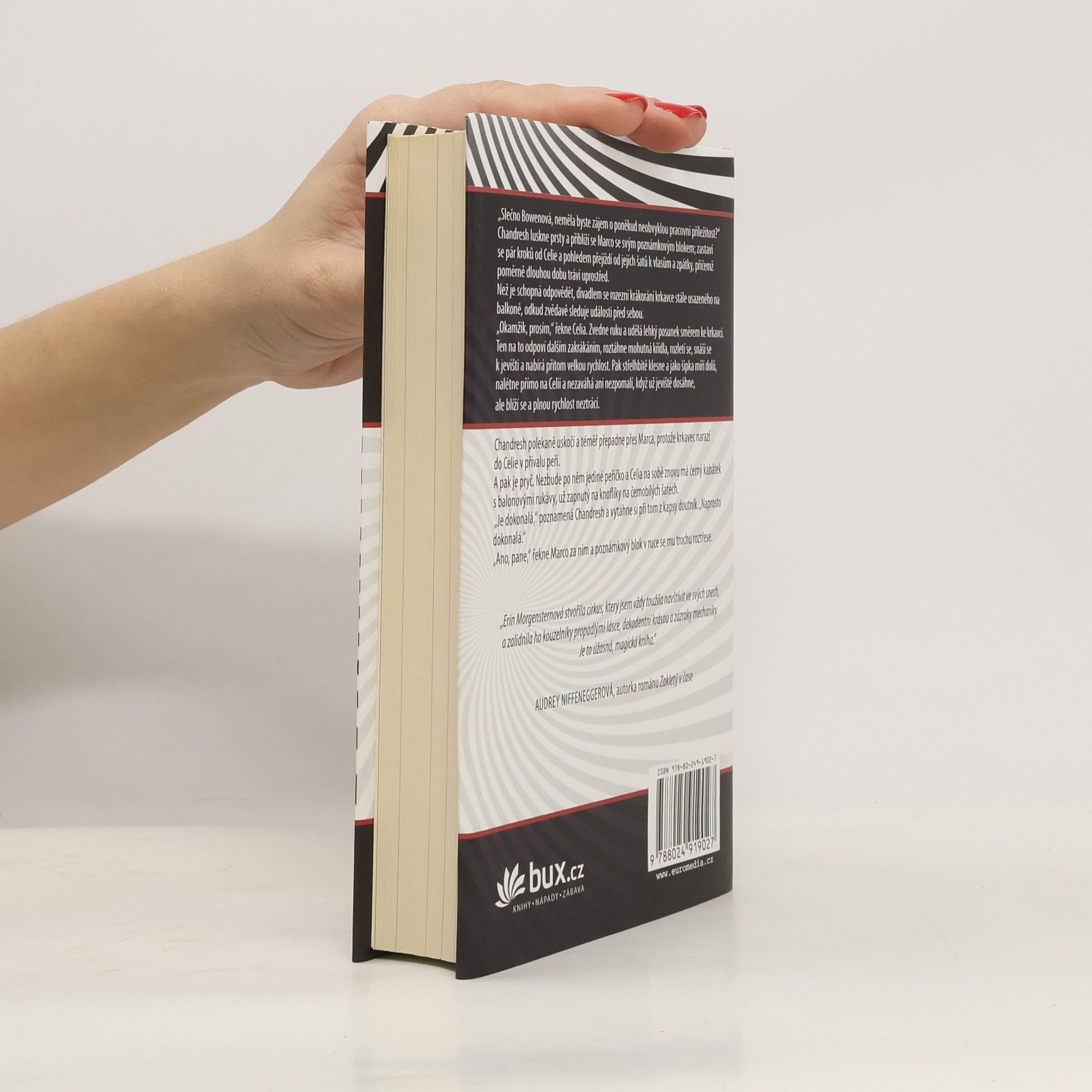 Do města přijíždí tajemný cirkus, jehož černobílé šapitó otevírá brány pouze v noci. Představení, která se zde konají, připomínají mocná kouzla. Románový debut Erin Morgenstern zachycuje magickou atmosféru a sleduje hru dvou kouzelníků, Celie a Marca, kteří jsou od dětství trénováni v nelítostném souboji, jehož vítězem se stane ten, jehož učedník přežije. Cirkus se stává jevištěm jejich imaginativní bitvy, ale Celia a Marco si nejsou vědomi, že jejich láska, která mezi nimi vzplane, může mít fatální následky. Cirkus se objevuje bez varování a jeho černobílé stany skrývají neuvěřitelné divy. Za jeho kouzelnou fasádou se však odehrává soutěž, ve které se oba mladí kouzelníci snaží překonat jeden druhého. Jejich vzájemná láska, která roztápí atmosféru každého setkání, komplikuje situaci, protože pouze jeden z nich může vyjít jako vítěz. Osudy všech zúčastněných, ať už vystupujících nebo návštěvníků, visí na vlásku, stejně jako akrobaté na visuté hrazdě. Tento kouzelný román, napsaný bohatým jazykem, je pastvou pro smysly a srdce.