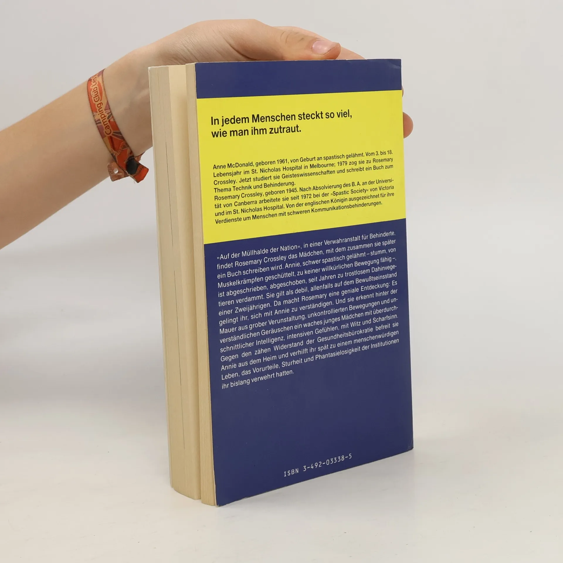 In einer Verwahranstalt für Behinderte begegnet Rosemary Crossley dem Mädchen, mit dem sie später dieses Buch schreiben wird. Annie, von Geburt an spastisch gelähmt - stumm, von Muskelkrämpfen geschüttel, zu keiner Bewegung fähig, gilt als debil, und war verwahrt worden. Die Autorin aber erkennt hinter all diesen Behinderungen ein waches Mädchen, mit überdurchschnittlicher Intelligenz und intensiven Gefühlen