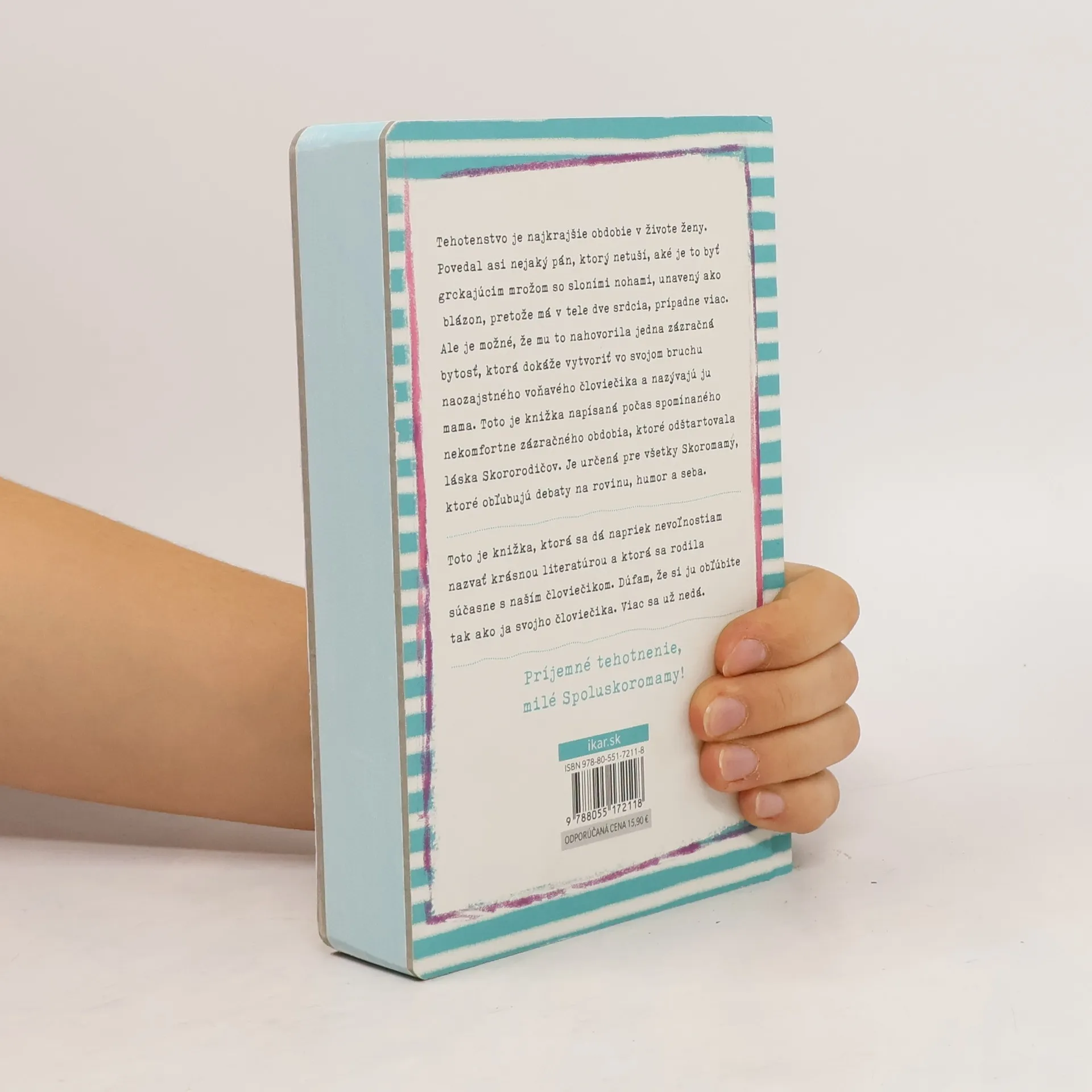 Tehotenstvo je najkrajšie obdobie v živote ženy. Povedal asi nieaký pán, ktorý netuší, aké je to byť grckajúcim mrožom so sloními nohami, unavený ako blázon, pretože má v tele dve srdcia, prípadne viac. Ale je možné, že mu to nahovorila jedna zázračná bytosť, ktorá dokáže vytvoriť vo svojom bruchu naozajstného voňavého človiečika a nazývajú ju mama. Toto je knižka napísaná počas spomínaného nekomfortne zázračného obdobia, ktoré odštartovala láska Skororodičov. Je určená pre všetky Skoromamy, ktoré obľubujú debaty ba rovinu,humor a seba. Toto je knižka, ktorá dá napriek nevoľnostiam nazvať krásnou literatúrou a ktorá sa rodila súčasne s naším človiečikom. Dúfam, že si ju obľúbite tak ako ja svojho človiečika. Viac sa už nedá. Príjemné tehotnenie, milé Spoluskoromamy!