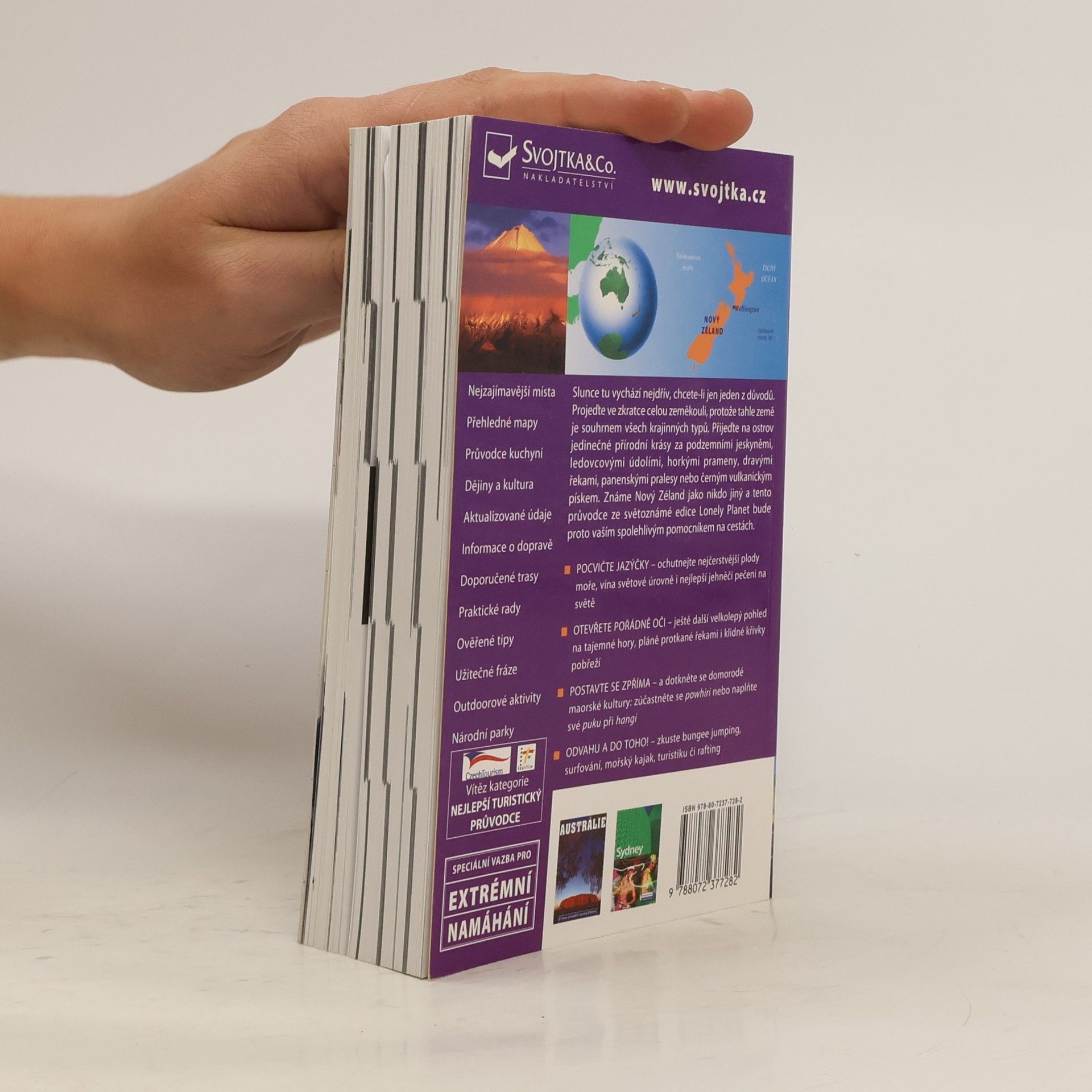 Cestovní příručka obsahuje praktické rady a údaje pro turisty, popisy míst, krajiny a pamětihodností i pojednání o historii a kultuře Nového Zélandu.