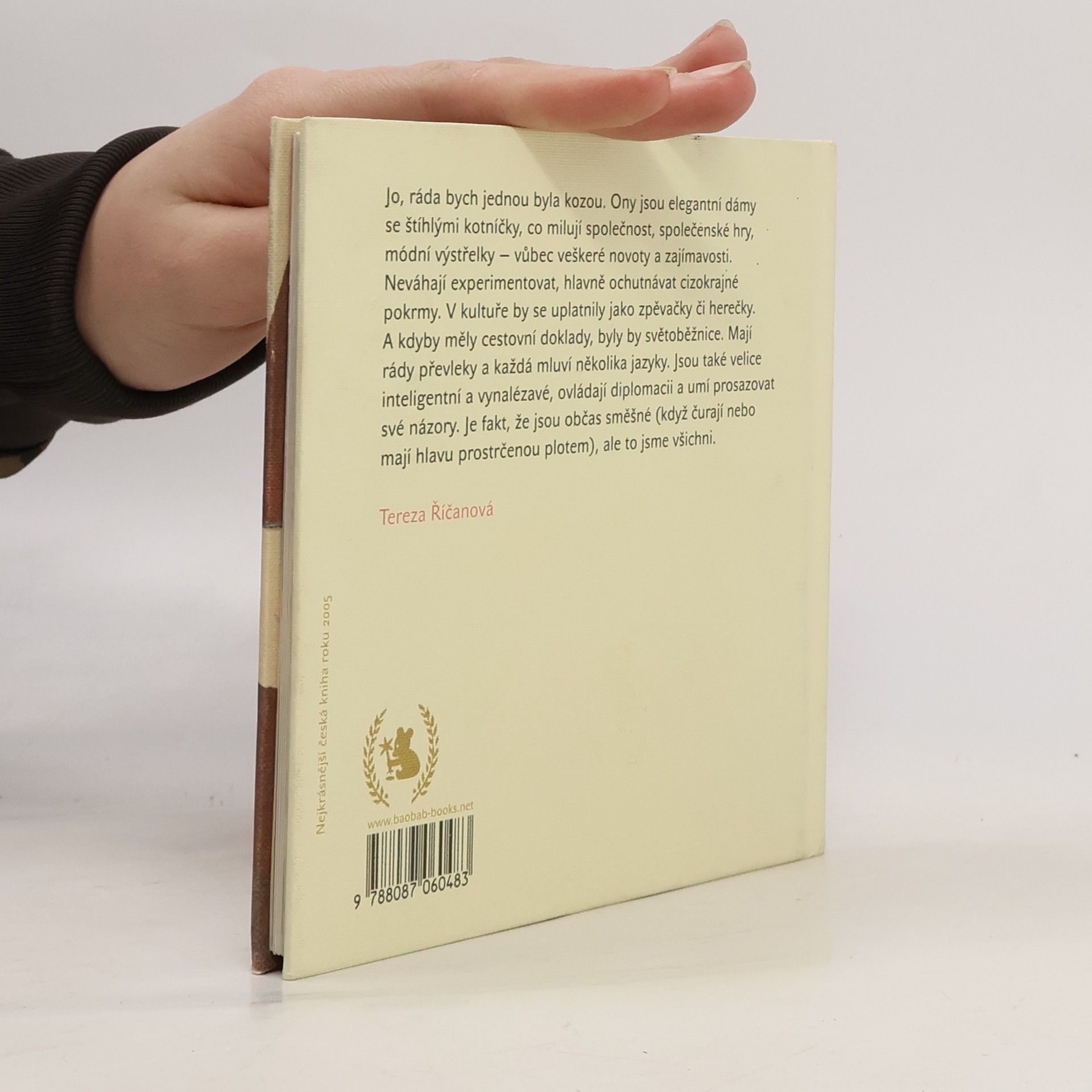 Knížka pro děti s půvabnými ilustracemi autorky. "Jo, ráda bych jednou byla kozou. Ony jsou elegantní dámy se štíhlými kotníčky, co milují společnost, společenské hry, módní výstřelky – vůbec veškeré novoty a zajímavosti. Neváhají experimentovat, hlavně ochutnávat cizokrajné pokrmy. V kultuře by se uplatnily jako zpěvačky či herečky. A kdyby měly cestovní doklady, byly by světoběžnice. Mají rády převleky a každá mluví několika jazyky. Jsou také velice inteligentní a vynalézavé, ovládají diplomacii a umějí prosazovat své názory. Je fakt, že jsou občas směšné (když čurají nebo mají hlavu prostrčenou plotem), ale to jsme všichni." Tereza Říčanová.