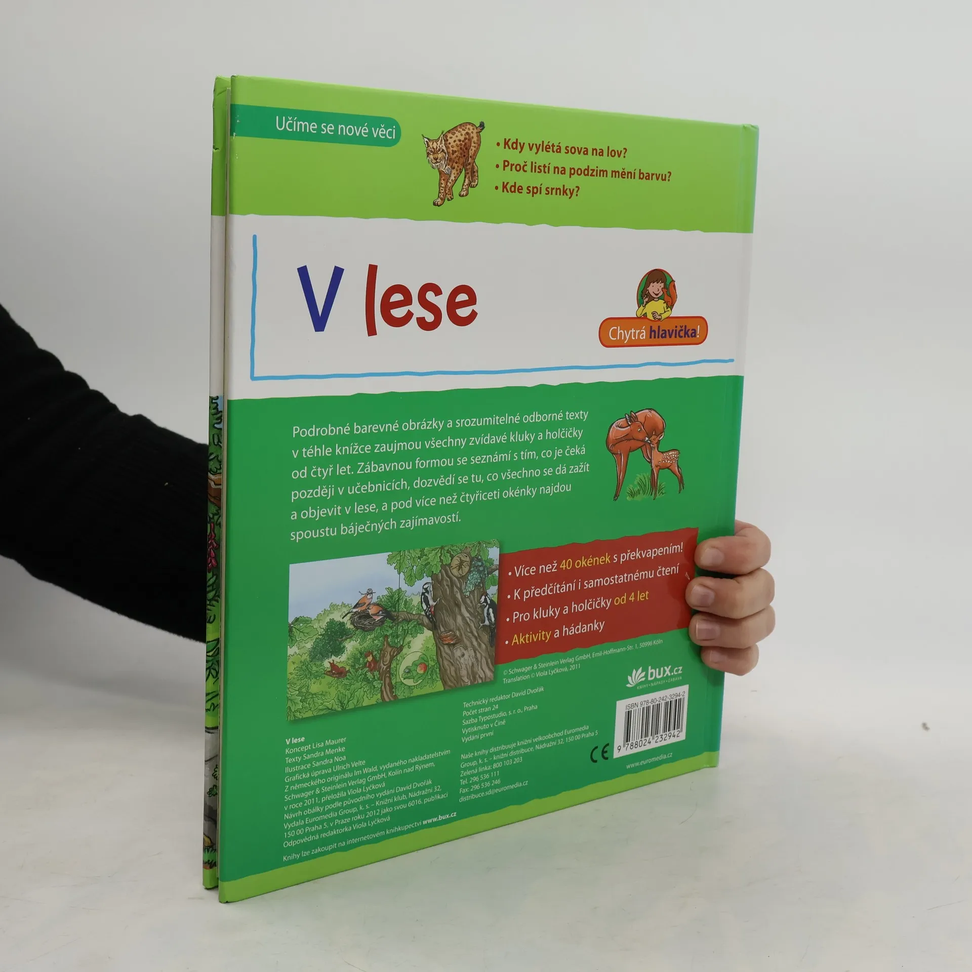 Kdy vylétá sova na lov? Proč listí na podzim mění barvu? Kde spí srnky? Podrobné barevné obrázky a srozumitelné odborné texty v téhle knížce zaujmou všechny zvídavé kluky a holčičky od čtyř let. Zábavnou formou se seznámí s tím, co je čeká později v učebnicích, dozvědí se tu, co všechno se dá zažít a objevit v lese, a pod více než čtyřiceti okénky najdou spoustu báječných zajímavostí, aktivity a hádanky. Díky pěkným obrázkům a hrám je tato první odborná kniha zvláště přitažlivá. Je vhodná k předčítání i samostatnému čtení. Pro kluky a holčičky od 4 let.