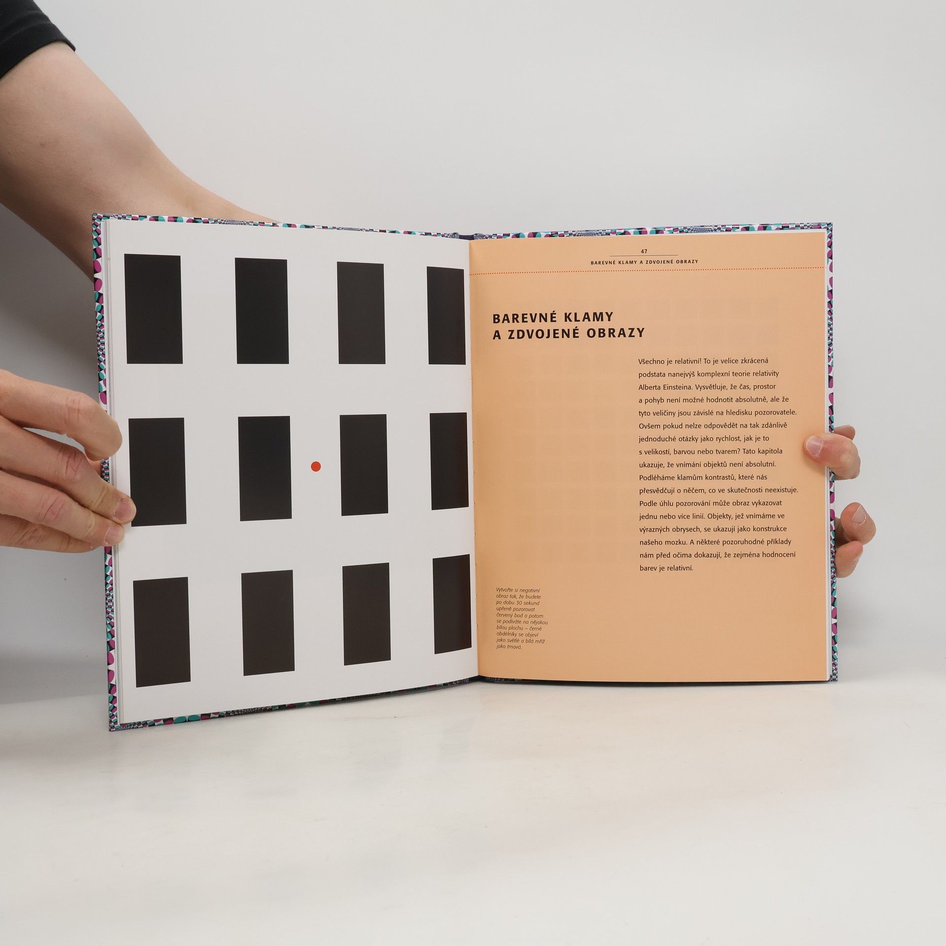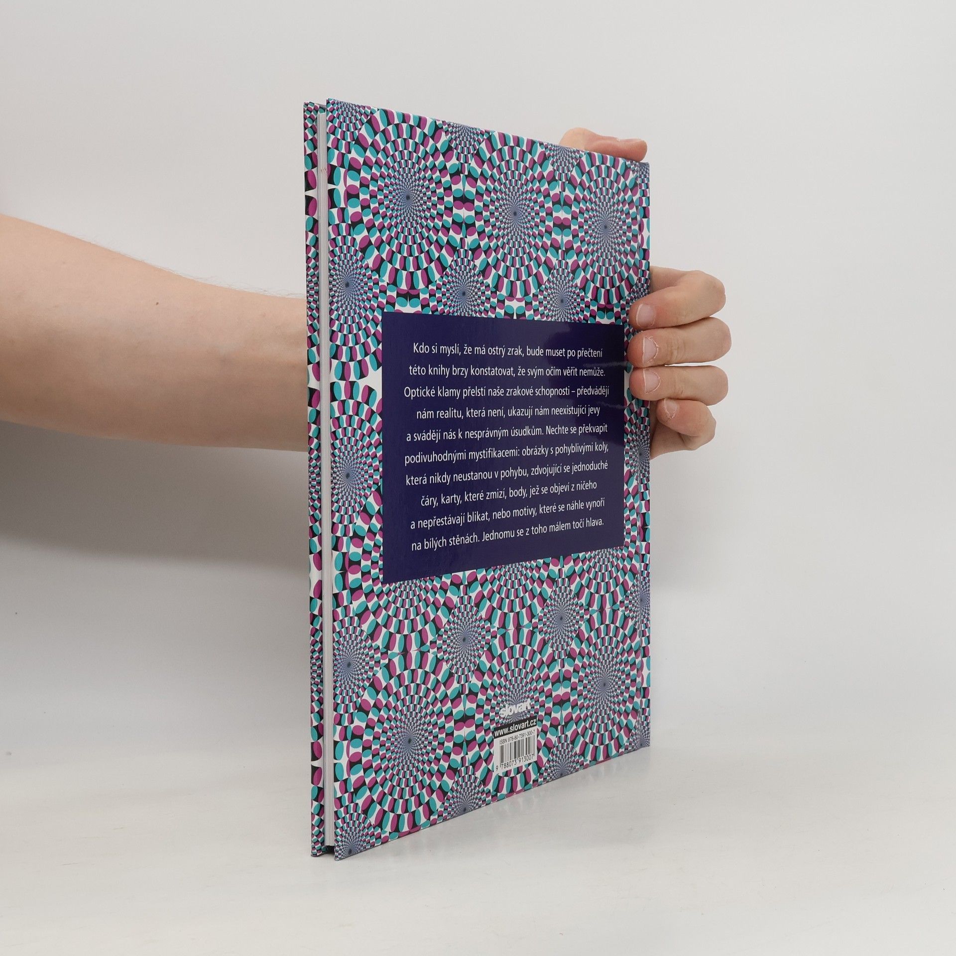 Kdo si myslí, že má ostrý zrak, bude muset po přečtení této knihy brzo konstatovat, že svým očím věřit nemůže. Optické klamy přelstí naše zrakové schopnosti - předvádějí nám realitu, která není, ukazují nám neexistující jevy a svádějí nás k nesprávným úsudkům. Nechte se překvapit podivuhodnými mystifikacemi: obrázky s pohyblivými koly, která nikdy neustanou v pohybu, zdvojující se jednoduché čáry, karty, které zmizí, body, jež se objeví z ničeho a nepřestávají blikat, nebo motivy, které se náhle vynoří na bílých stěnách. Jednomu se z toho málem točí hlava.