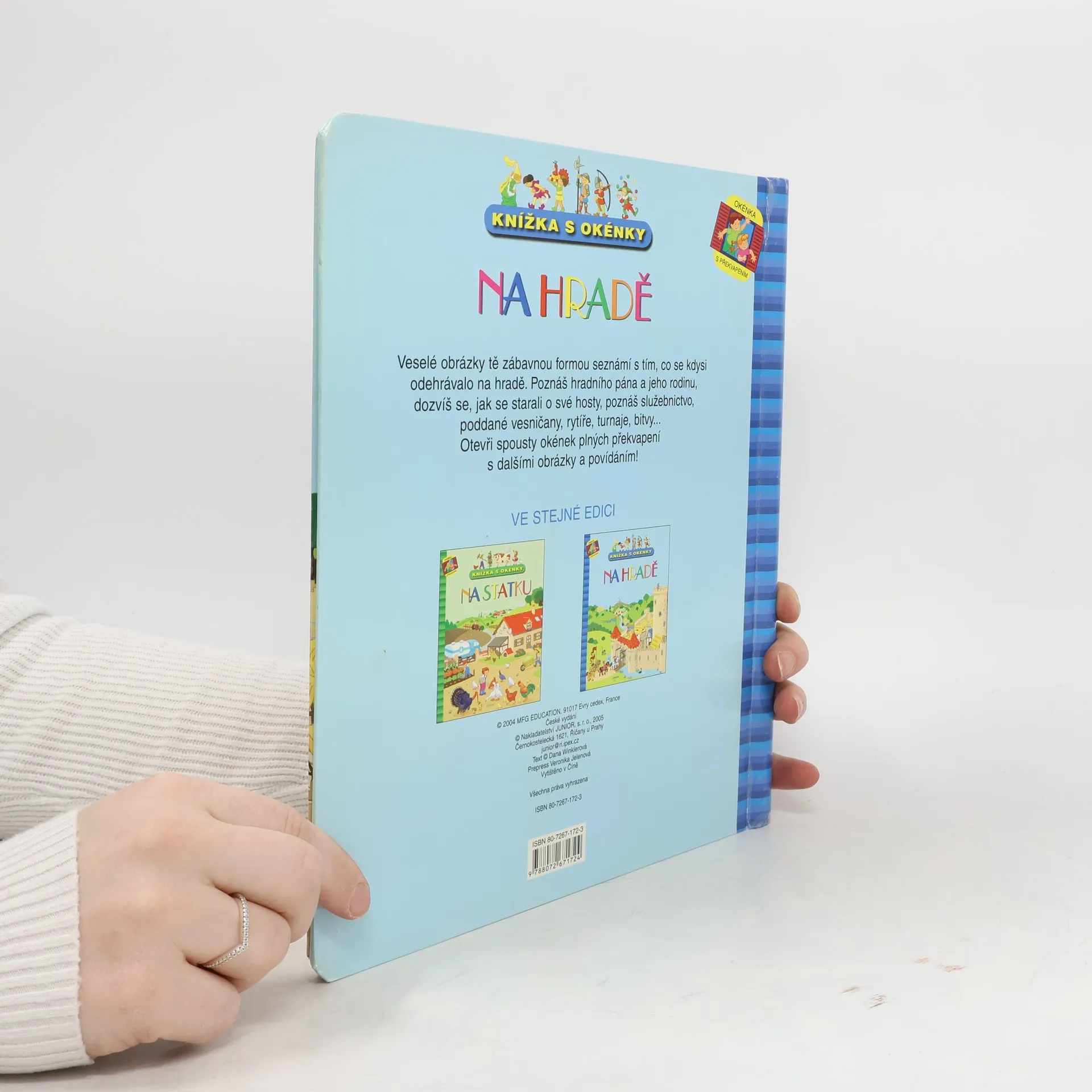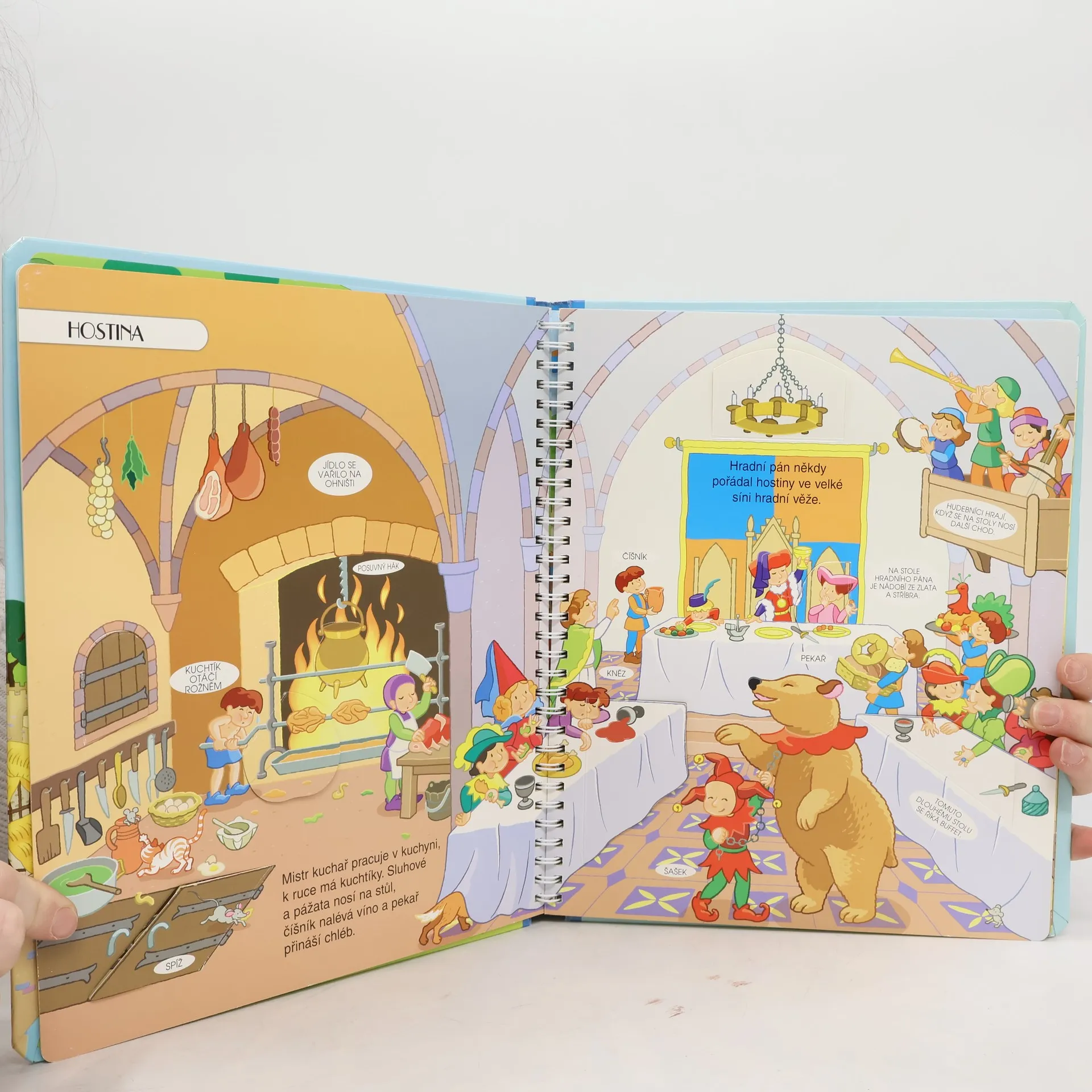 Veselé obrázky děti zábavnou formou seznámí s tím, co se kdysi odehrávalo na hradě. Poznáte hradního pána a jeho rodinu, dozvíte se, jak se starali o své hosty, poznáte služebnictvo, poddané vesničany, rytíře, turnaje, bitvy... V knížce můžete navíc otevřít spoustu okének plných překvapení s dalšími obrázky a povídáním! A protože je celá knížka vyrobena ve formě kroužkového bloku, vydrží vám mnohem déle jako nová – na rozdíl od skládacího leporela.