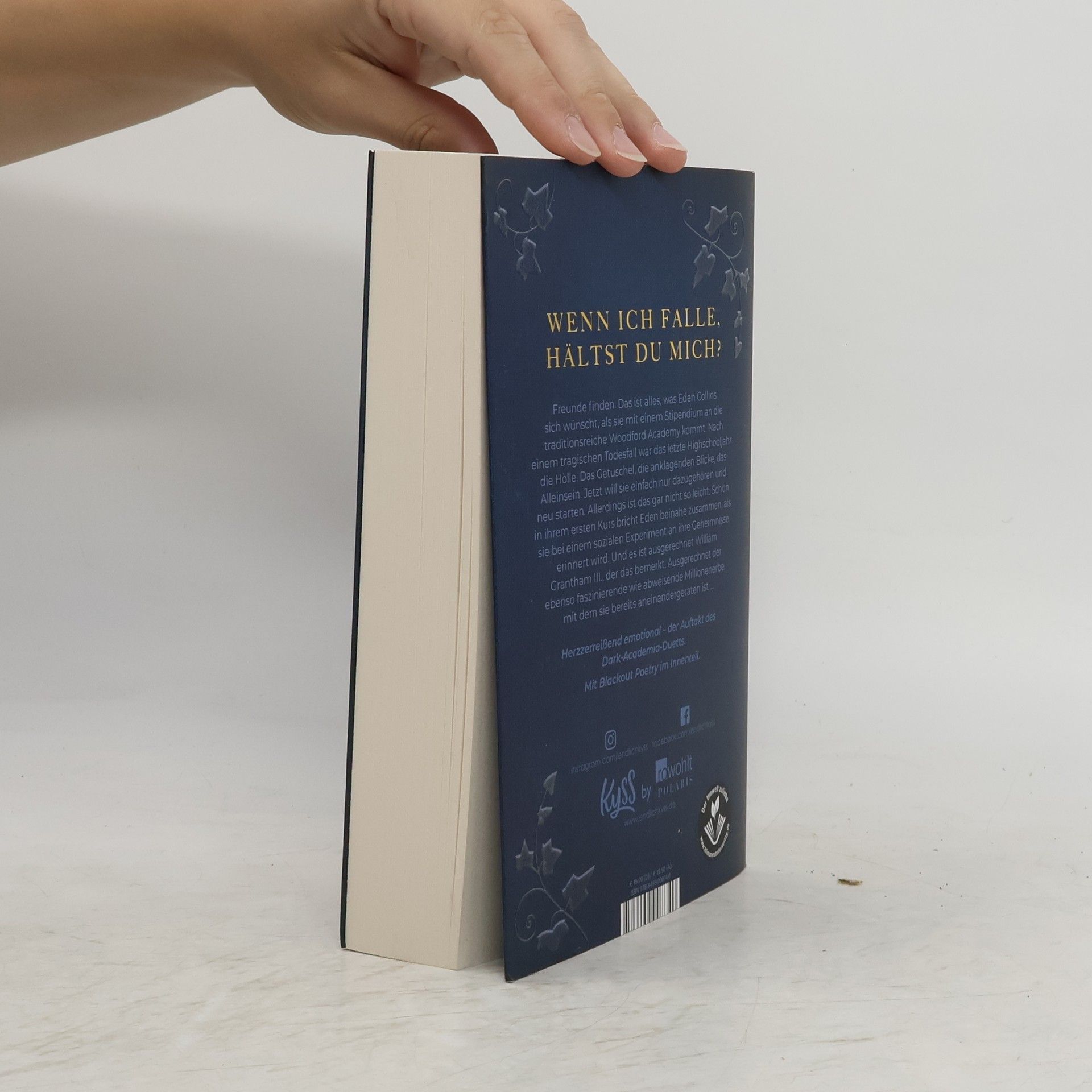 Wenn ich falle, hältst du mich? Der Auftakt zum Dark-Academia-Duett von Spiegel-Bestseller-Autorin Nikola Hotel. Freunde finden. Das ist alles, was Eden Collins sich wünscht, als sie mit einem Stipendium an die traditionsreiche Woodford Academy kommt. Nach einem tragischen Todesfall war das letzte Highschooljahr die Hölle. Das Getuschel, die anklagenden Blicke, das Alleinsein. Jetzt will sie einfach nur dazugehören und neu starten. Allerdings ist das gar nicht so leicht. Schon in ihrem ersten Kurs bricht Eden beinahe zusammen, als sie bei einem sozialen Experiment an ihre Geheimnisse erinnert wird. Und es ist ausgerechnet William Grantham III., der das bemerkt. Ausgerechnet der ebenso faszinierende wie abweisende Millionenerbe, mit dem sie bereits aneinandergeraten ist … Herzzerreißend emotional – für alle Fans von mitreißenden Liebesromanen und Dark Academia. Mit Blackout Poetry im Innenteil.