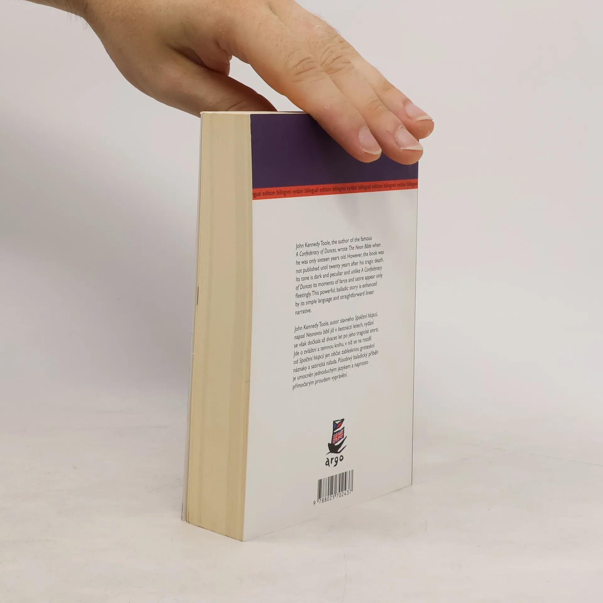 John Kennedy Toole, autor slavného Spolčení hlupců, napsal Neonovou bibli již v šestnácti letech, vydání se však dočkala až dvacet let po jeho tragické smrti. Jde o zvláštní a temnou knihu, v níž se na rozdíl od Spolčení hlupců jen občas zablesknou groteskní náznaky a satirická nálada. Působivý baladický příběh je umocněn jednoduchým jazykem a naprosto přímočarým proudem vyprávění. Bilingvní vydání.