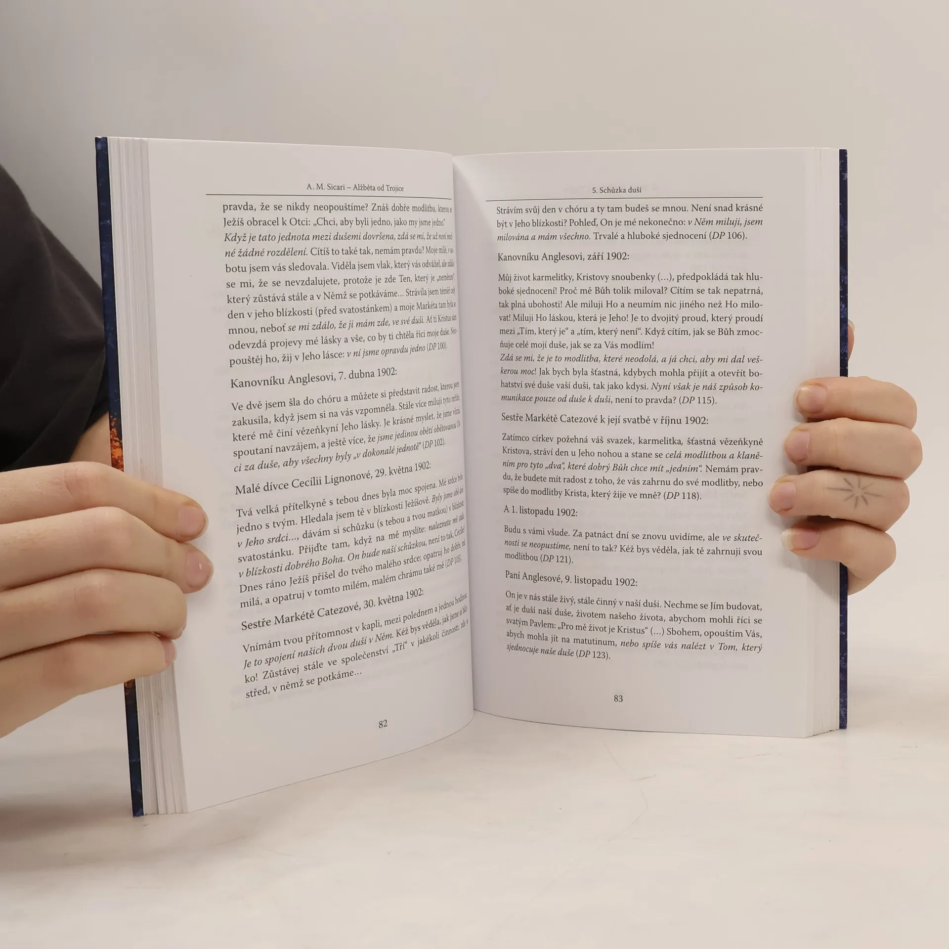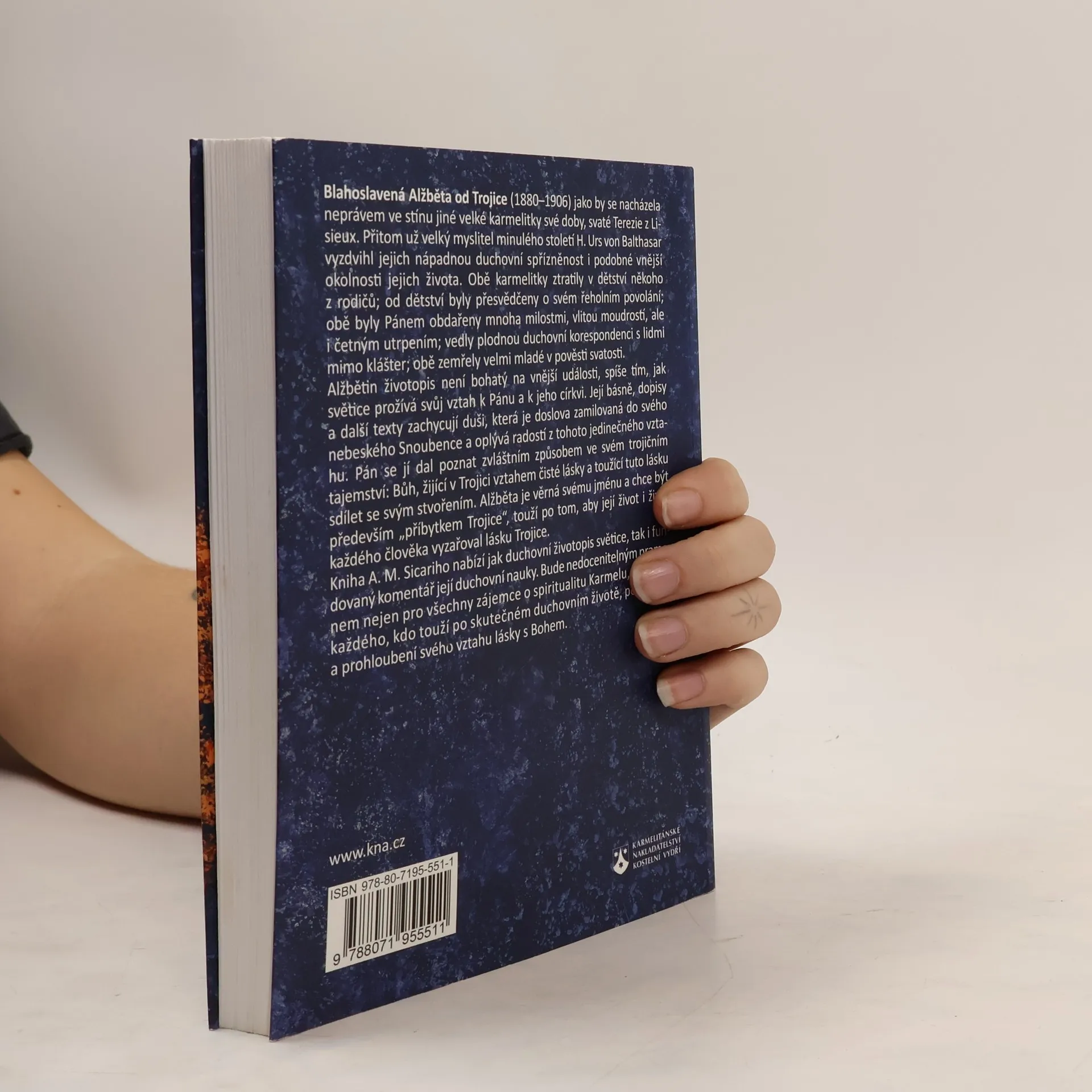 Blahoslavená Alžběta od Trojice (1880–1906) jakoby se nacházela neprávem ve stínu jiné velké karmelitky své doby, svaté Terezie z Lisieux. Přitom už velký myslitel minulého století H. U. von Balthasar vyzdvihl jejich nápadnou duchovní spřízněnost i podobné vnější okolnosti jejich života. Obě karmelitky ztratily v dětství někoho z rodičů; od dětství byly přesvědčeny o svém řeholním povolání; obě byly Pánem obdařeny mnoha milostmi, vlitou moudrostí, ale i četným utrpením; vedly plodnou duchovní korespondenci s lidmi mimo klášter; obě zemřely velmi mladé v pověsti svatosti. Alžbětin životopis není bohatý na vnější události, ale spíše tím, jak světice prožívá svůj vztah k Pánu a k jeho církvi. Její básně, dopisy a další texty zachycují duši, která je doslova zamilovaná do svého nebeského Snoubence a oplývá radostí z tohoto jedinečného vztahu. Pán se jí dal poznat zvláštním způsobem ve svém trojičním tajemství: Bůh, žijící v Trojici vztahem čisté lásky a toužící tuto lásku sdílet se svým stvořením. Alžběta je věrná svému jménu a chce být především „příbytkem Trojice“, touží po tom, aby její život i život každého člověka vyzařoval lásku Trojice. Kniha A. M. Sicariho nabízí jak duchovní životopis světice, tak i fundovaný komentář její duchovní nauky. Bude nedocenitelným pramenem pro všechny zájemce o spiritualitu Karmelu i pro každého, kdo touží po skutečném duchovním životě, po oživení a prohloubení svého vztahu lásky s Bohem.