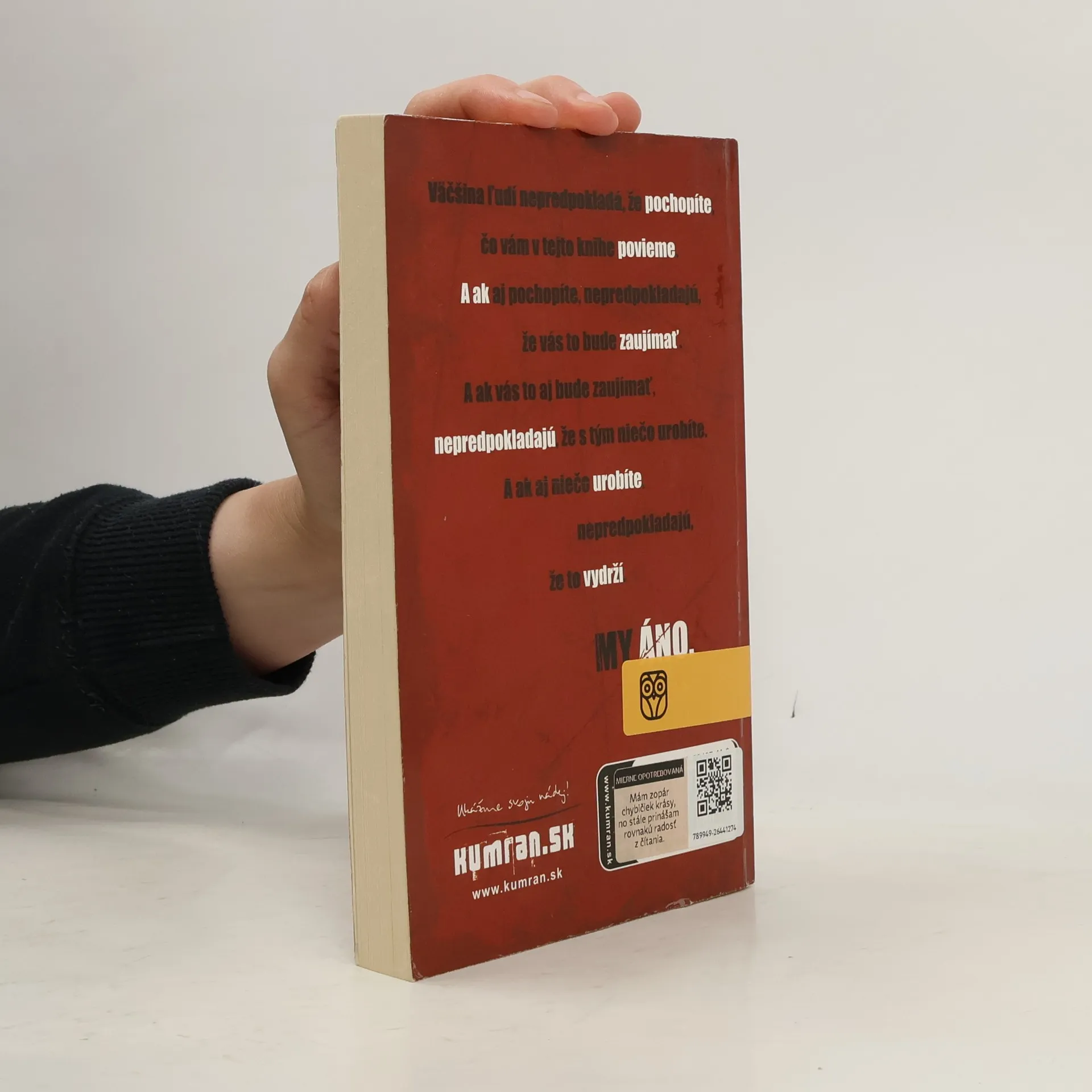 Väčšina ľudí nepredpokladá, že pochopíte, čo vám v tejto knihe povieme. A ak aj pochopíte, nepredpokladajú, že vás to bude zaujímať. A ak vás to aj bude zaujímať, nepredpokladajú, že s tým niečo urobíte. A ak aj niečo urobíte, nepredpokladajú, že to vydrží. MY ÁNO. „Táto kniha má v sebe obrovskú dynamiku zmeniť životy nielen tínedžerov, ale aj všetkých, ktorí sa ju odhodlajú otvoriť a čítať. Je naozaj čas na zmenu.“ JÁN BUC, kňaz pracujúci s mládežou a riaditeľ TV LUX "Živelná kniha. Lezie pod kožu a provokuje zmenu – vo veľkých i malých veciach. Čítaj a uvidíš, že v podstate je jednoduchšie ťažké veci robiť ako nerobiť. Potom to už len natri svetu a ukáž, čo je v tebe. Buď rebelom, ktorého ženie nový druh rebélie. The Rebelution." Františka Čačková, OSF