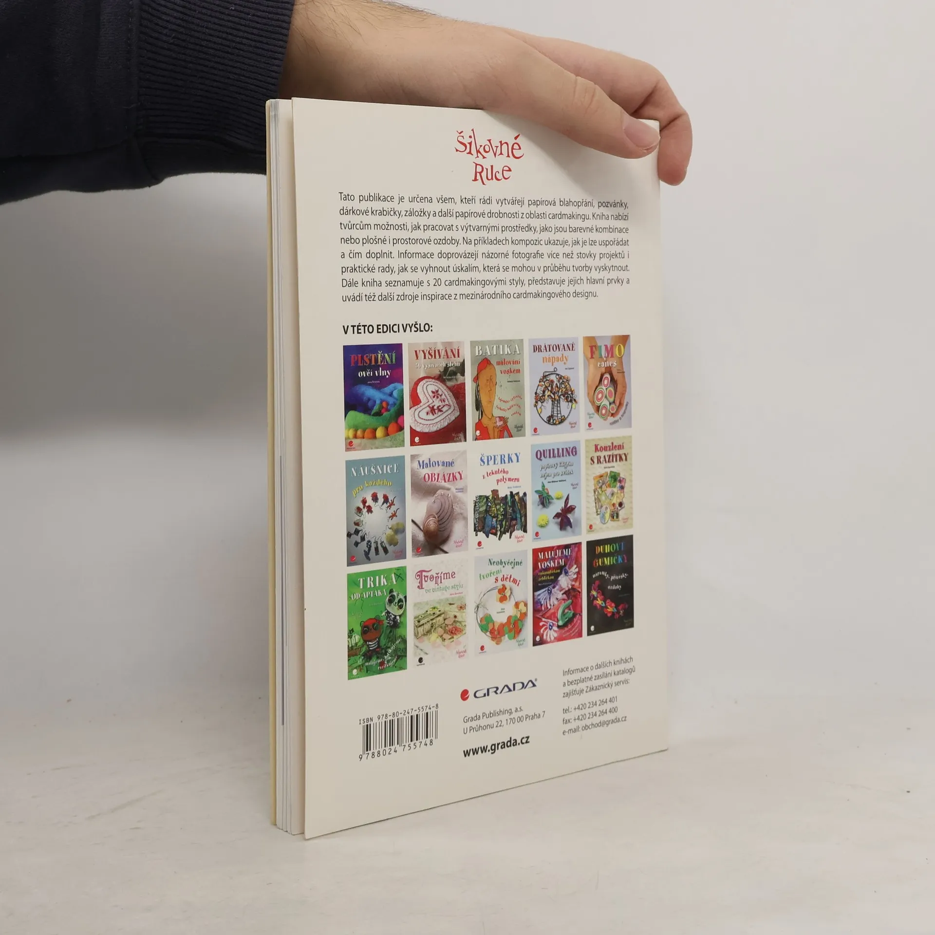 Cardmaking představuje soubor různých technik, kterými vytváříme originální papírová přání, knižní záložky, darovací obálky, pozvánky, jmenovky, ozdobné visačky, obaly a krabičky, adventní kalendáře apod. Zároveň tak nazýváme zájmovou dekorativní činnost, jež díky kreativnímu a relaxačnímu charakteru oslovuje stále více nadšenců po celém světě. Cardmaking vzešel ze scrapbookingu (tvorba fotoalb a deníků), dnes mají společné zejména materiály a techniky. Kniha přináší rady, jak se vyznat a tvořit v 10 stylech cardmakingu, jak úspěšně sestavovat kompozice, jak se vyhnout začátečnickým chybám a překlenout úskalí tvarů a barev. Na konkrétních příkladech ukazuje, jak používat výtvarnou alchymii a různé materiály. Techniky jsou vybrány s ohledem na české prostředí tak, aby většina pomůcek byla běžně dostupná v našich obchodech. Pracovní návody doprovázejí názorné fotografie, které krok za krokem přibližují, jak různými technikami vytvářet osobitě dekorované papíry i efektní ozdoby pro blahopřání.