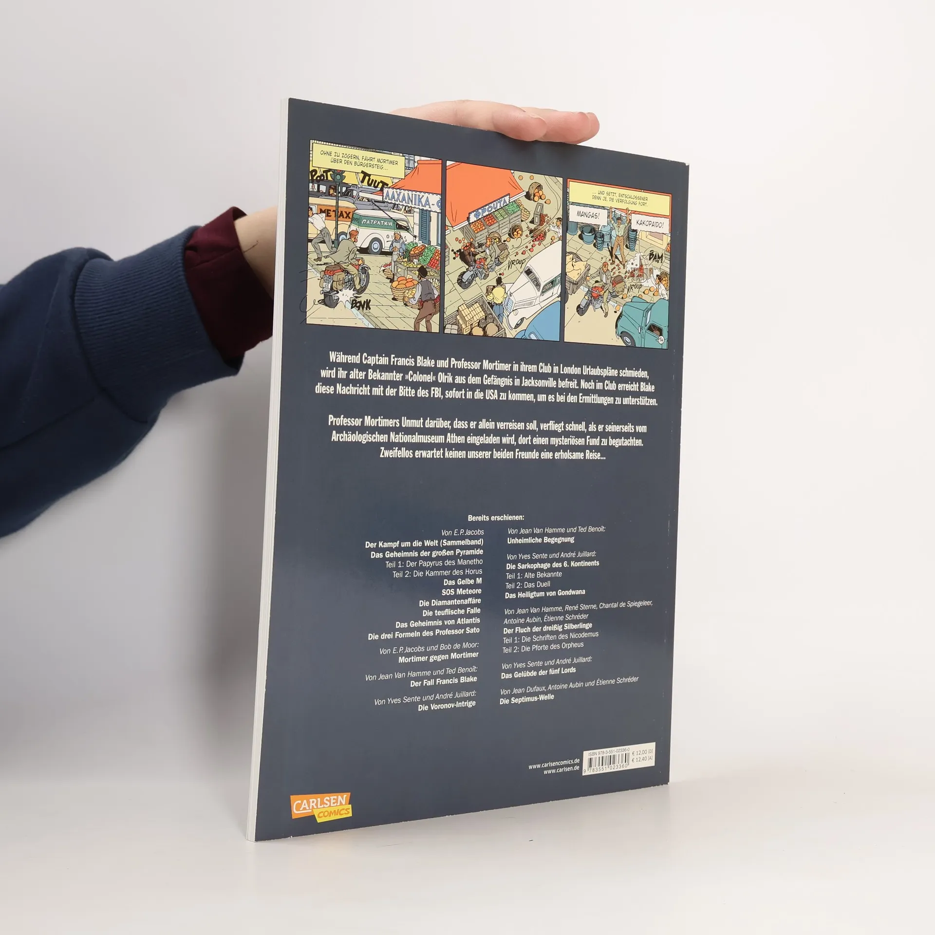 Ein Judas-Lohn? Während Captain Francis Blake und Professor Mortimer in ihrem Club in London Urlaubspläne schmieden, wird ihr alter Bekannter „Colonel“ Olrik aus dem Gefängnis in Jacksonville befreit. Noch im Club erreicht Blake diese Nachricht mit der Bitte des FBI, sofort in die USA zu kommen, um bei den Ermittlungen zu helfen. Professor Mortimers Unmut darüber, dass er allein verreisen soll, verfliegt schnell als er seinerseits vom Archäologischen Nationalmuseum Athen eingeladen wird, dort einen mysteriösen Fund zu begutachten. Zweifellos erwartet keinen unserer beiden Freunde eine erholsame Reise... Diese Geschichte ist der erste Teil eines Doppelabenteuers, das in Band 17 der Reihe weitergeführt wird. Die Serie „Blake und Mortimer“ Die Serie um die beiden Briten Hauptmann Francis Blake und Professor Philip Mortimer gehört zu den besten und erfolgreichsten Reihen für erwachsene Comicleser. Mit dem Charme und dem Duktus der 1950er Jahre entführt sie die Leser in spannende und manchmal mystische Welten. Gerade diese Mischung aus realer Geschichte und Elementen aus Mythologie, Science-Fiction und Thriller macht die Faszination aus. Wenn diese Melange von zwei echten britischen Gentlemen dargereicht wird, muss man nur noch Hut und Mantel an der Garderobe abgeben und sich in den bequemen Sessel eines Londoner Clubs sinken lassen, um vollends in die Serie einzutauchen.