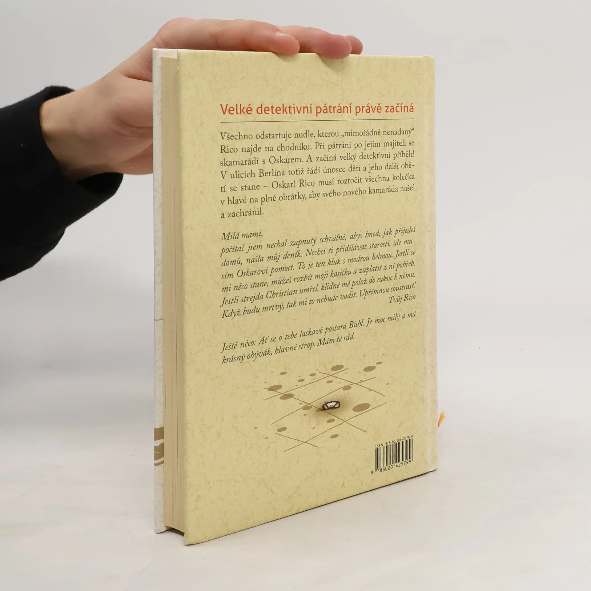 Rico je kluk, který pomalu chápe, má nulovou prostorovou orientaci a chabou paměť, zato příkladně nastavený žebříček hodnot a ryzí charakter. Jeho nový kamarád Oskar je mladší, mimořádně inteligentní, zato bojácný. Na ulici proto nikdy nevyjde bez své nepostradatelné helmy. Děj této nezapomenutelné knihy nás zavede do současného Berlína, kde právě řádí únosce dětí. Rico se mu dostane na stopu a vzápětí překonává sám sebe. V deníkových záznamech sledujeme se zatajeným dechem jeho pátrání, které nás až do poslední stránky udržuje ve stálém napětí.