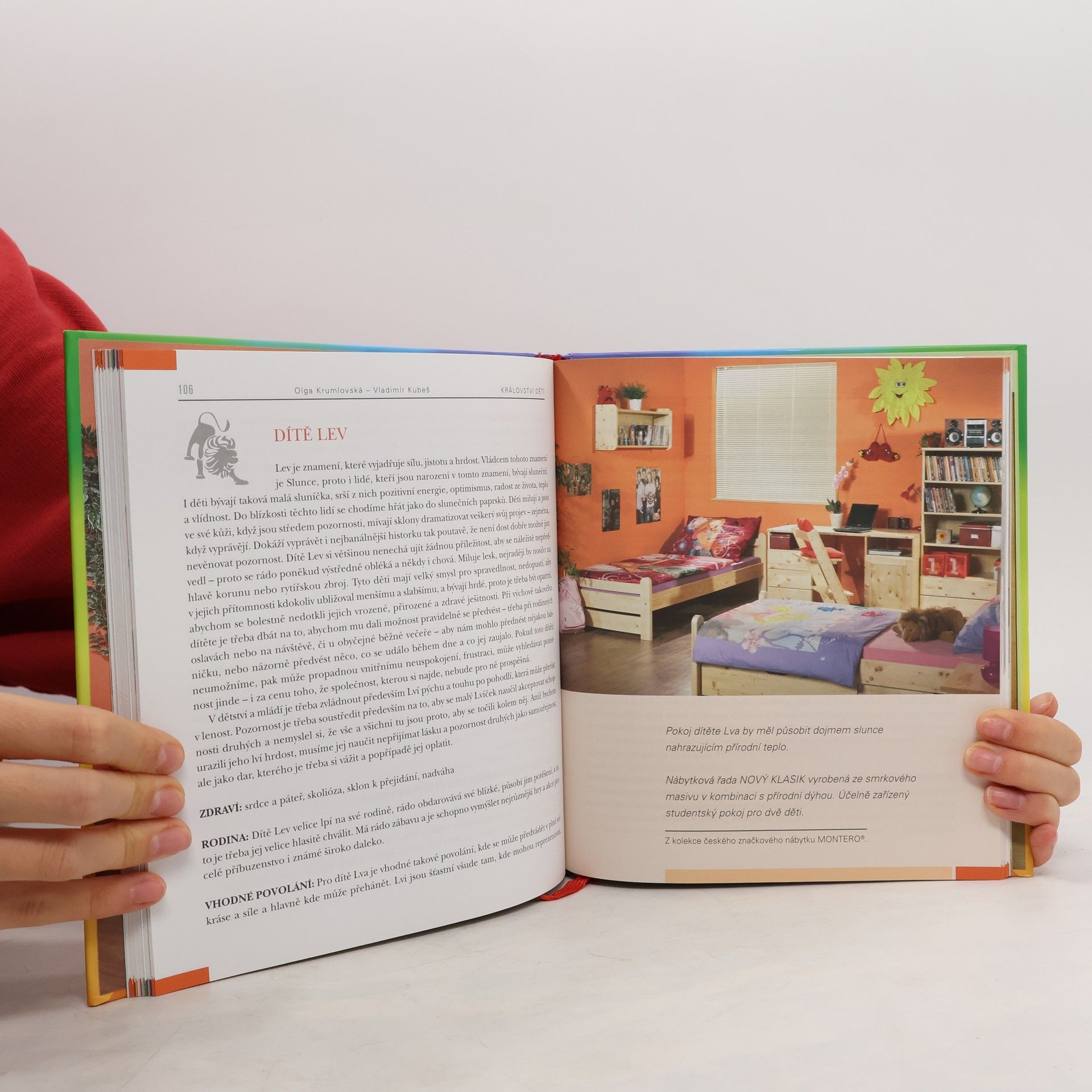 Populární a srozumitelnou formou napsaná kniha o tom, jak ideálně vytvořit dětem jejich království. Vedle odborných poznatků ing. Vladimíra Kubeše (psaných srozumitelně a stručně) je kniha postavena především na kouzelném čínském umění feng-shui (neboli rozmístění předmětů v prostoru tak, aby působily pozitivně svou energií). Dále se Olga Krumlovská zabývá léčivým působením barev nejen nábytku, ale také stěn, doplňků a povlečení tak, aby působily svou vzájemnou kombinací příznivě. Věnuje se správnému výběru hraček a doplňků tak, aby přinášely pohodu a štěstí. V publikaci samozřejmě nechybí hodnocení dětských pokojů podle astrologie – co které znamení v pokoji potřebuje, preferuje, nebo naopak by mít rozhodně nemělo. V knize nechybí barevné fotografie konkrétních typů dětského pokoje i různé zajímavé nápady.