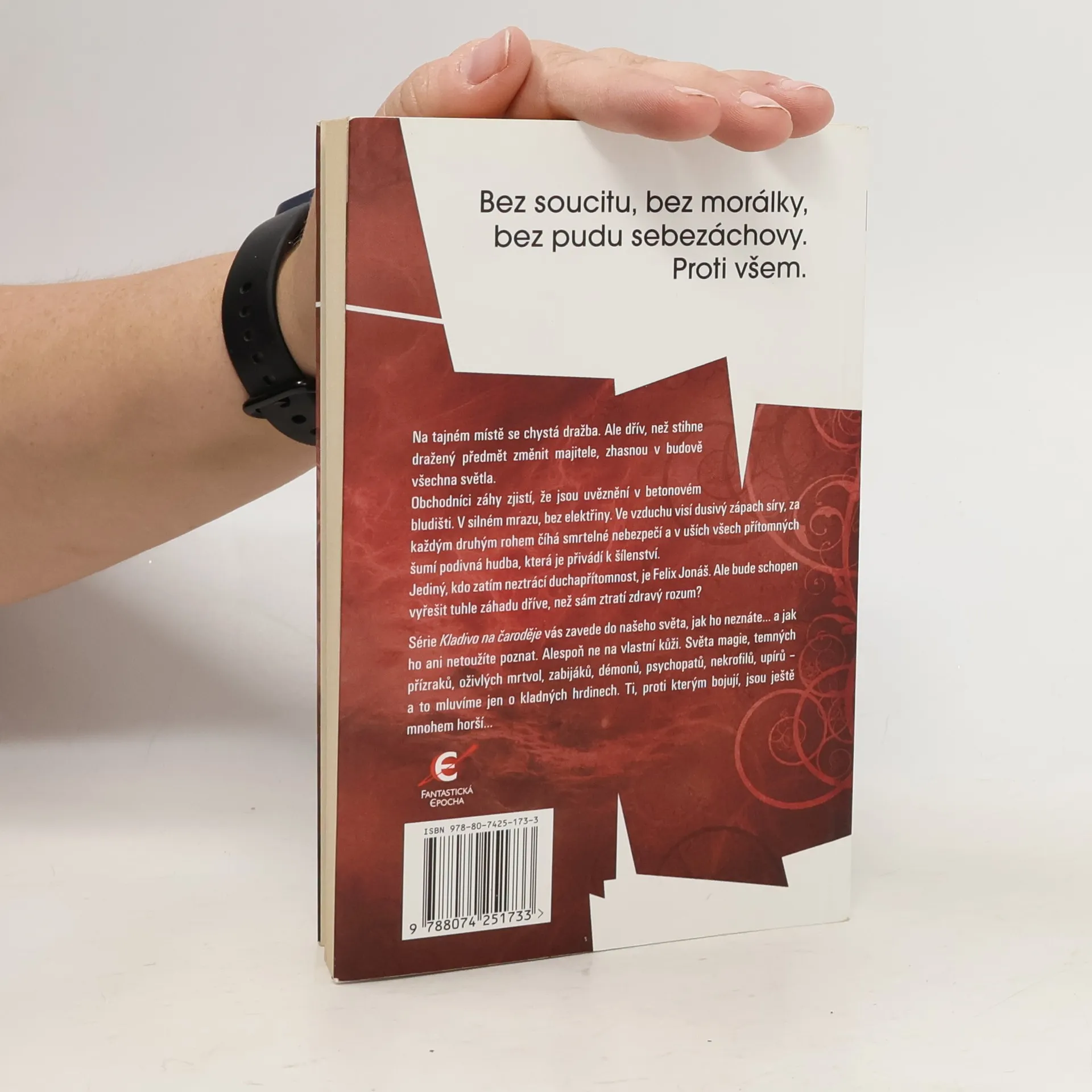 Na tajném místě se chystá dražba. Ale dřív, než stihne dražený předmět změnit majitele, zhasnou v budově všechna světla. Obchodníci záhy zjistí, že jsou uvěznění v betonovém bludišti. V silném mrazu, bez elektřiny. Ve vzduchu visí dusivý zápach síry, za každým druhým rohem číhá smrtelné nebezpečí a v uších všech přítomných šumí podivná hudba, která je přivádí k šílenství. Jediný, kdo zatím neztrácí duchapřítomnost, je Felix Jonáš. Ale bude schopen vyřešit tuhle záhadu dříve, než sám ztratí zdravý rozum? Série Kladivo na čaroděje vás zavede do našeho světa, jak ho neznáte… a jak ho ani netoužíte poznat. Alespoň ne na vlastní kůži. Světa magie, temných přízraků, oživlých mrtvol, zabijáků, démonů, psychopatů, nekrofilů, upírů – a to mluvíme jen o kladných hrdinech. Ti, proti kterým bojují, jsou ještě mnohem horší…