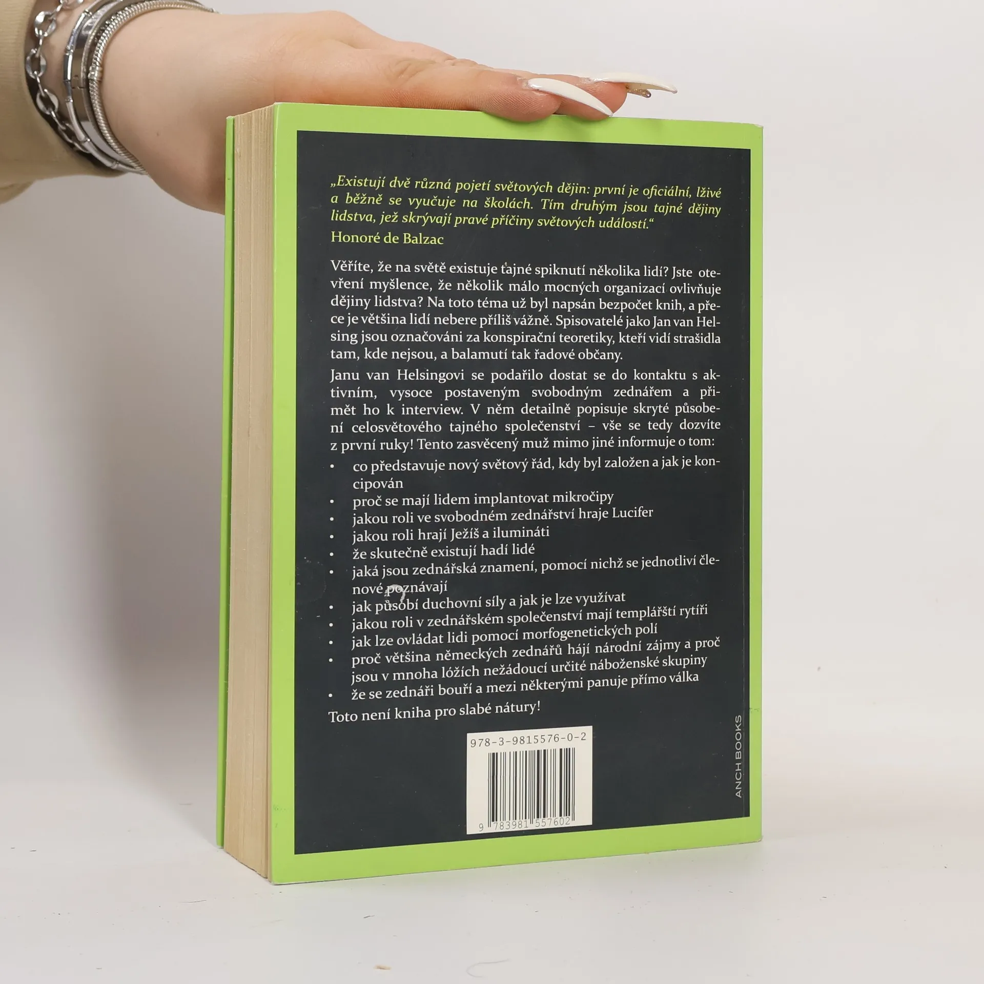 Věříte, že na světě existuje tajné spiknutí několika lidí? Jste otevření myšlence, že několik málo mocných organizací ovlivňuje dějiny lidstva? Na toto téma už byl napsán bezpočet knih, a přece je většina lidí nebere příliš vážně. Spisovatelé jako Jan van Helsing jsou označováni za konspirační teoretiky, kteří vidí strašidla tam, kde nejsou, a balamutí tak řadové občany. Janu van Helsingovi se podařilo dostat do kontaktu s aktivním, vysoce postaveným svobodným zednářem a přimět ho k interview. V něm detailně popisuje skryté působení celosvětového tajného společenství – vše se tedy dozvíte z první ruky! Tento zasvěcený muž mimo jiné informuje o tom: – co představuje nový světový řád, kdy byl založen a jak je koncipován – proč se mají lidem implantovat mikročipy – proč se má v budoucnu masivně snížit počet lidí – že člověk nepochází z opice – jakou roli hrají Ježíš a ilumináti – že skutečně existují hadí lidé – jaká jsou zednářská znamení, pomocí nichž se jednotliví členové poznávají – jak působí duchovní síly a jak je lze využívat – jakou roli v rámci zednářského společenství zastávají templářští rytíři – jak lze ovládat lidi pomocí morfogenetických polí – proč většina německých zednářů hájí národní zájmy a proč jsou v mnoha lóžích nežádoucí určité náboženské skupiny – že se zednáři bouří a mezi některými panuje přímo válka Toto není kniha pro slabé nátury!