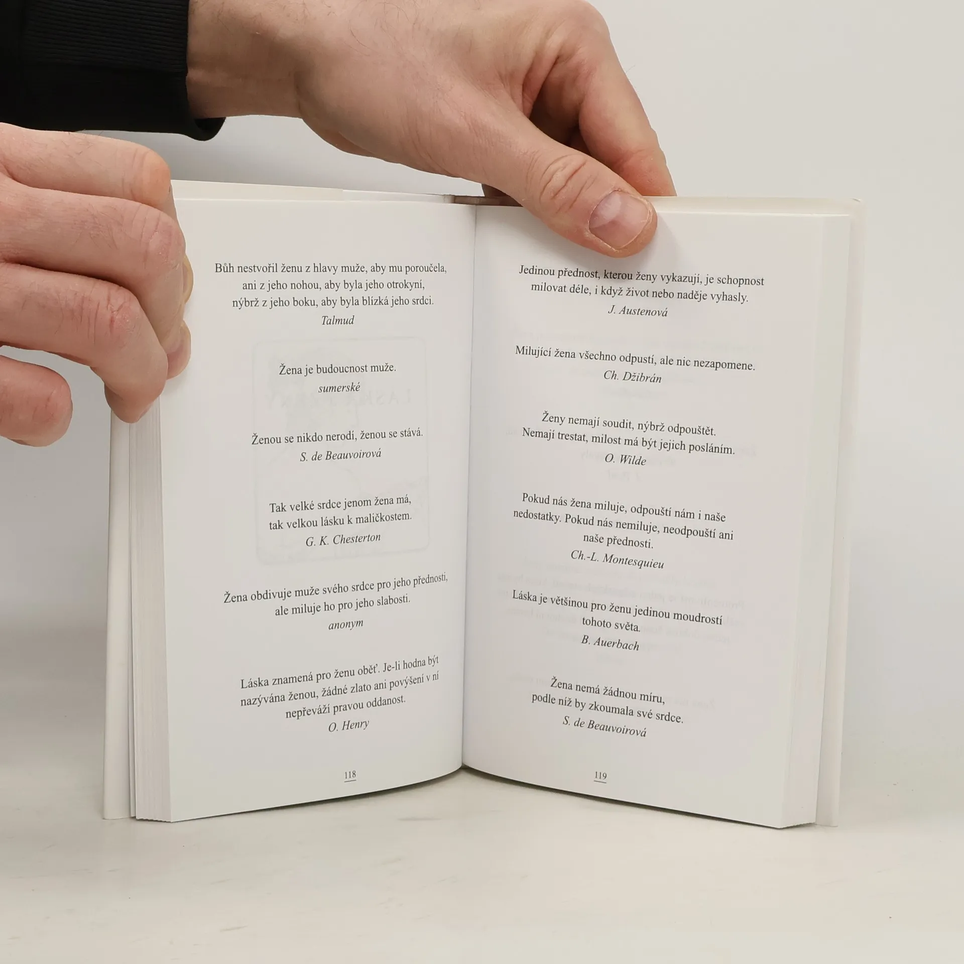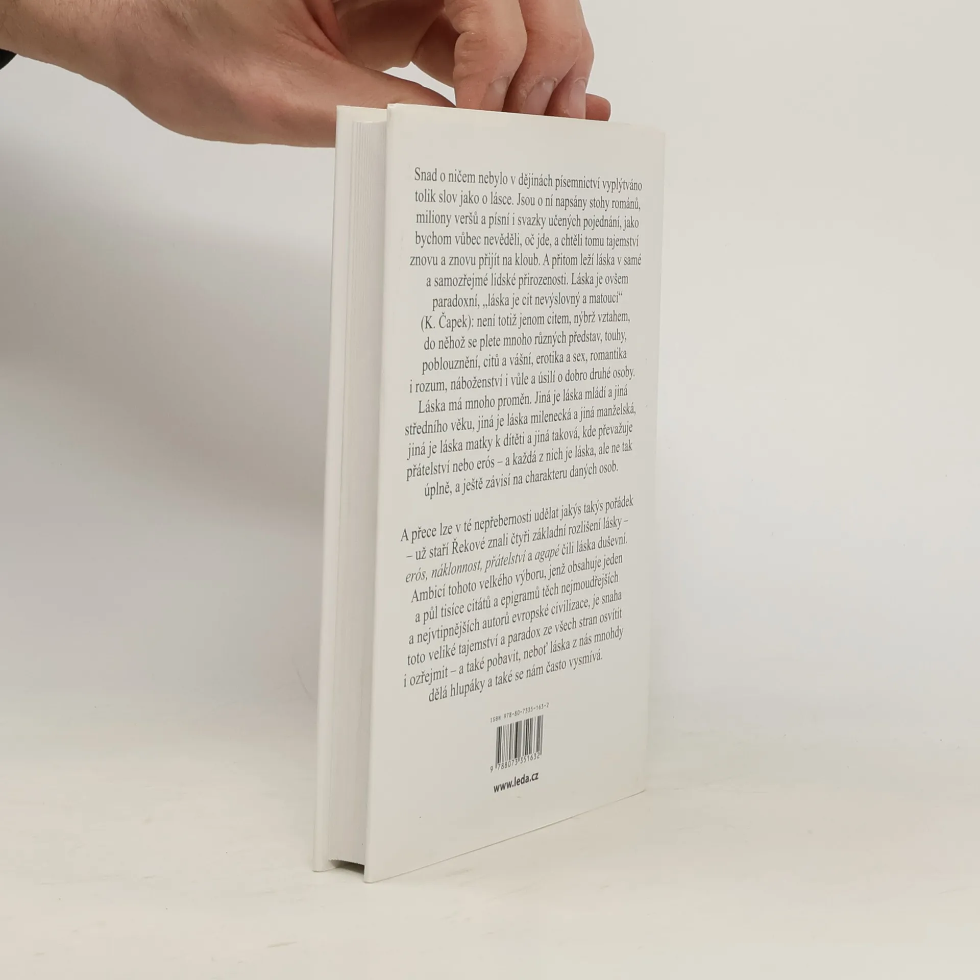 Snad o ničem nebylo v dějinách písemnictví vyplýtváno tolik slov jako o lásce. Jsou o ní napsány stohy románů, miliony veršů a písní i svazky učených pojednání, jako bychom vůbec nevěděli, oč jde, a chtěli tomu tajemství znovu a znovu přijít na kloub. A přitom leží láska v samé a samozřejmé lidské přirozenosti. Láska je ovšem paradoxní, „láska je cit nevýslovný a matoucí“ (K. Čapek): není totiž jenom citem, nýbrž vztahem, do něhož se plete mnoho různých představ, touhy, poblouznění, citů a vášní, erotika a sex, romantika i rozum, náboženství i vůle a úsilí o dobro druhé osoby. Láska má mnoho proměn. Jiná je láska mládí a jiná středního věku, jiná je láska milenecká a jiná manželská, jiná je láska matky k dítěti a jiná taková, kde převažuje přátelství nebo erós – a každá z nich je láska, ale ne tak úplně, a ještě závisí na charakteru daných osob. A přece lze v té nepřebernosti udělat jakýs takýs pořádek – už staří Řekové znali čtyři základní rozlišení lásky – erós, náklonnost, přátelství a agapé čili láska duševní. Ambicí tohoto velkého výboru, jenž obsahuje jeden a půl tisíce citátů a epigramů těch nejmoudřejších a nejvtipnějších autorů evropské civilizace, je snaha toto veliké tajemství a paradox ze všech stran osvítit i ozřejmit – a také pobavit, neboť láska z nás mnohdy dělá hlupáky a také se nám často vysmívá.