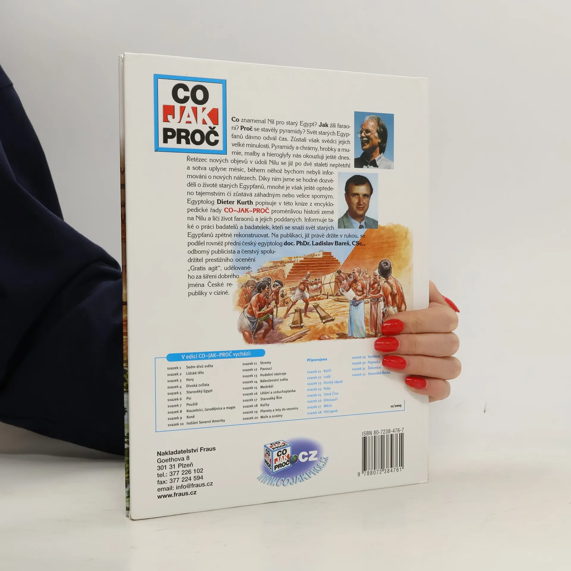 Co znamenal Nil pro starý Egypt? Jak žili faraoni? Proč se stavěly pyramidy? Svět starých Egypťanů dávno odvál čas. Zůstali však svědci jejich velké minulosti. Pyramidy a chrámy, hrobky a mumie, malby a hieroglyfy nás okouzlují ještě dnes. Řetězec nových objevů v údolí Nilu se již po dvě staletí nepřetrhl a sotva uplyne měsíc, během něhož bychom nebyli informováni o nových nálezech. Díky nim jsme se hodně dozvěděli o životech starých Egypťanů, mnohé je však ještě opředeno tajemstvím či zůstává záhadným nebo velice sporným. Egyptolog Dieter Kurth popisuje v této knize z encyklopedické řady CO-JAK-PROČ proměnlivou historii země na Nilu a líčí život faraonů a jejich poddaných. Informuje také o práci badatelů a badatelek, kteří se snaží svět starých Egypťanů zpětně rekonstruovat. Na publikaci, jíž právě držíte v rukou, se podílel rovněž přední český egyptolog doc. PhDr. Ladislav Bareš, CSc., odborný publicista a čerstvý spoludržitel prestižního ocenění "Gratis agit", udělovaného za šíření dobrého jména České republiky v cizině.