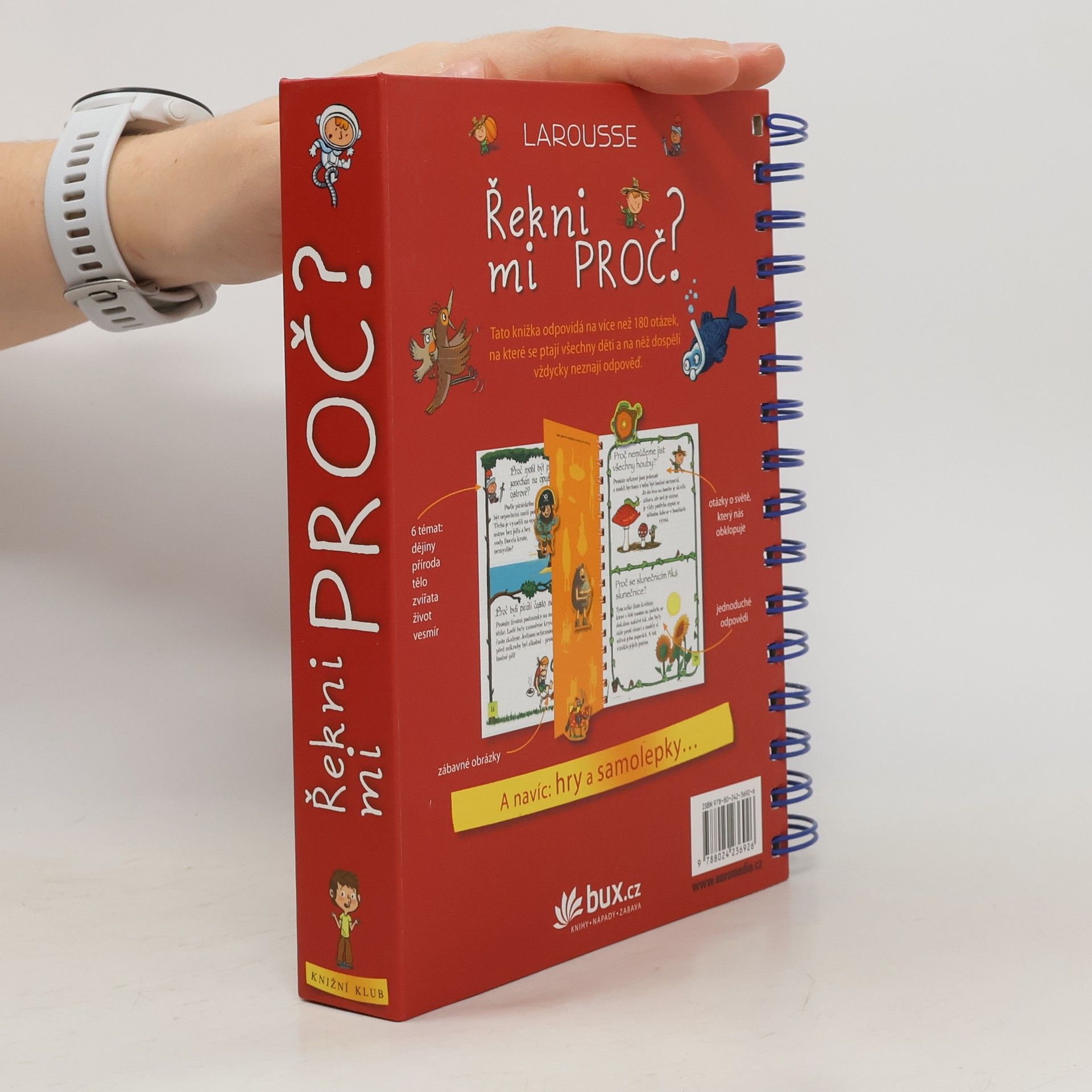 Knížka v kroužkové vazbě má 118 stránek a nacházejí se v ní odpovědi na 180 běžných dětských otázek. Jsou seřazené podle témat do šesti oblastí: dějiny, příroda, lidské tělo, zvířata, život a vesmír. Dozvíte se například, proč je nebe modré, proč Egypťané stavěli pyramidy, proč chodíme do školy, proč se potíme, proč kočky předou a spoustu, spoustu dalšího. Každou tematickou kapitolu navíc doplňují kvízy a samolepky.