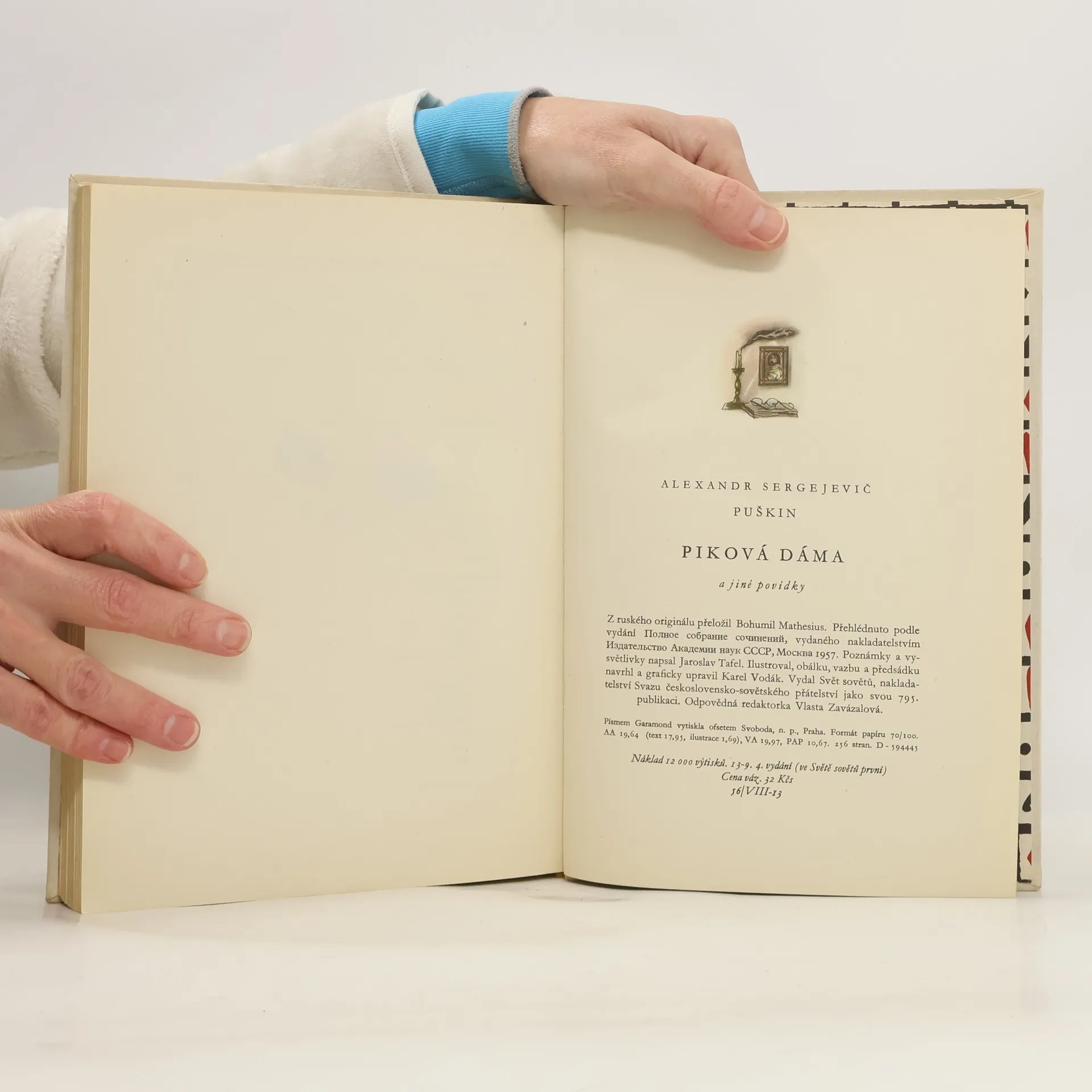Alexandr Sergejevič Puškin: Piková dáma a jiné povídky. Rok 1960, 4. vydání (ve Světě sovětů první), česky, vydal: Svět sovětů, nakladatelství Svazu československo-sovětského přátelství. Jedná se o následující povídky: 1.) Povídky nebožtíka Ivana Petroviče Bělkina (Výstřel, Metelice, Majitel pohřebního ústavu, Staniční dozorce, Slečna selka) 2.) Dubrovskij 3.) Piková dáma 4.) Kyrdžali 5.) Kapitánská dcerka (Gardový seržán, Průvodce, Pevnost, Souboj, Láska, Vzpoura Pugačovova, Zteč, Nezvaný host, Rozloučení, Obléhání města, Ve vzbouřené vsi, Sirotek, Vězení, Soud).