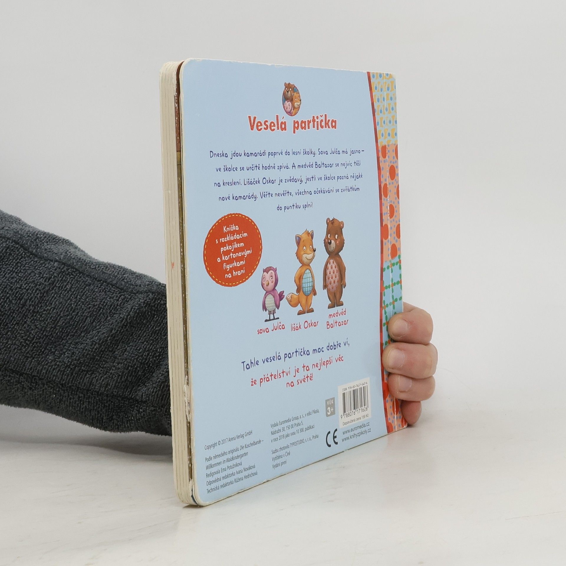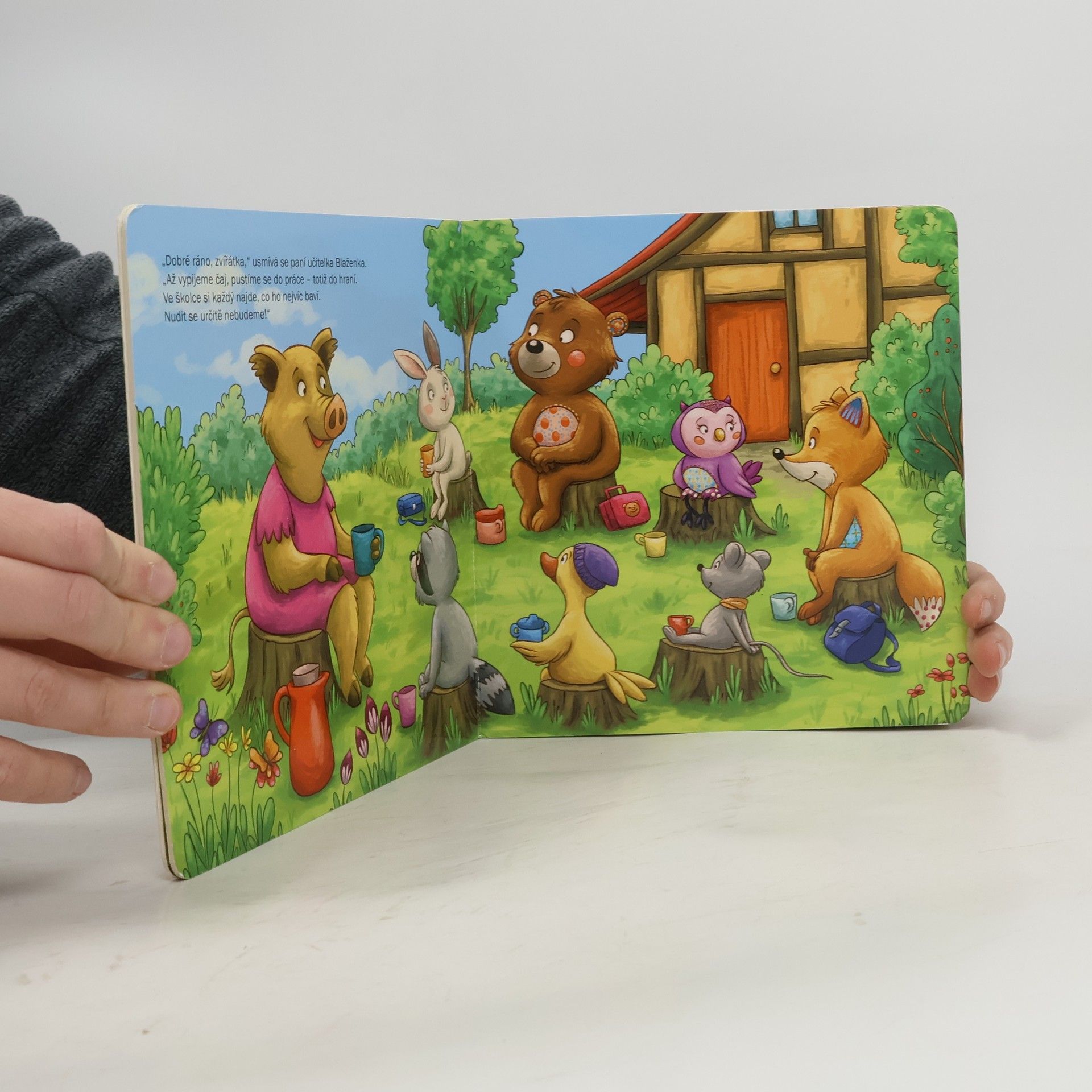 Kamarádi sova Julča, medvěd Baltazar a lišák Oskar jdou dnes poprvé do lesní školky. Julča doufá, že se ve školce hodně zpívá. Baltazar se nejvíc těší na kreslení a lišáček Oskar je zvědavý, jestli ve školce pozná nové kamarády. Všechna přání se zvířátkům jistě splní! – Půvabná knížka s rozkládacím pokojíkem a kartonovými figurkami na hraní potěší všechny nejmenší děti.