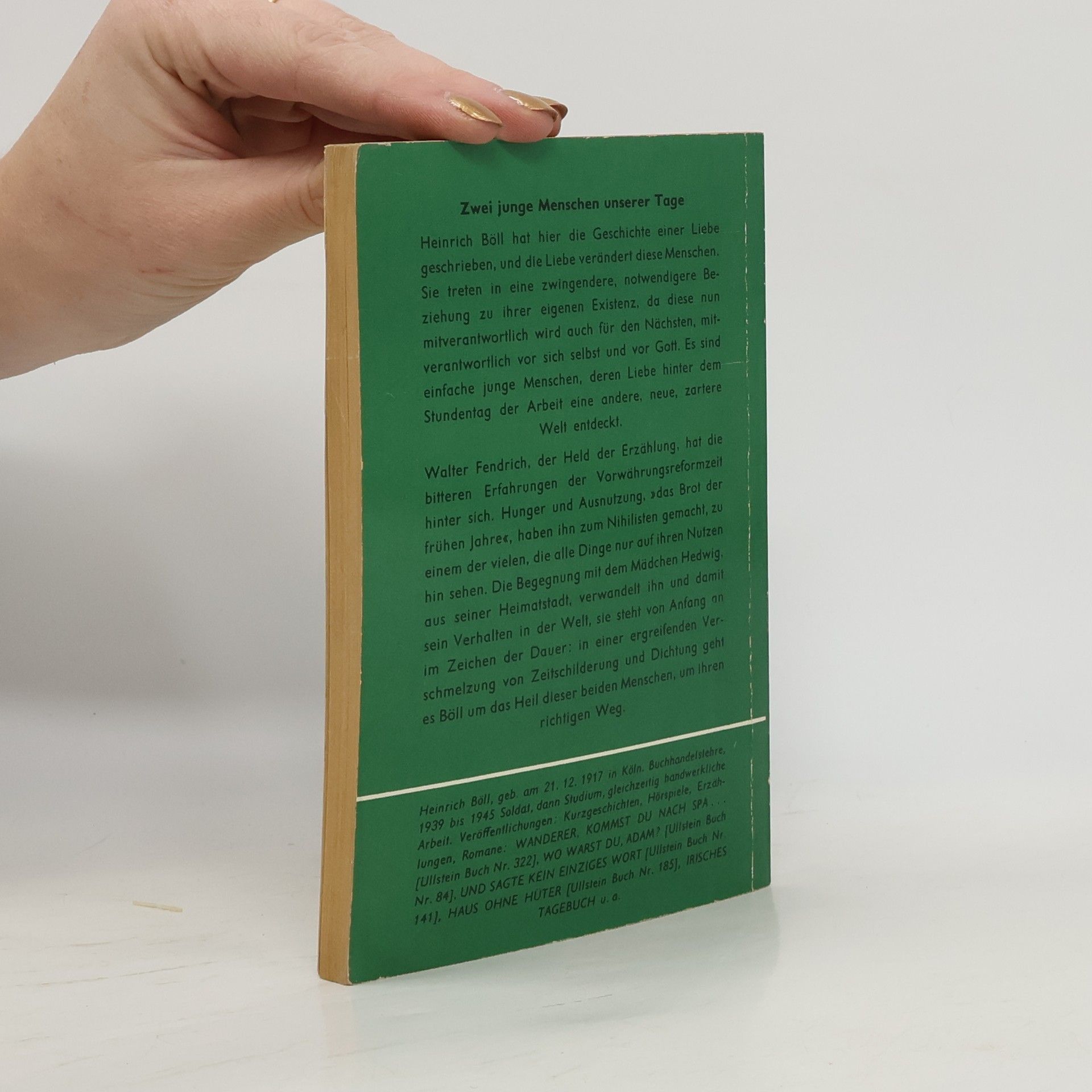 »Ich stellte mich an die Treppe zum Bahnsteig und dachte: blond, zwanzig Jahre, kommt in die Stadt, um Lehrerin zu werden ... Walter Fendrich, der sich in der Nachkriegszeit planlos und kurzfristig als Banklehrling, Verkäufer und Tischlerlehrling versuchte, erhält eines Tages einen Brief seines Vaters, der ihn bittet, die Tochter eines Kollegen vom Bahnhof abzuholen. Das Zusammentreffen mit der zwanzigjährigen Hedwig, die er zuletzt nur flüchtig als Kind gesehen hatte, wird für Walter zur schicksalhaften Begegnung. Heinrich Böll gelingt es, kleinbürgerliche Schauplätze, die Atmosphäre der Hungerjahre und der Wirtschaftsblüte im Rahmen einer ungewöhnlichen Liebesgeschichte mit sparsamen Mitteln souverän zu vergegenwärtigen.