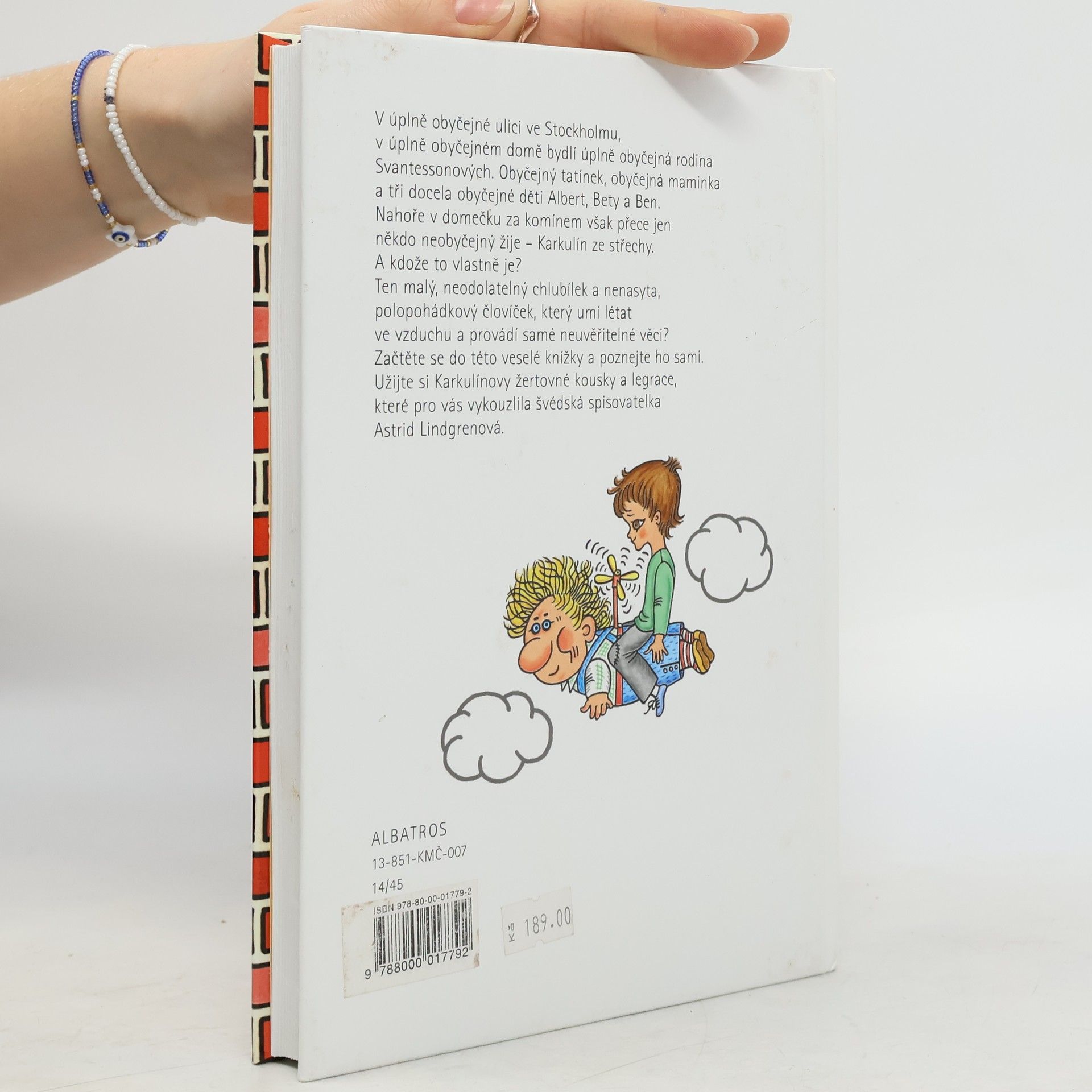V úplně obyčejné ulici ve Stockholmu, v úplně obyčejném domě bydlí úplně obyčejná rodina Svantessonových. Obyčejný tatínek, obyčejná maminka a tři docela obyčejné děti Albert, Bety a Ben. Nahoře v domečku za komínem však přece jen někdo neobyčejný žije Karkulín ze střechy. A kdože to vlastně je? Ten malý, neodolatelný chlubílek a nenasyta, polopohádkový človíček, který umí létat ve vzduchu a provádí samé neuvěřitelné věci? Otevřte tuhle knížku a poznáte ho sami. Užijte si Karkulínovy žertovné kousky a legrace, které pro vás vykouzlila Astrid Lindgrenová.