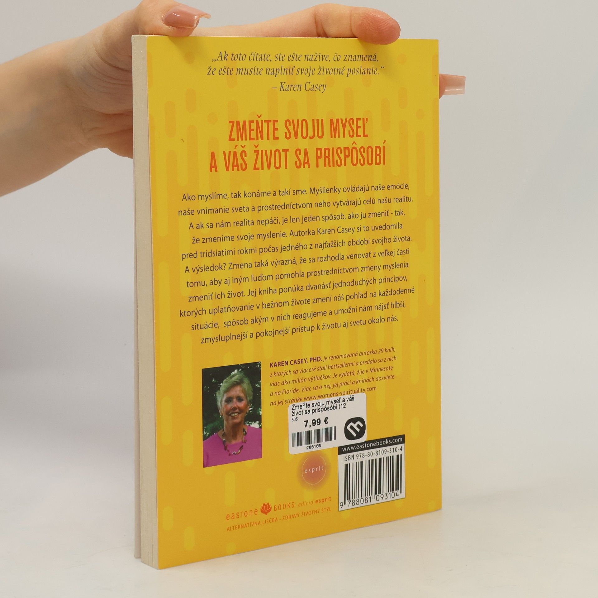 Ako myslíme, tak konáme a takí sme. Myšlienky ovládajú naše emócie, naše vnímanie sveta a prostredníctvom neho vytvárajú celú našu realitu. A ak sa nám realita nepáči, je len jeden spôsob ako ju zmeniť – tak, že zmeníme svoje myslenie. Autorka Karen Casey si to uvedomila pred 30 rokmi počas jedného z najťažších období svojho života. A výsledok? Zmena taká výrazná, že sa rozhodla venovať z veľkej časti tomu, aby aj iným ľuďom pomohla prostredníctvom zmeny myslenia zmeniť ich život. Jej kniha ponúka dvanásť jednoduchých princípov, ktorých uplatňovanie v bežnom živote zmení náš pohľad na každodenné situácie, spôsob, akým v nich reagujeme, a umožní nám nájsť hlbší, zmysluplnejší a pokojnejší prístup k životu aj svetu okolo nás.