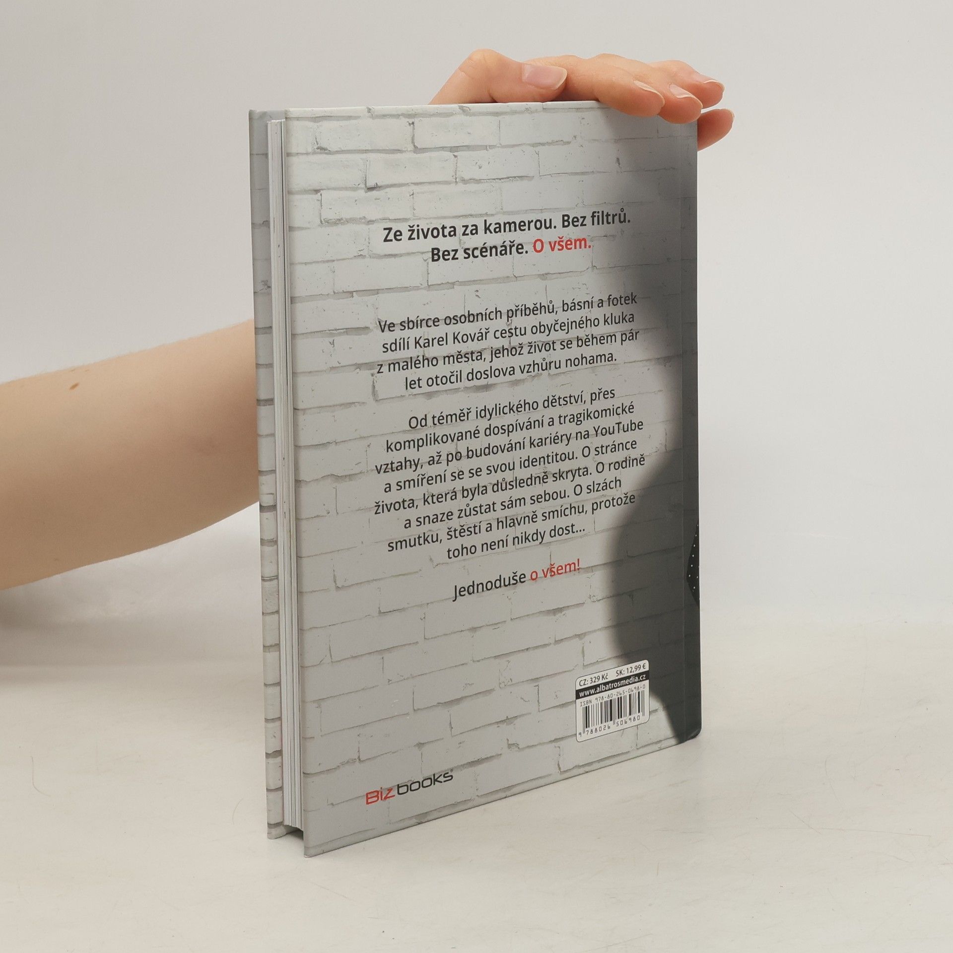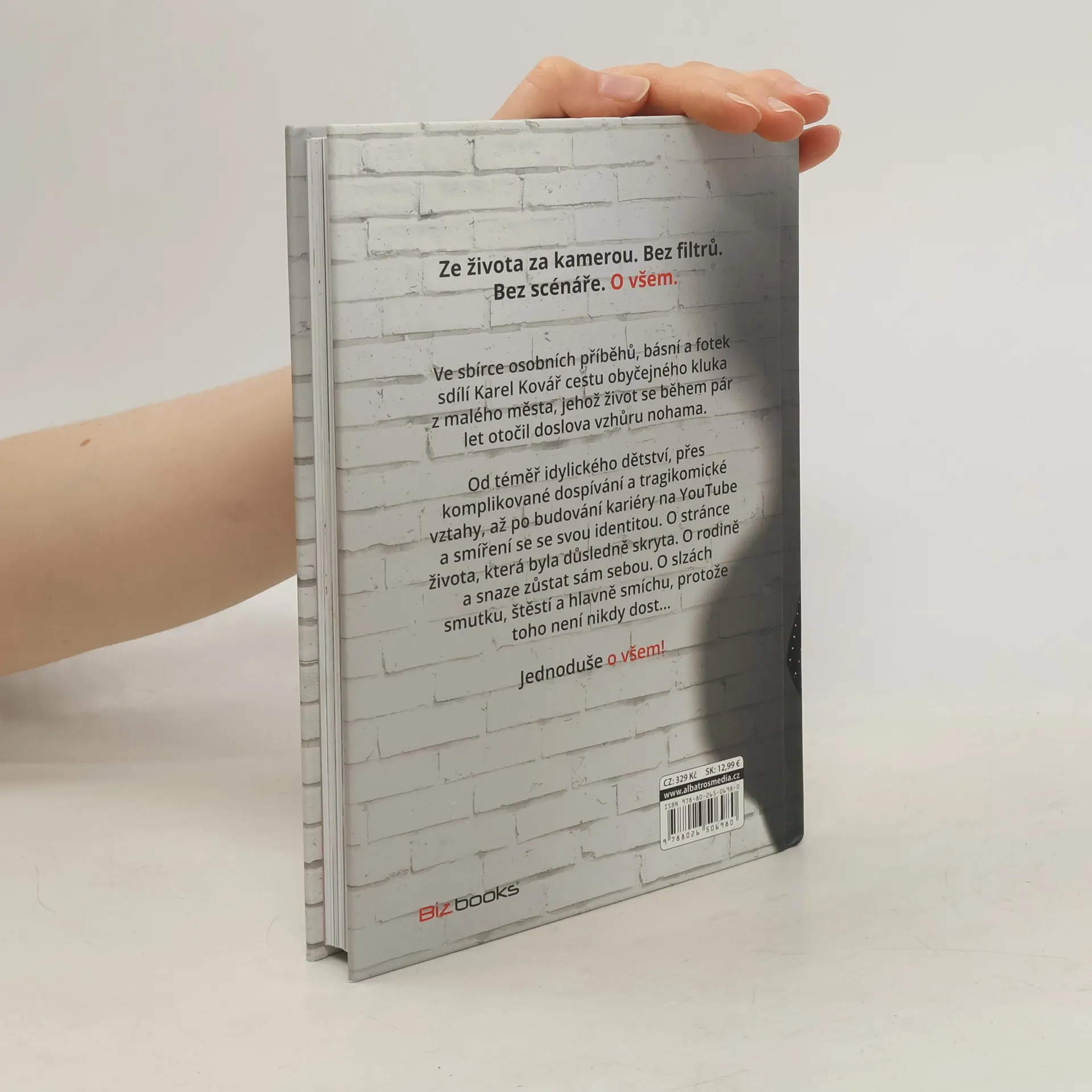 Bez filtrů. Bez scénáře. O všem. Ve sbírce osobních příběhů, básní a fotek sdílí Karel Kovář cestu obyčejného kluka z malého města, jehož život se během pár let otočil doslova vzhůru nohama. Od téměř idylického dětství, přes komplikované dospívání a tragikomické vztahy, až po budování kariéry na YouTube a smíření se se svou identitou. O stránce života, která byla důsledně skryta. O rodině a snaze zůstat sám sebou. O slzách smutku, štěstí a hlavně smíchu, protože toho není nikdy dost–… Jednoduše o všem!
