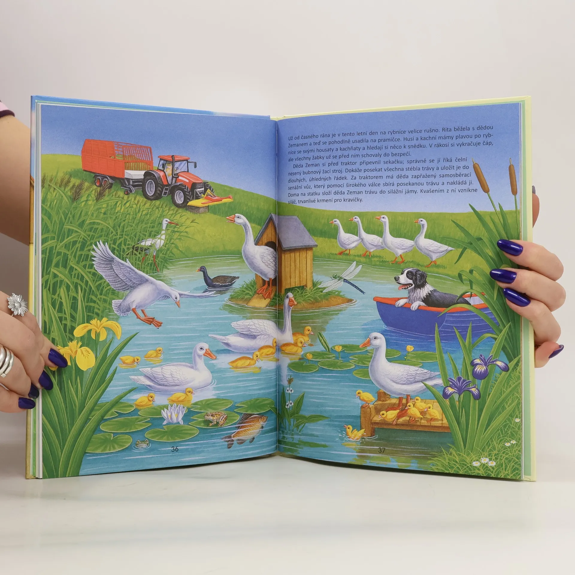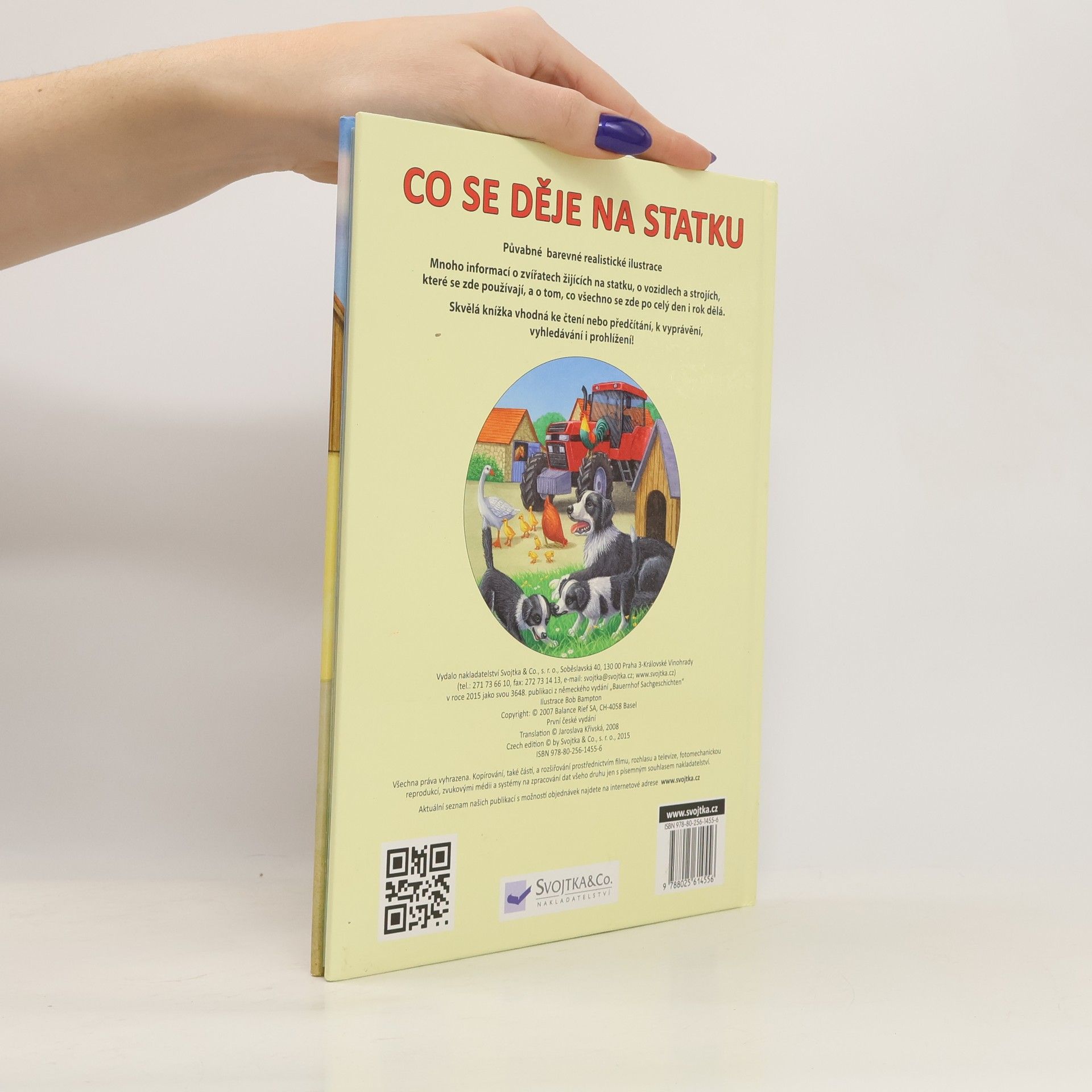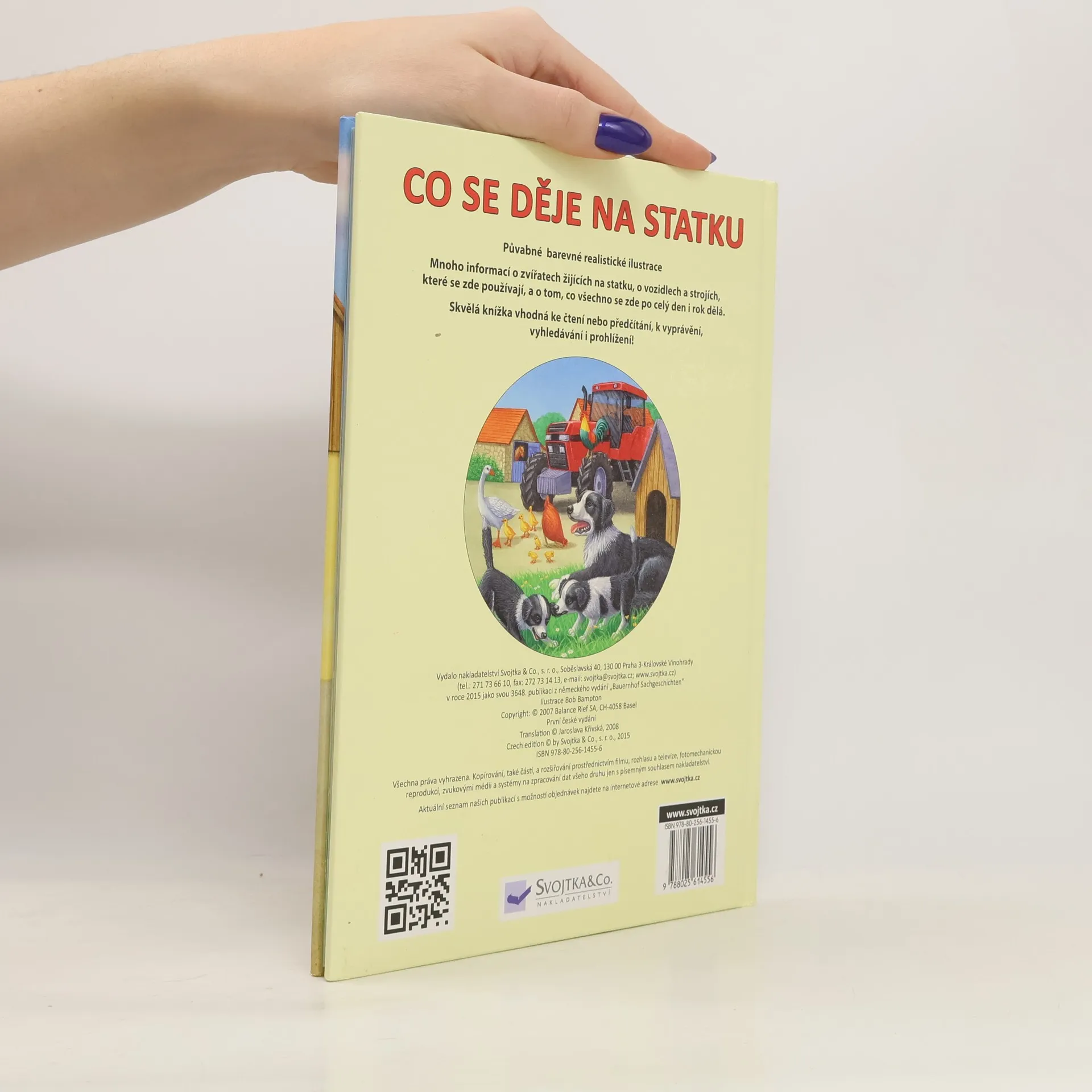 Vyprávění o zvířatech žijících na statku, o vozidlech a strojích, které se zde používají, a o tom, co všechno se zde po celý den i rok dělá. Skvělá knížka ke čtení nebo předčítání, k vyprávění, vyhledávání a prohlížení. Kapitoly: Den na statku, Kdo žije na statku, Zvířata a co všechno dělají, Vozidla a stroje při práci, Co je co na statku).
