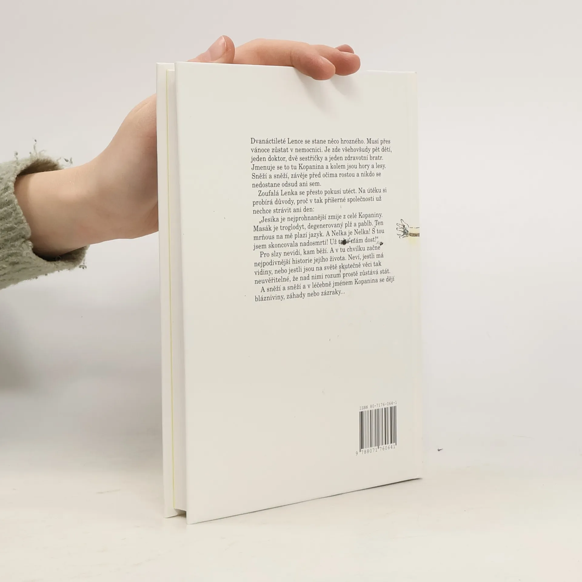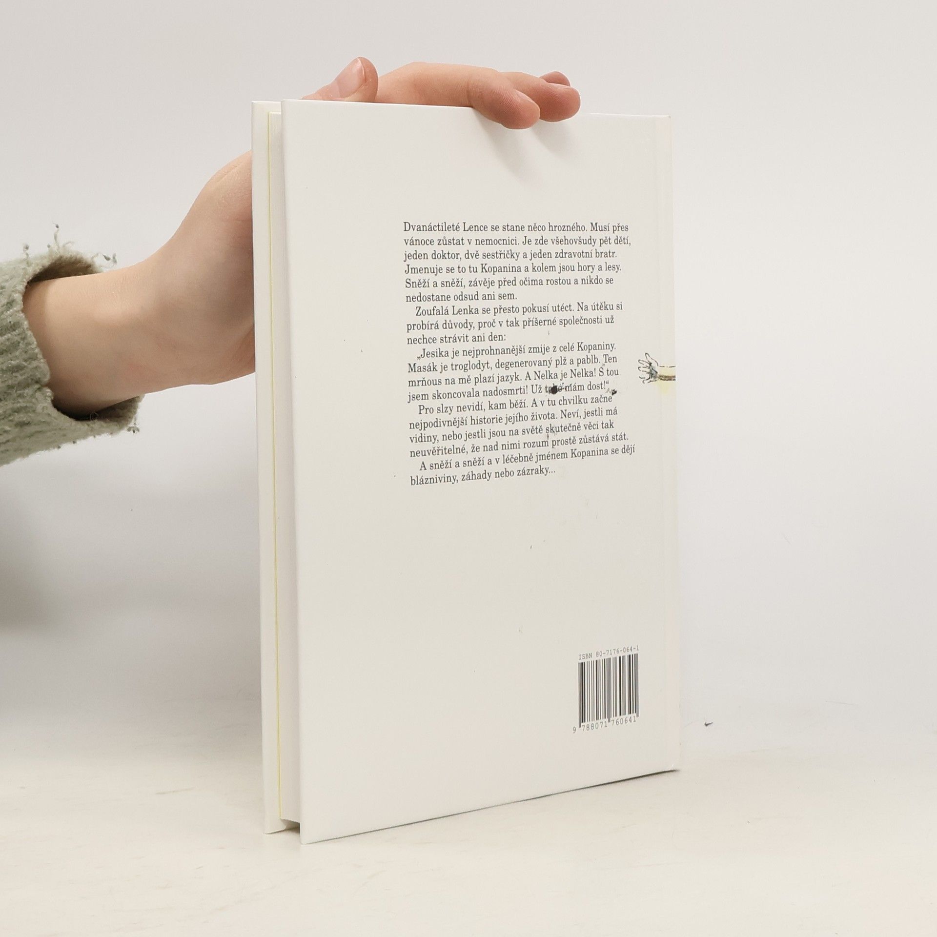 Dvanáctileté Lence se stane něco hrozného. Musí přes vánoce zůstat v nemocnici. Je zde všehovšudy pět dětí, jeden doktor, dvě sestřičky a jeden zdravotní bratr. Jmenuje se to tu Kopanina a kolem jsou hory a lesy. Sněží a sněží, závěje před očima rostou a nikdo se nedostane odsud ani sem. Zoufalá Lenka se přesto pokusí utéct. Na útěku si probírá důvody, proč v tak příšerné společnosti už nechce strávit ani den: "Jesika je nejprohnanější zmije z celé Kopaniny. Masák se troglodyt, degenerovaný plž a pablb. Ten mrňous na mě plazí jazyk. A Nelka je Nelka! S tou jsem skoncovala nadosmrti! Už toho mám dost!" Pro slzy nevidí, kam běží. A v tu chvilku začně nejpodivnější historie jejího života. Neví, jestli má vidiny, nebo jestli jsou na světě skutečně věci tak neuvěřitelné, že nad nimi rozum prostě zůstává stát. A sněží a sněží a v léčebně jménem Kopanina se dějí blázniviny, záhady nebo zázraky...