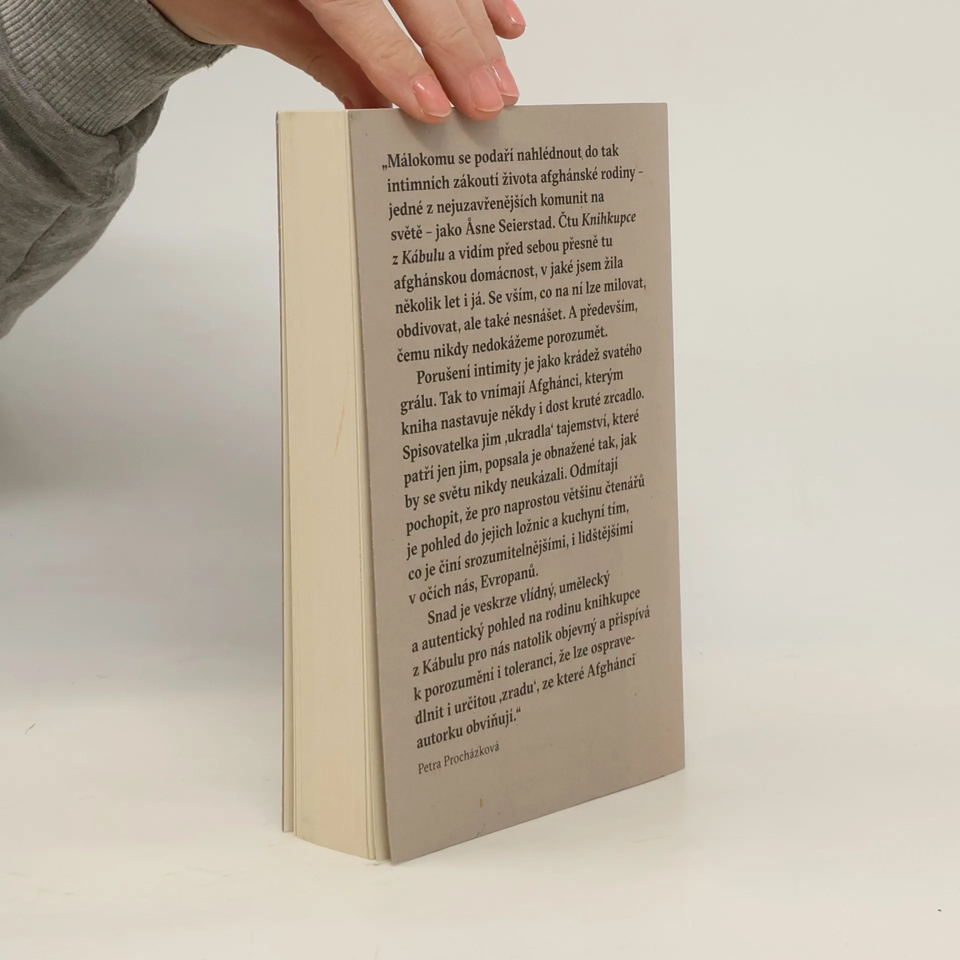 11. září 2001 – tohle datum změnilo náš pohled na Afghánistán. Krátce po americké vojenské odvetě přijela do Kábulu také válečná reportérka Åsne Seierstad. Nenapsala knihu o boji s terorismem, ale o jedné afghánské rodině. Sultán Chán, knihkupec z Kábulu, ji nechal zblízka pozorovat život v jeho domácnosti. Vztahy mezi první a druhou ženou, dcerami a syny i dalšími příbuznými. Sultán chápe svou práci jako životní misi – chce Afghánce vzdělávat a nechávat svobodně zaznít všechny názory. Doma ale platí jen jeho slovo. Rozhoduje o celé rodině. Kdo si koho může vzít, s kým se smí stýkat, kde a zda vůbec může pracovat. Nemá rád burky, ale ženy s vlastním rozumem také ne. „Čtu Knihkupce z Kábulu a vidím před sebou přesně tu afghánskou domácnost, v jaké jsem žila několik let i já. Se vším, co na ní lze milovat, obdivovat, ale i nesnášet,“ napsala Petra Procházková. Åsne Seierstad pronikla do afghánské každodennosti tak hluboko, jak se to nepodařilo snad žádné ženě „ze Západu“.