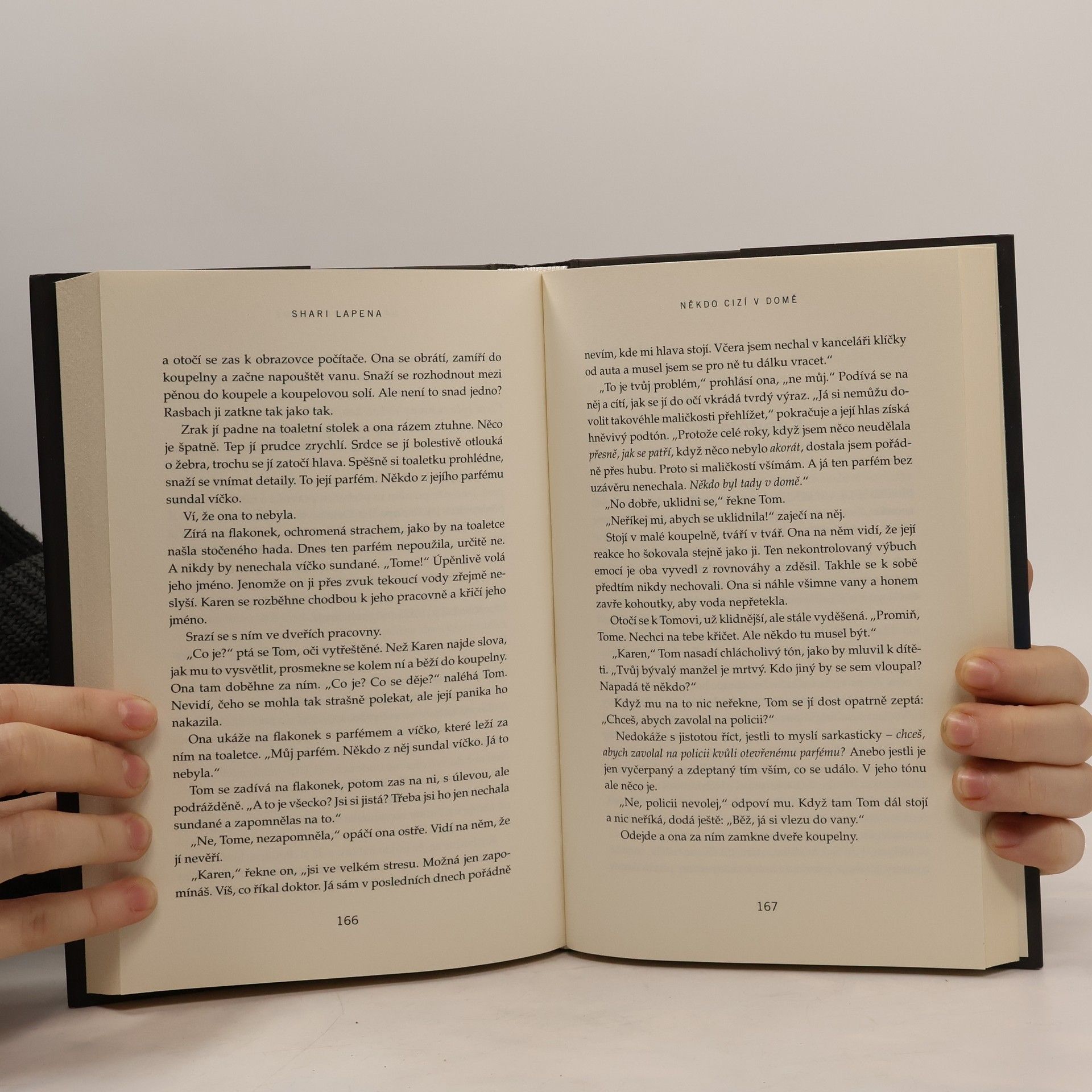 V téhle útulné čtvrti spokojených domovů zůstávají nebezpečné lži uzavřeny za dveřmi… Shari Lapena, autorka thrilleru roku 2017 Manželé odvedle, přichází s dalším rodinným dramatem plným tajemství a nečekaných zvratů, které nikdy nepřestanou překvapovat. Karen a Tom Kruppovi jsou šťastní – vzali se teprve nedávno a vlastní nádherný dům poblíž New Yorku. Jednoho dne se Tom vrátí domů a zjistí, že Karen zmizela – její auto je pryč a zdá se, že odjela ve spěchu. Nevzala si dokonce ani kabelku, telefon, doklady. Krátce nato se Tom dozví, že Karen měla nehodu a leží v nemocnici s otřesem mozku a ztrátou paměti. Po čase se Karen, odhodlaná vyléčit se a zapomenout, vrací s Tomem domů. Ale zdá se, že se tam něco změnilo. Něco není v pořádku. Někdo tam byl. Někdo cizí. Jenže v tomhle domě je každý cizí. Každý má něco, co by podle něj mělo zůstat skryto. Něco, kvůli čemu by raději vraždil, jen aby si to mohl nechat pro sebe...