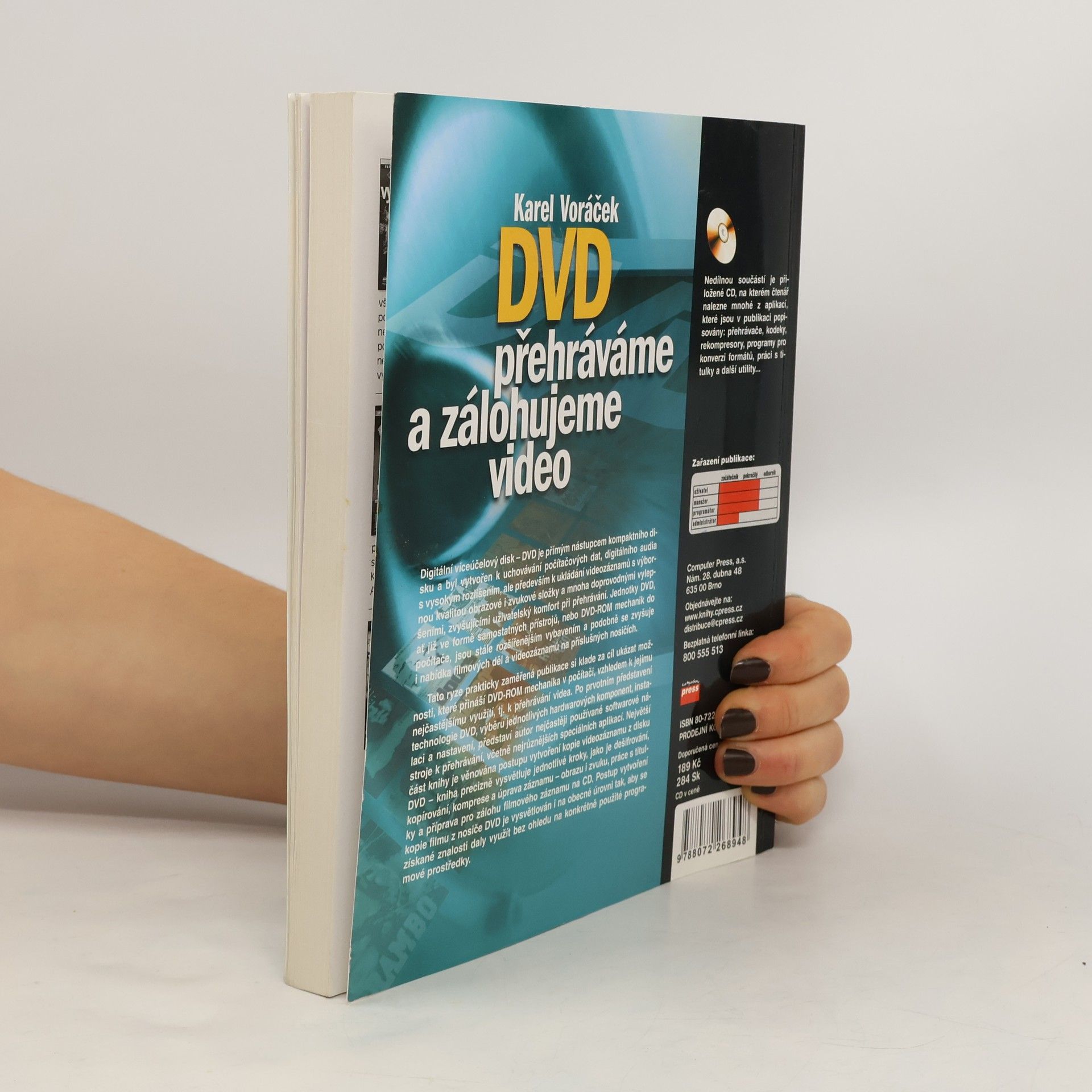 Tato ryze prakticky zaměřená publikace si klade za cíl ukázat možnosti, které přináší DVD-ROM mechanika v počítači, vzhledem k jejímu nejčastějšímu využití, tj. k přehrávání videa. Po prvotním představení technologie DVD, výběru jednotlivých hardwarových komponent, instalaci a nastavení, představí autor nejčastěji používané softwarové nástroje k přehrávání, včetně nejrůznějších speciálních aplikací. Největší část knihy je věnována postupu vytvoření kopie videozáznamu z disku DVD – kniha precizně vysvětluje jednotlivé kroky, jako je dešifrování, kopírování, komprese a úprava záznamu – obrazu i zvuku, práce s titulky, příprava pro zálohu filmového záznamu na CD. Postup vytvoření kopie filmu z nosiče DVD je vysvětlován i na obecné úrovni tak, aby se získané znalosti daly využít bez ohledu na konkrétně použité programové prostředky. Nedílnou součástí je přiložené CD, na kterém čtenář nalezne mnohé z aplikací, které jsou v publikaci popisovány. PC a DVD mechanika – instalace a nastavení Přehrávání záznamů, nejznámější aplikace Kopírování, dešifrování, úpravy videozáznamu Rady, tipy a doporučení při vytváření zálohy filmu a mnoho dalšího…