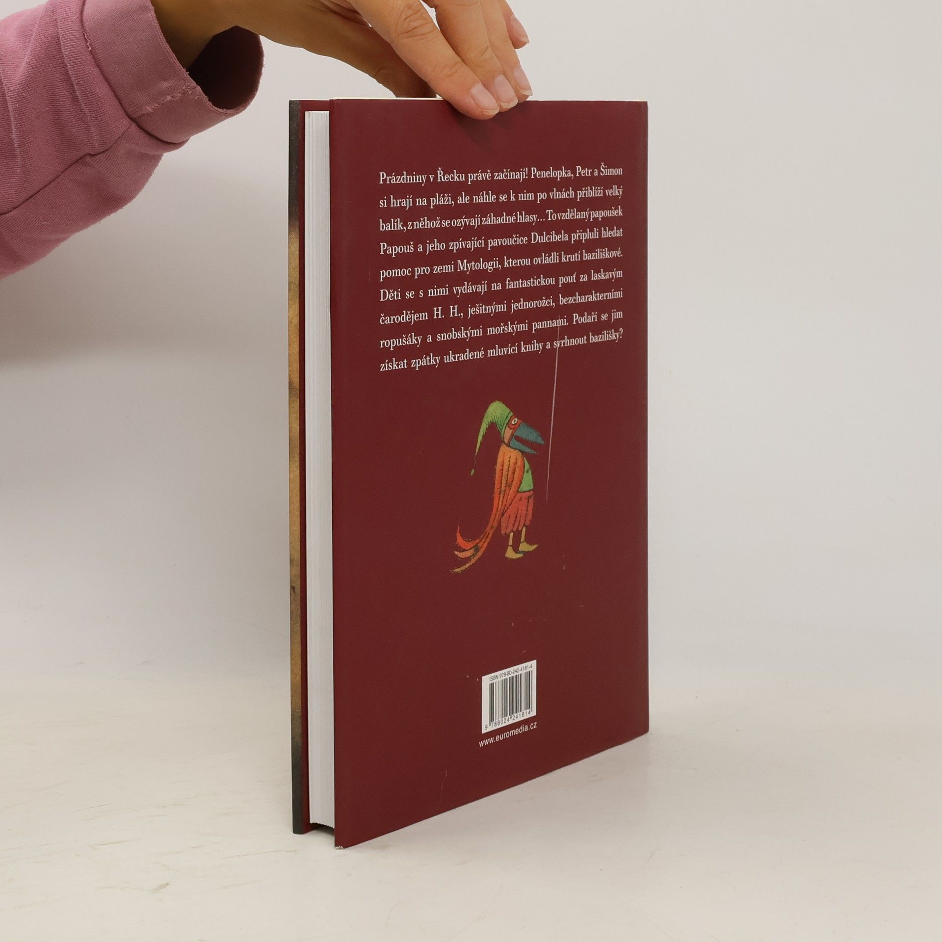 Prázdniny v Řecku právě začínají! Penelopka, Petr a Šimon si hrají na pláži, ale náhle se k nim po vlnách přiblíží velký balík, z něhož se ozývají záhadné hlasy... To vzdělaný papoušek Papouš a jeho zpívající pavoučice Dulcibela připluli hledat pomoc pro zemi Mytologii, kterou ovládli krutí baziliškové. Děti se s nimi vydávají na fantastickou pouť za laskavým čarodějem H. H., ješitnými jednorožci, bezcharakterními ropušáky a snobskými mořskými pannami. Podaří se jim získat zpátky ukradené mluvící knihy a svrhnout bazilišky? Půvabný pohádkový příběh pro děti z pera autora oblíbených příběhů o zvířatech (O mé rodině a jiné zvířeně, Chytněte mi guerézu, Ptáci, zvířata a moji příbuzní).