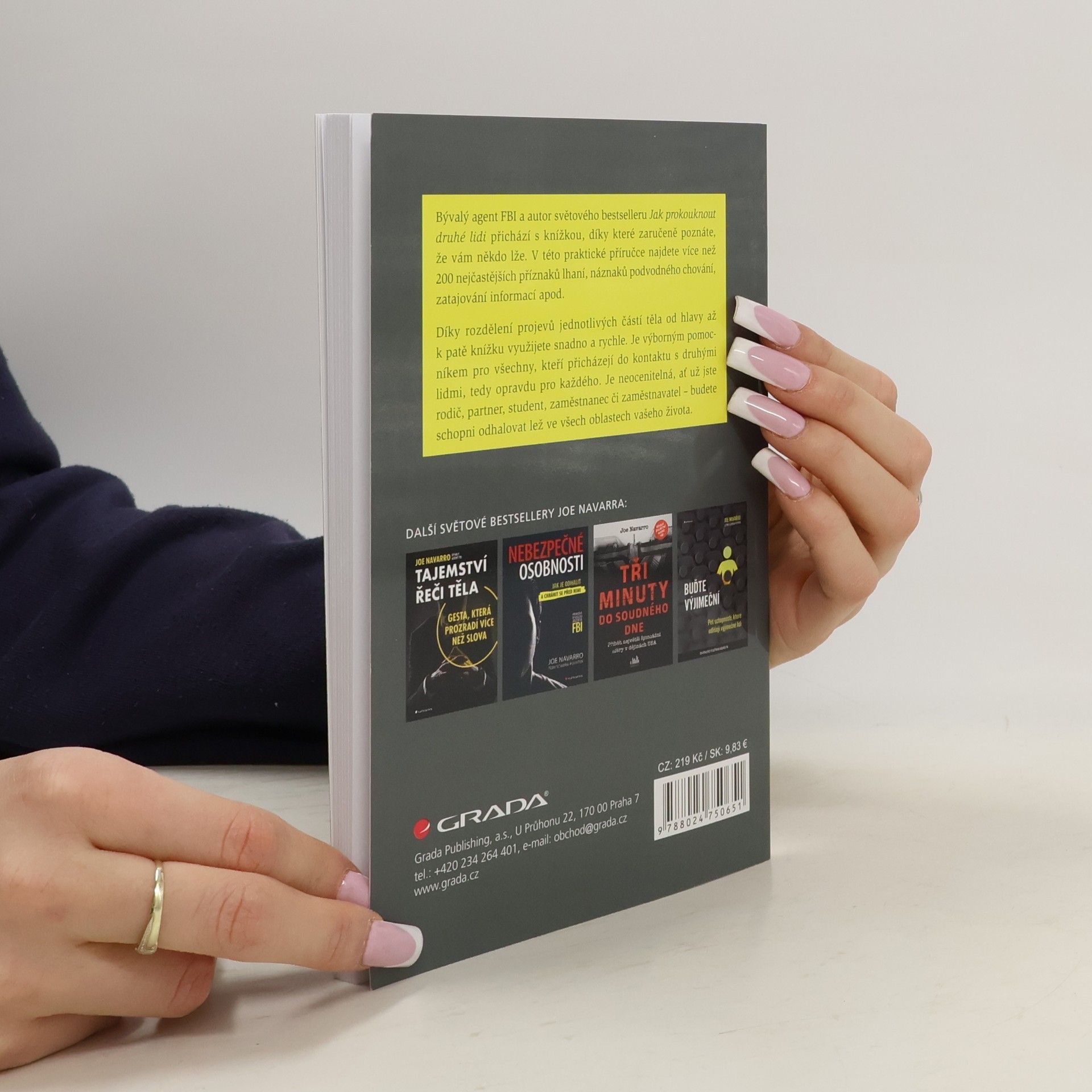 Příručka bývalého agenta FBI. Bývalý expert FBI a autor světového bestselleru Jak prokouknout druhé lidi přichází s knížkou, díky které zaručeně poznáte, že vám někdo lže. V této praktické příručce najdete více než 200 nejčastějších příznaků lhaní, projevů podvodného chování, zatajování informací apod. Díky rozdělení projevů jednotlivých částí těla od hlavy až k patě knížku využijete snadno a rychle. Je výborným pomocníkem pro všechny, kteří přicházejí do kontaktu s druhými lidmi, tedy opravdu pro každého. Je neocenitelná, ať už jste rodič, partner, student, zaměstnanec či zaměstnavatel – budete schopni odhalovat lež ve všech oblastech vašeho života.