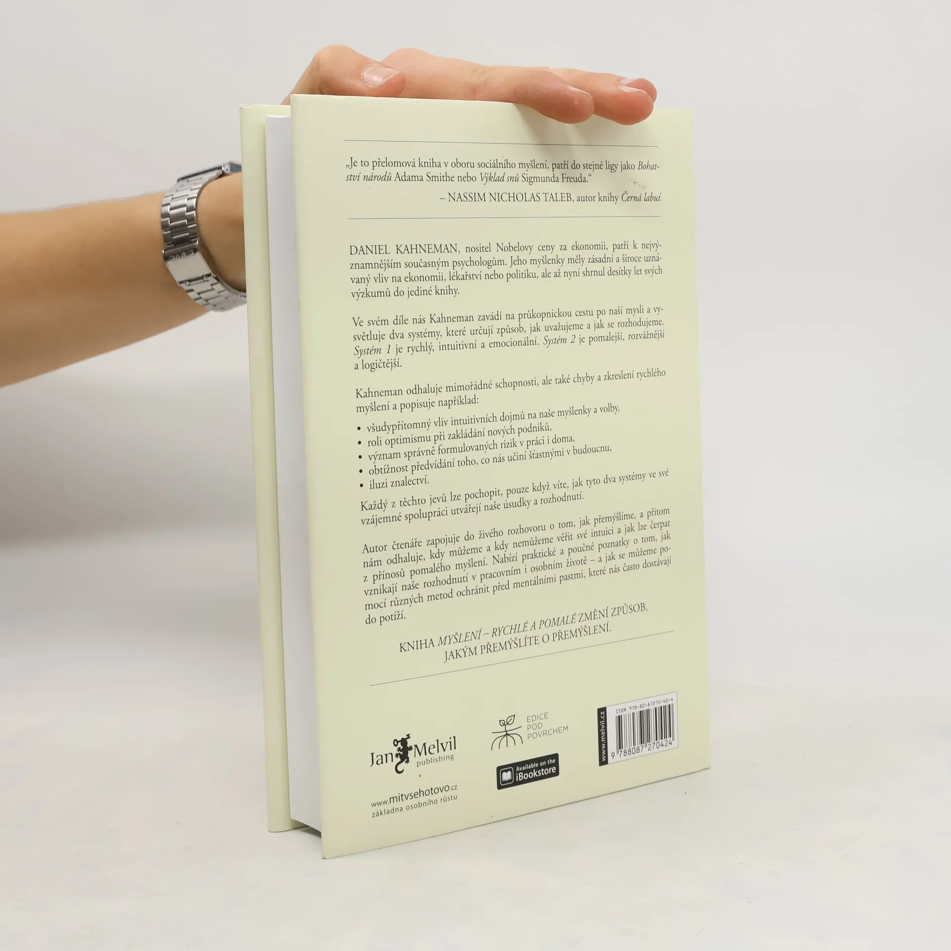 Daniel Kahneman, psycholog, držitel Nobelovy ceny za ekonomii, nás v průlomové práci, označované Nassimem Talebem za stejně významné dílo, jakým byl kdysi Freudův „Výklad snů“, seznamuje se dvěma systémy, které řídí to, jak přemýšlíme a jak se rozhodujeme. Systém 1 je rychlý, intuitivní a emocionální. Systém 2 je pomalý, váhavý a logický. Poutavý průvodce myslí nás ve čtivé knize vtahuje do dialogu o tom, jak přemýšlíme, a přitom odhaluje, v kterých situacích můžeme a kdy naopak nesmíme věřit své intuici (Systém 1) a také kdy a jak čerpat z přínosu pomalého myšlení (Systém 2). Nabízí praktické i poučné poznatky o tom, jak vznikají naše rozhodnutí v pracovním i osobním životě – a hlavně návod na to, jak se vyvarovat chyb.