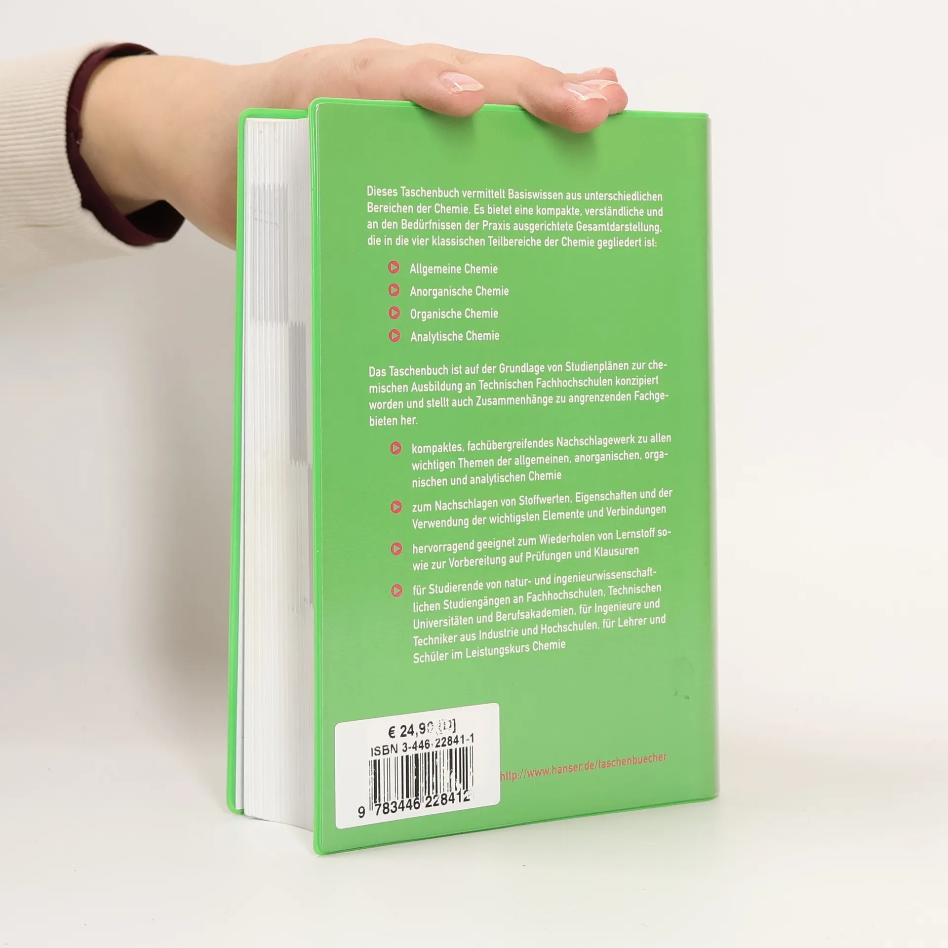 Die Chemie ist eine Disziplin der Naturwissenschaften, die zum Verständnis der Naturvorgänge im weitesten Sinne und der daraus abgeleiteten industriell genutzten Prozesse sehr viel beizutragen hat. "Das Taschenbuch der Chemie" vermittelt Basiswissen und stellt Zusammenhänge zu angrenzenden Fachgebieten her. Neben der allgemeinen Chemie und den Grundlagen der anorganischen und organischen Chemie enthält es in der neu bearbeiteten 3. Auflage ein umfangreiches Kapitel über Analytische Chemie (Qualitative und quantitative Analyse, chromatographische, spektroskopische und elektrochemische Methoden). Die Kapitel zur Chemischen Technologie werden jetzt im "Taschenbuch der Verfahrenstechnik" behandelt. "Was man in der Schule nicht und zu Hause einen Tag vor der Klausur sowieso nicht versteht, findet man hier (vielleicht zum ersten Mal überhaupt) gegliedert, verständlich und kompakt enträtselt." Ein begeisterter Leser