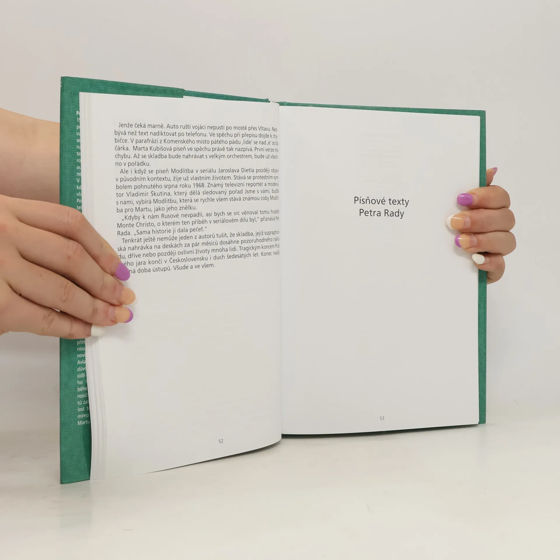 Autobiografická kniha, doplněná autentickými fotografiemi, přibližuje dramatické životní osudy jednoho z nejznámějších českých textařů. Petr Rada se proslavil šedesátými lety, kdy české písničky vyjadřovaly pocity celých generací. V poezii všedního dne se zračil nový pohled na svět a touha po změnách. Autoři knihy přinášejí dosud nepublikované vzpomínky na neopakovatelnou dobu v české kultuře a zákulisí pražských scén, jako byly Paraván, Semafor či Rokoko. Rada psal pro významné umělce jako Karel Gott, Hana Hegerová, Waldemar Matuška a další. Jeho spolupráce s pianisty, jako byl Petr Hapka, přinesla skladby, které se staly ikonickými, například Píseň o malíři a Kázání v kapli Betlémské. Píseň Modlitba pro Martu se stala symbolem národního vzdoru v roce 1968 a zásadně ovlivnila Radu, který se po letech nátlaku rozhodl emigrovat do Austrálie. Po návratu do Prahy v roce 1990 pokračoval v tvorbě, psal pro různé umělce a jeho dílo si zachovalo kvalitu a rozmanitost. Kniha přináší svědectví o osobnostech, které formovaly českou populární hudbu, a je doplněna barevnými i černobílými fotografiemi.
