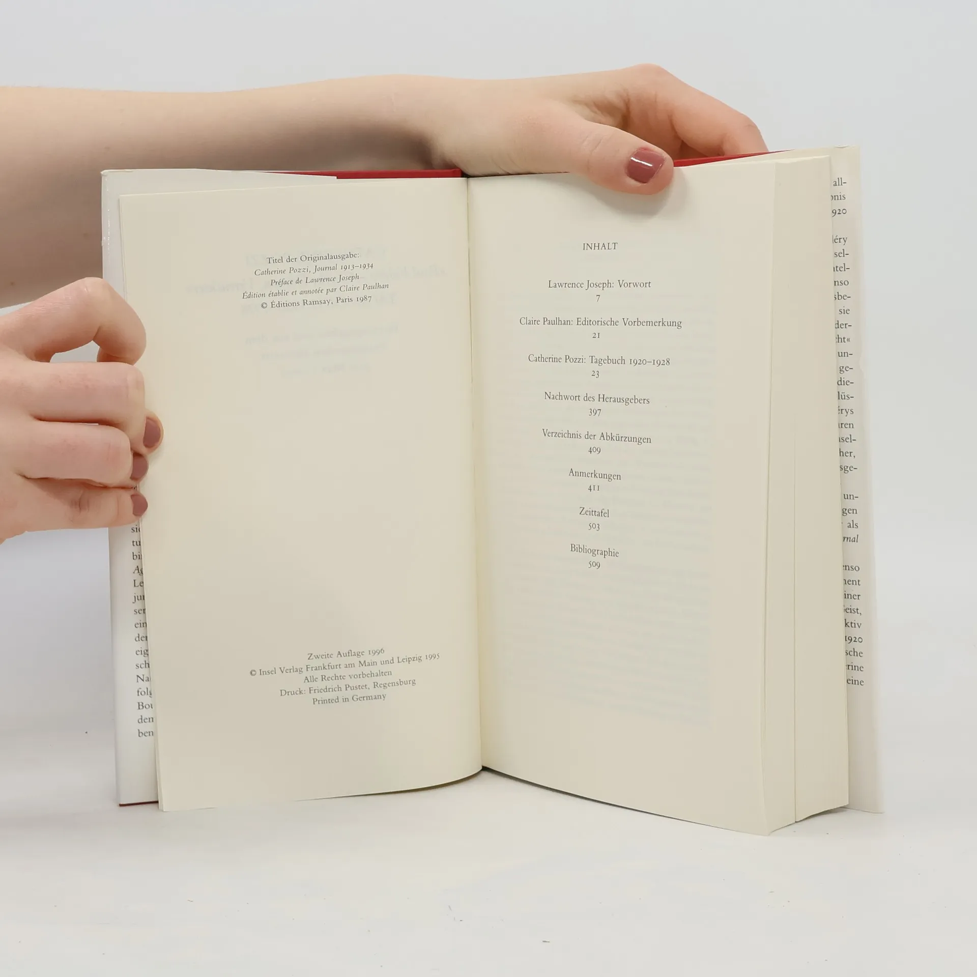 „Im Juni 1920 lernt Catherine Pozzi Paul Valéry kennen. Er ist seit zwanzig Jahren verheiratet und hat drei Kinder. Es beginnen acht Jahre einer notgedrungen heimlichen, aber jeden Tag erneuerten und wieder in Frage gestellten Beziehung; acht Jahre der abgenötigten und unhaltbaren Versprechen; Pozzi und Valéry erleiden »den Tod und die Leidenschaft« ihrer Liebe; aber auch acht Jahre der gemeinsamen Arbeit, Lektüre und Forschung; acht Jahre eines intellektuellen und philosophischen Zwiegesprächs unter Gleichen.“